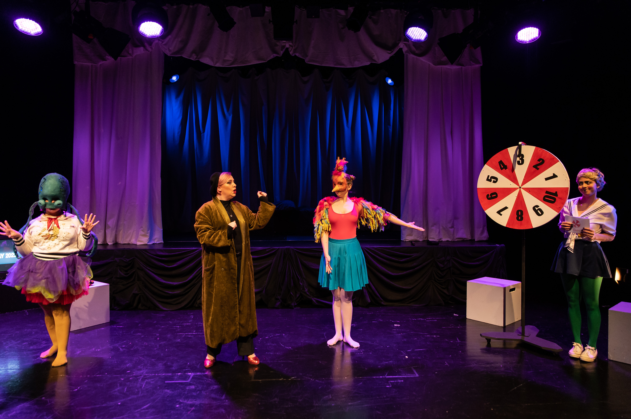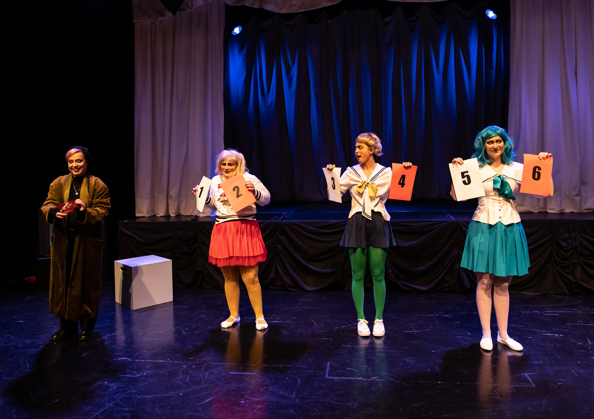 Cabaret and audience participation. What I personally understand as cabaret aesthetic and what I think can be seen in the show is, firstly, the exclusion of the fourth wall and the inclusion of active audience participation, and, secondly, ‘variety show’ or ‘collection of vignettes’ sort of structure. Both things were already written into the play itself. In the second chapter, I briefly described themes of each month’s episode, however, I did not mention that every episode either had a musical number, or a game with the audience (sometimes both). There were two main reasons for inclusion of those elements both in the play, and in the production: element of entertainment and fun, the importance of which I tried to justify earlier in this paper; and the overall inherently queer nature of cabaret as a performance practice. By writing ‘inherently queer nature’, I mean the variety of genres and certain freedom of expression that cabaret provides. I personally believe that cabaret is a performative form closest to representing diversity. It is also a more accessible form, both for performers and for audiences, which often leads to an enhanced feeling of inclusion. Moreover, it is so happened that historically, a typical queer show has often been a variety\cabaret show (or vice versa), since it gives performers a chance to use their personal skills – for example, in music, dance, or impersonation – to express their gender and/or sexual identity freely. There is also, of course, a figure of MC, Master of Ceremonies, most common for cabaret performances, who usually serves as a narrational thread of the evening – which is also a big part of both the play and the production of Neptune.