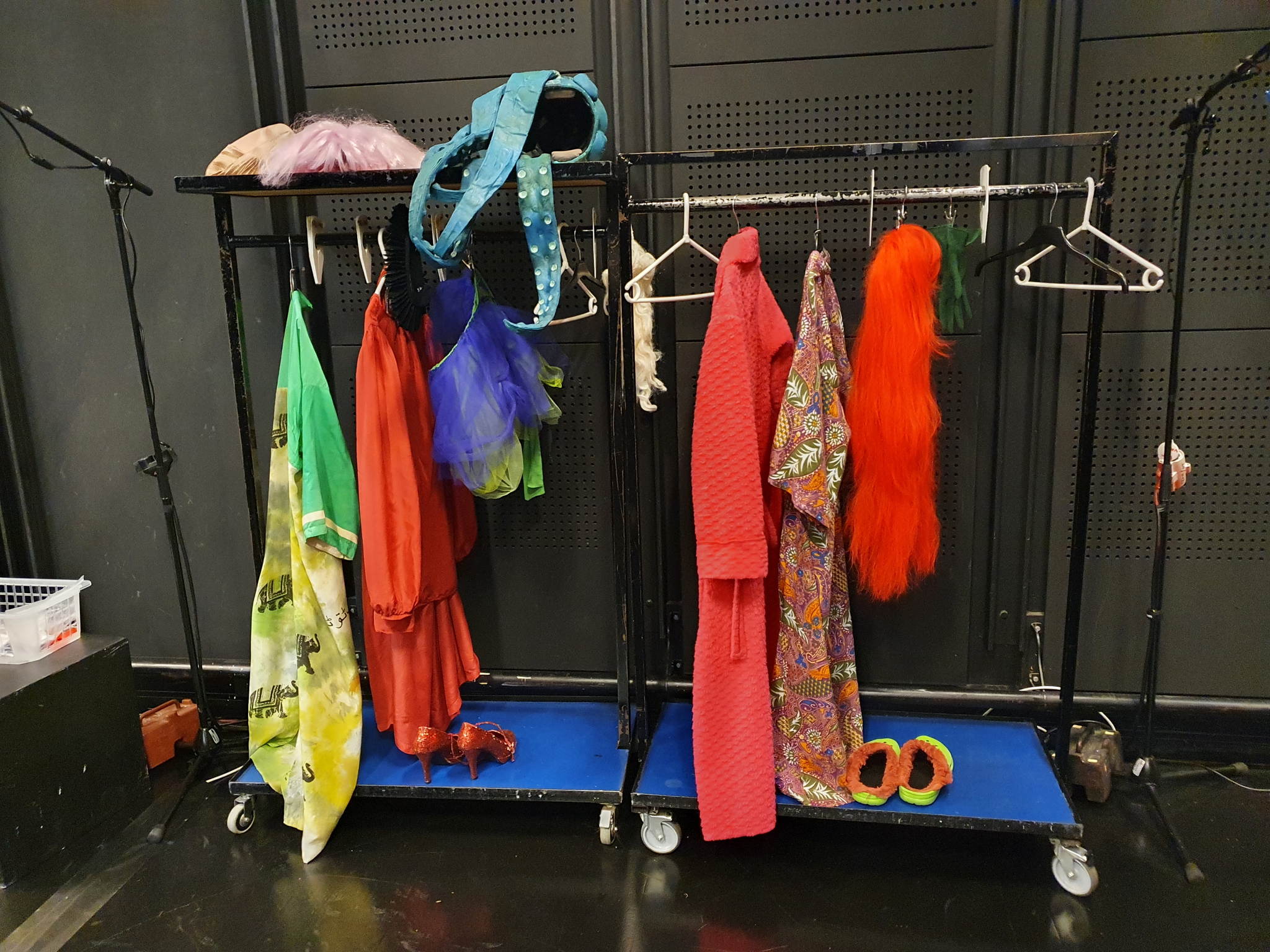 Drag and camp. Drag and camp are, without a doubt, two of the most prominent elements of queer performance culture. Drag is most often understood as a performance of gender: where drag kings and drag queens present exaggerated versions of male and female traits respectively. However, drag does not always have to deal with gender performativity. In Polari language, which is a form of secret slang that was commonly used in British gay subculture in the 20th century, ‘drag’, can indeed mean ‘a man dressing in women’s clothes’, but also more generally, just ‘dressing up’ (Tremeer 2021). So, it can also be used in reference to using costumes as part of identity performance, whatever that identity might be. Neptune production uses drag mainly in this sense – there are numerous costume and character changes for actors playing fictional parts. And thinking back to the original idea of all additional characters being masks or personas for two main characters, the drag element becomes apparent.