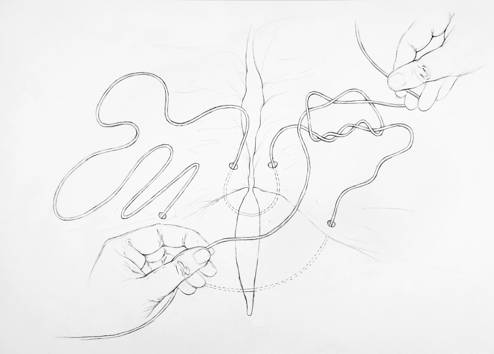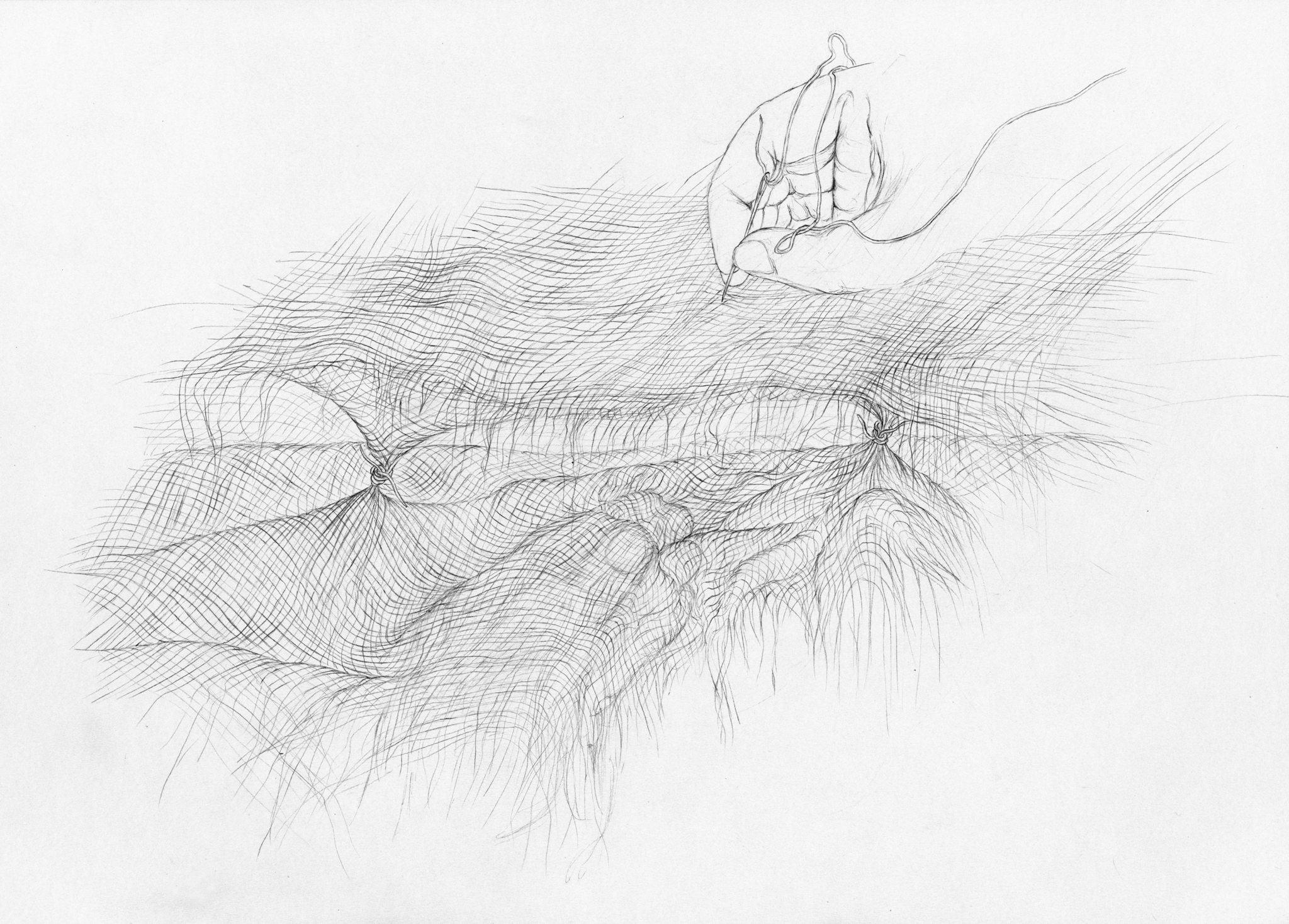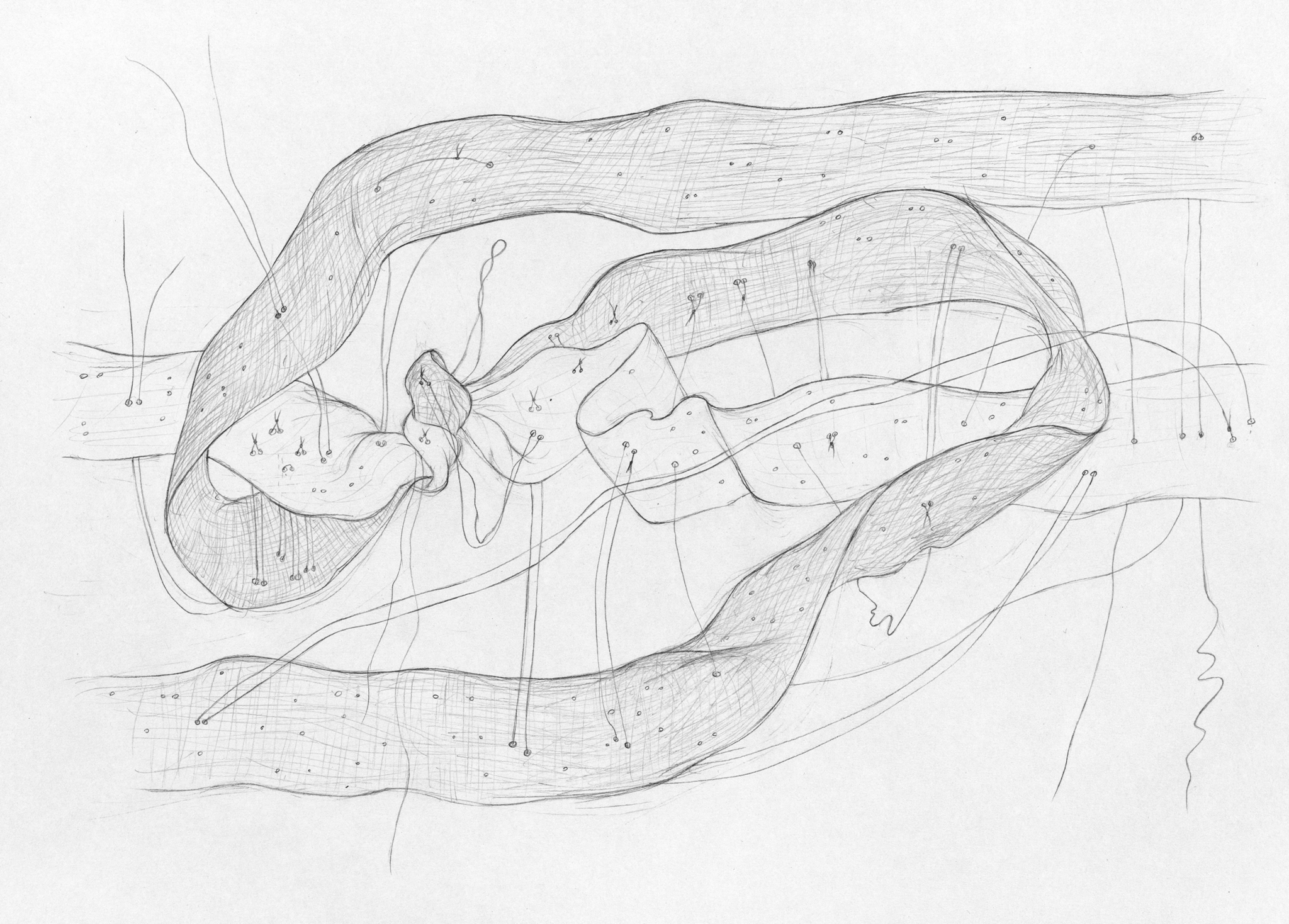 Inspired by these topological structures,7 I transform these models for use in my artistic context by means of a pencil and textile material.8 I take the models into my hands and utilize the flexibility of textiles. By doing so, I am able to turn relationships inside out, shortcut them, knot them, crosslink, contort, intertwine and dissolve them. It is an attempt to create an artistic tool not only for discovering relationships but also of reformulating questions in unexpected ways, breaking up familiar linkages and following the thread of surprising figurations.