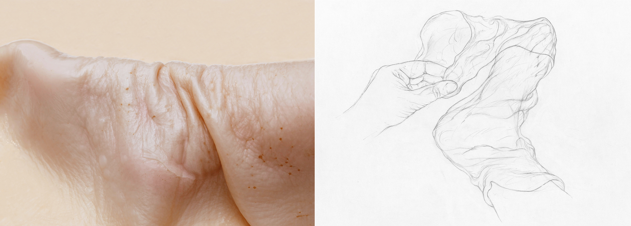 Fig. nr. 7: Barbara Graf, Drawing no. 174, graphite pencil on paper, 29.7 x 42 cm, 2009. Photograph Touching the Sole of the Foot, 2017. Drawing no. 196, graphite pencil on paper, 29.7 x 42 cm, 2018. © Barbara Graf