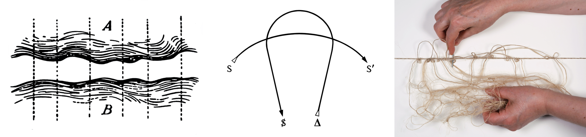 Fig. nr. 4: Ferdinand de Saussure, Cours de linguistique générale (1916), Paris: Payot & Rivages 1995, p. 156. Jacques Lacan, Schriften II, Weinheim/Berlin: Quadriga 1991, p. 179. (images slightly edited by Barbara Graf). Textile Topology by Barbara Graf. © Barbara Graf