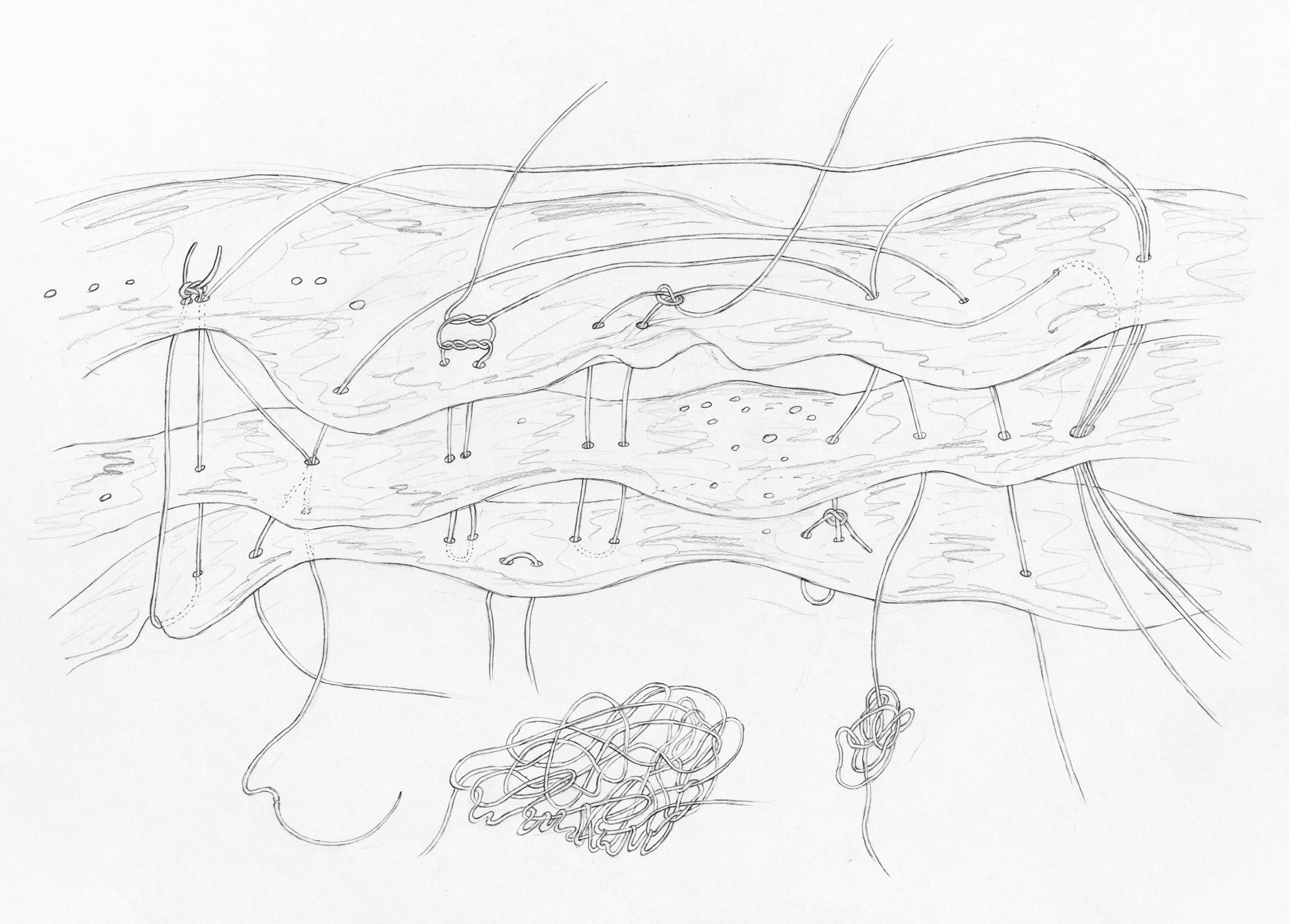 Drawing a bodily sensation can impact the sensation itself, as the process of drawing relates not only to the current physical experience but also to remembering experiences (conscious and unconscious memory),14 and the affective response to the drawing interacts with the corporeal perception. The retroactivity of the suture changes the past and the present, but also influences future experiences. The ambiguity of a graphic scheme can be productive since it also allows seemingly contrary interpretations. For example, an informal laying thread (Fig. nr. 9) can be understood as one left from unstitching a seam (a context of meaning that has lost the importance but still leaves traces) or not yet used (a potential intension). Or a thread that is not tightly knotted can be considered a knot that is loosening or still being tightened. The suturing of images can also proceed via visually similar phenomena, and the meaning is sliding underneath is generated differently and not via the same cause. For instance, the drape on the foot with the biological membrane (SCOBY)15 (Fig. nr. 1) embodies the irritating feeling of whether a disturbing body sensation belongs to one’s own body or is alien to it. This foreign living skin has an appearance similar to human skin. The real sensation of touch of the slippery membrane has little in common with the sensation of touch caused by the nerve disorder, in contrast to the drawn foot envelope (Fig. nr. 1). Here, it embodies exactly the physical sensation of a covering layer, even if it is an illusion. Thus, the connection is not through the real or illusory sensation of touch but through the similarity of the images and through the inverted thematization of the body perceived as alien, but which is one’s own.