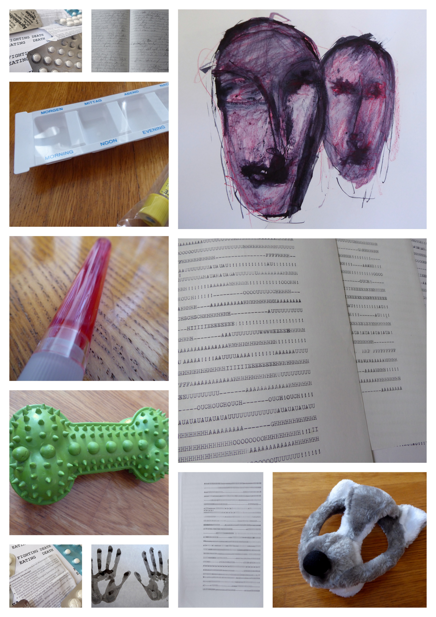 An important aspect of the EEE is the involvement of objects (medical aids, masks, souvenirs) and images (photographs, drawings) linked to the personal history of illness. These artefacts (see Fig. 1) are not only used to instigate and guide the narrative along certain motives but also to elicit different self aspects and voices: Grabbing the notebook (i. e., the diary) reinforces the aspect of self-reflexivity, putting on the wolf mask stresses the transformative aspect of the illness; the pill box produces the voice of the patient, the chew bone the animal voice within, and so forth.