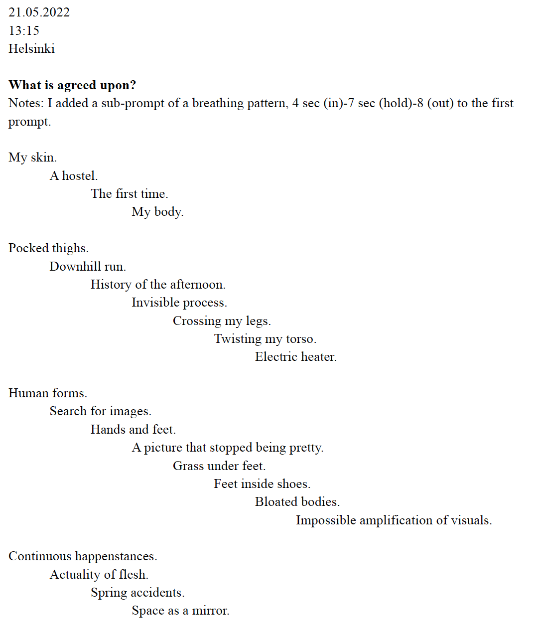 In preparation and as a way of tuning in together prior coming to Vaasa, on Saturday 21 May 2022 at noon GMT we five writers engaged in a shared experiment in collective writing in public space. The writers/artistic researchers make written observations of a public site for a time-bound period, collaborating in a shared action, though geographically apart [in Berlin, Sheffield, Berlin, Helsinki, Vaasa]. We began with three 10-minute warm-ups with different foci of attention – e.g. surfaces, surfacing. From there we continued to write with attention on 'as far as the eye can see'.