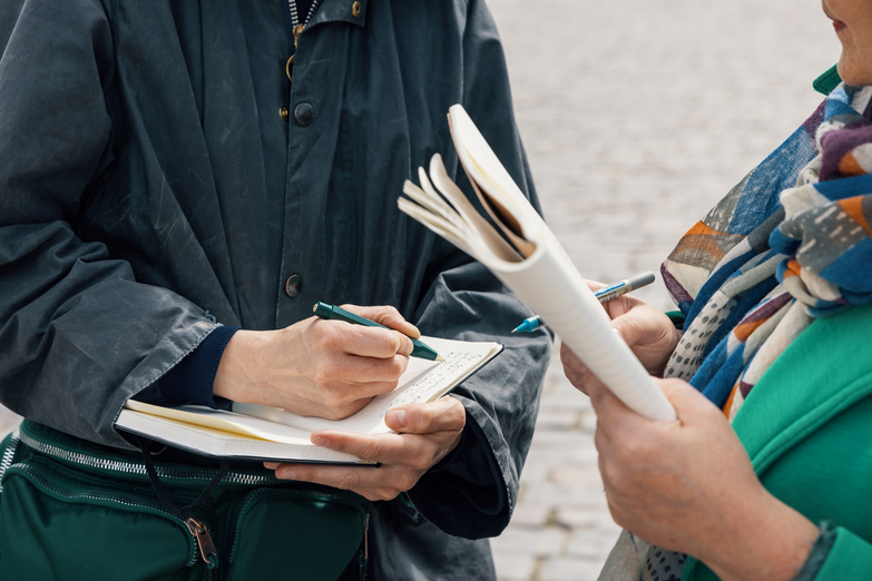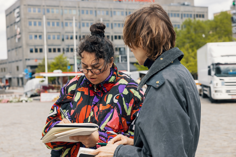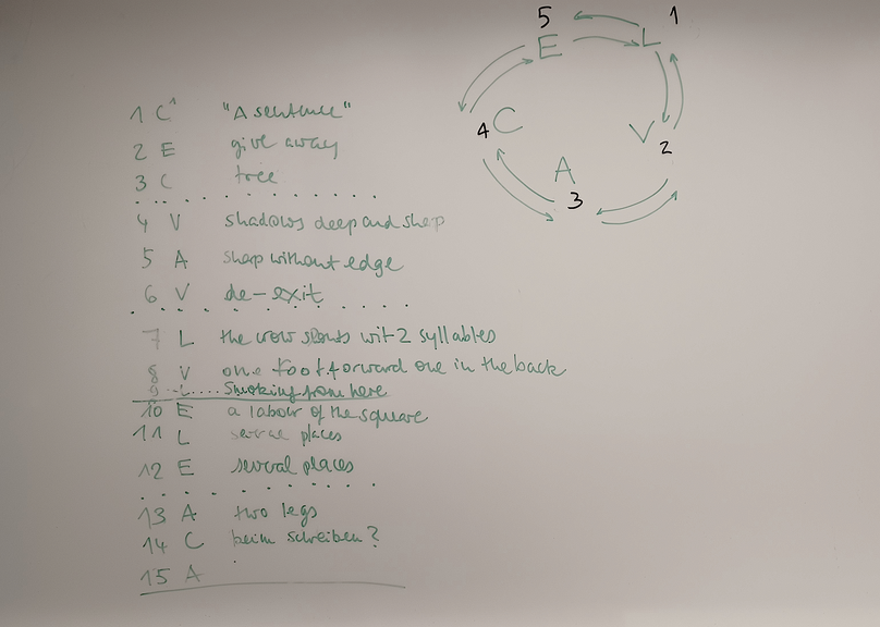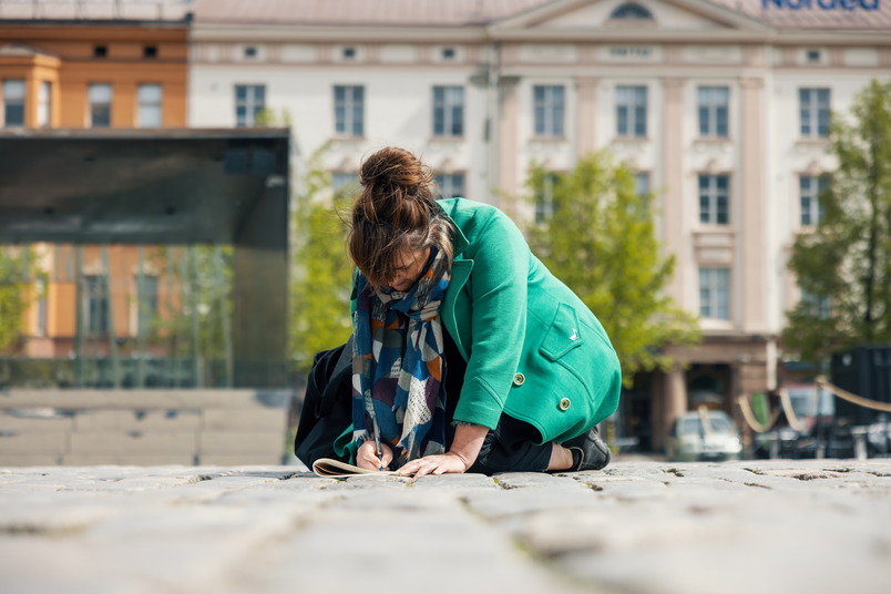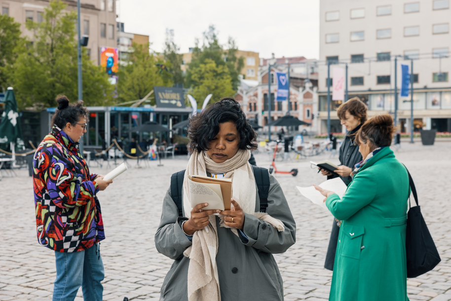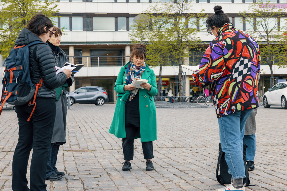 Below are the various 'scores' or series of prompts that were used for structuring an experiment in collective writing in public space, for activating a process of timed writing/reading together in Market Square, Vaasa, in conjunction with an agreed pattern of movement. The 'choreography' or movement pattern of this practice, involved gradually moving from the centre of the square to the periphery/perimeter and back towards the centre. Specific positions/locations could be moved or changed during the practices. To the right is documentation of this exploration, alongside the texts generated through engaging with each 'score' or 'prompt'