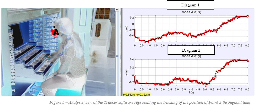 With the goal of acquiring additional information on the movements I make whilst playing, the video of the performance was analysed using the “Tracker” software. This is a video analysis and modelling tool built on the Open Source Physics (OSP) Java framework which allows, amongst others, for manual and automated object tracking with position, velocity and acceleration overlays and data.