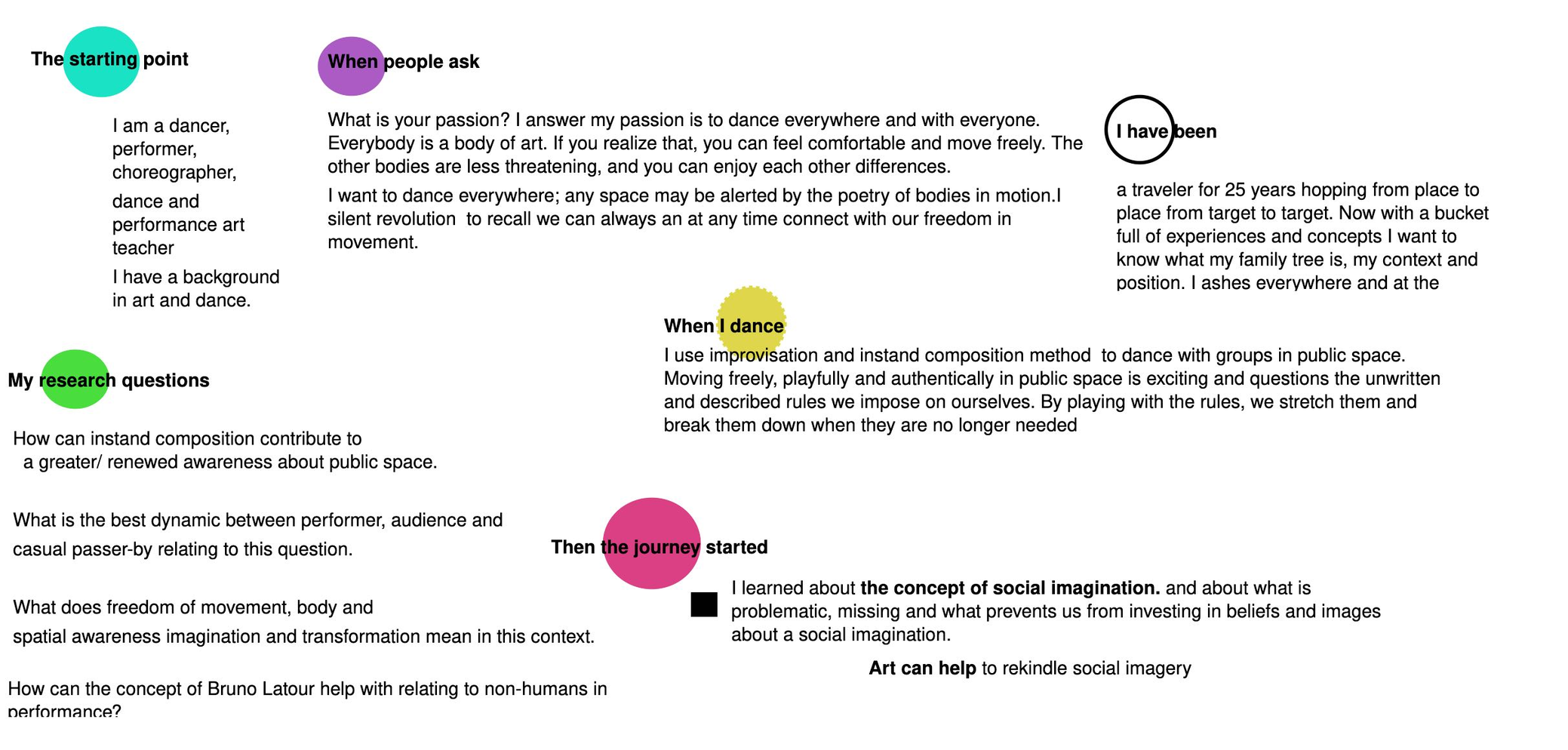 Dansimprovisation structures, instant composition, danstheatre , mime and opera buffo.