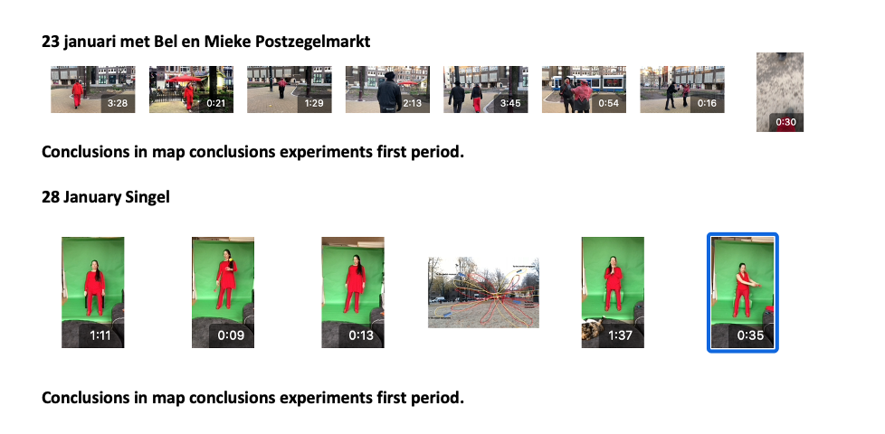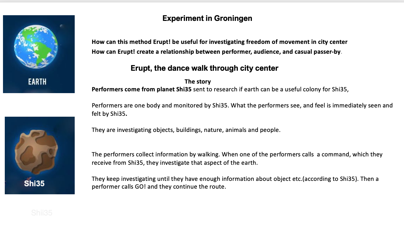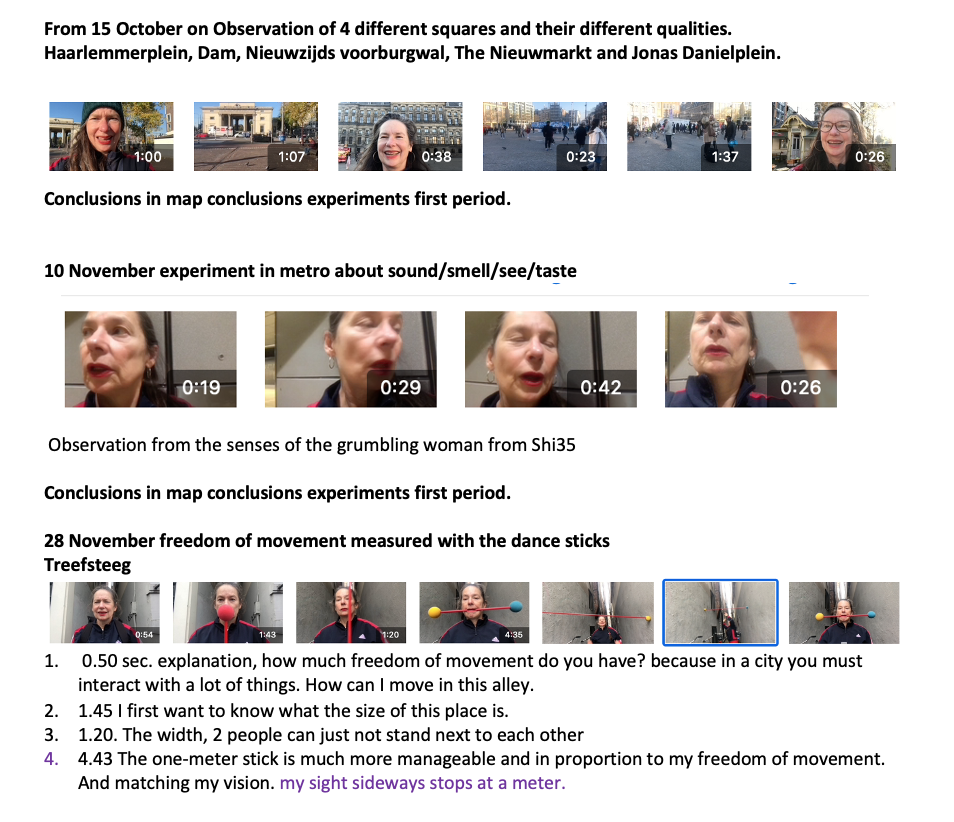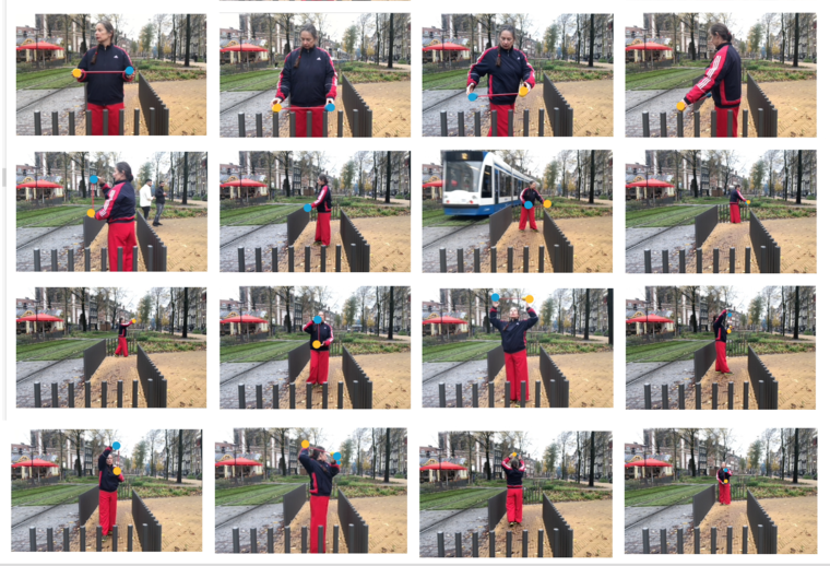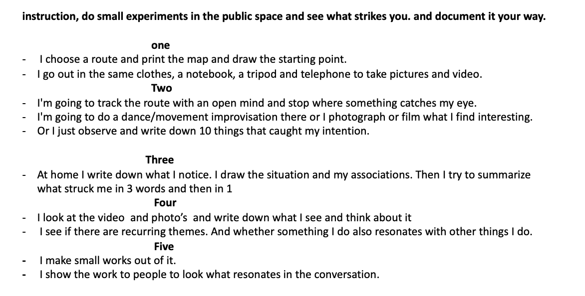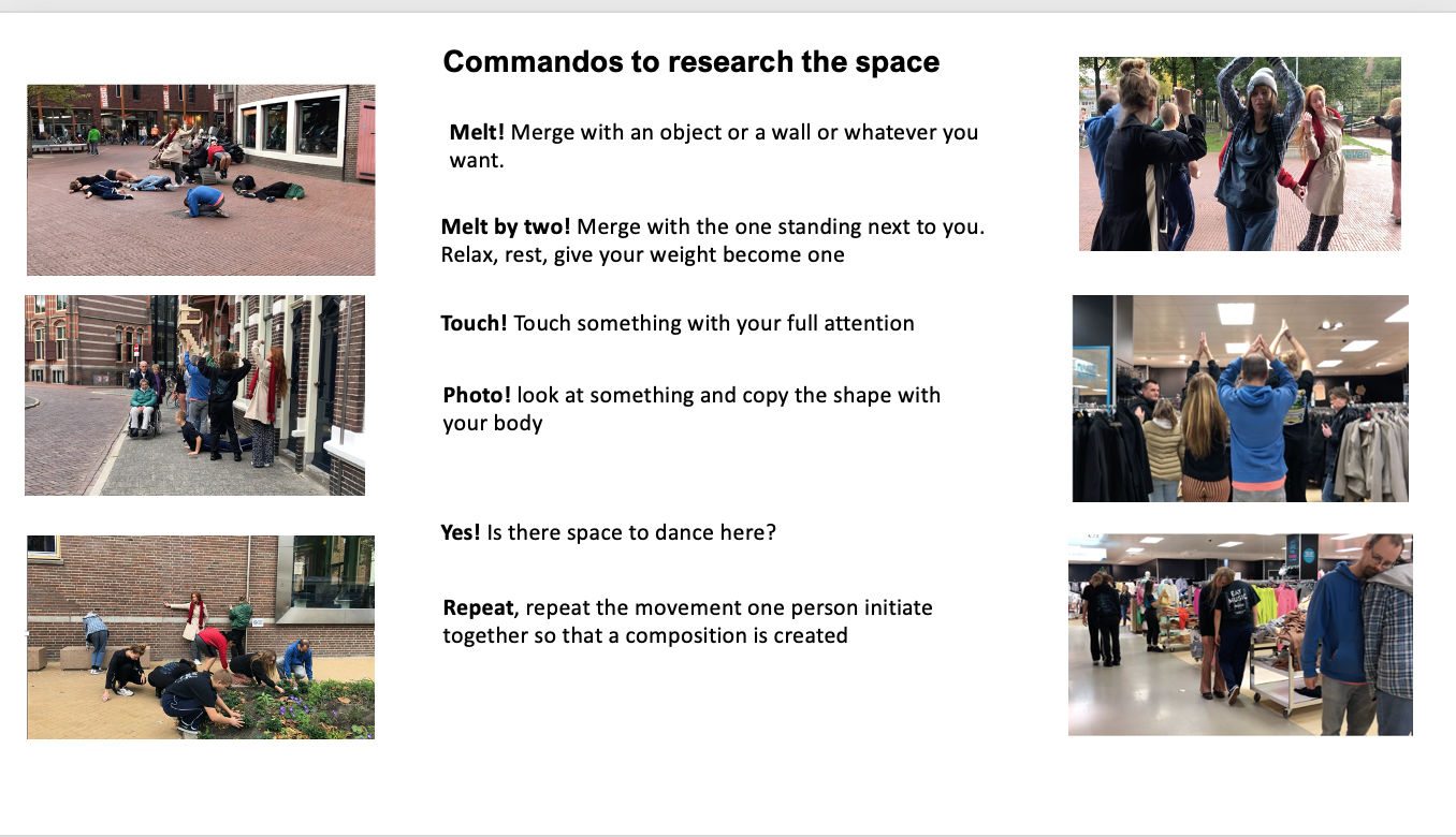 The experiment yielded a lot of different information. To continue on this, it is interesting to use the commands one by one instead of 9 at the same time. Watching the video with the assignment to do that 4x from the 4-body theory. worked very well. This time it was mainly about the experience (both performing and viewing the video) and next time the reflection may receive more attention. It also turned out that more space and attention could be given to the performance for exploring the possibilities for interaction with the audience/passers-by. The cooperation and playfulness are powerful elements that enhance the experience of freedom of movement. And not considering the role of the bypassers created tension among the performers. and needs more attetion next time.