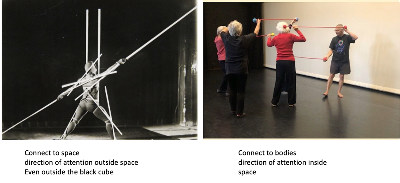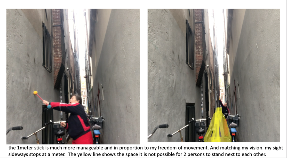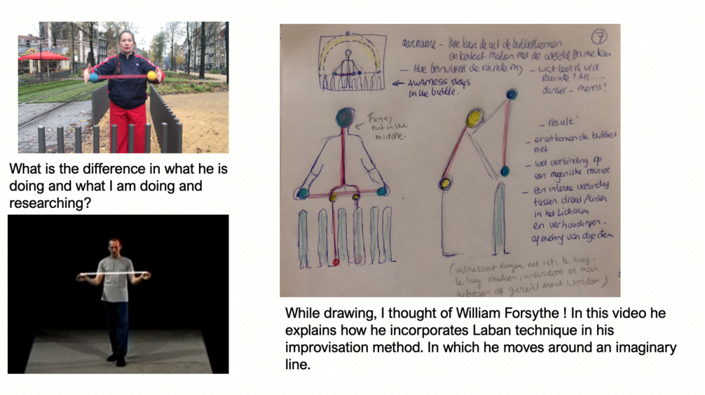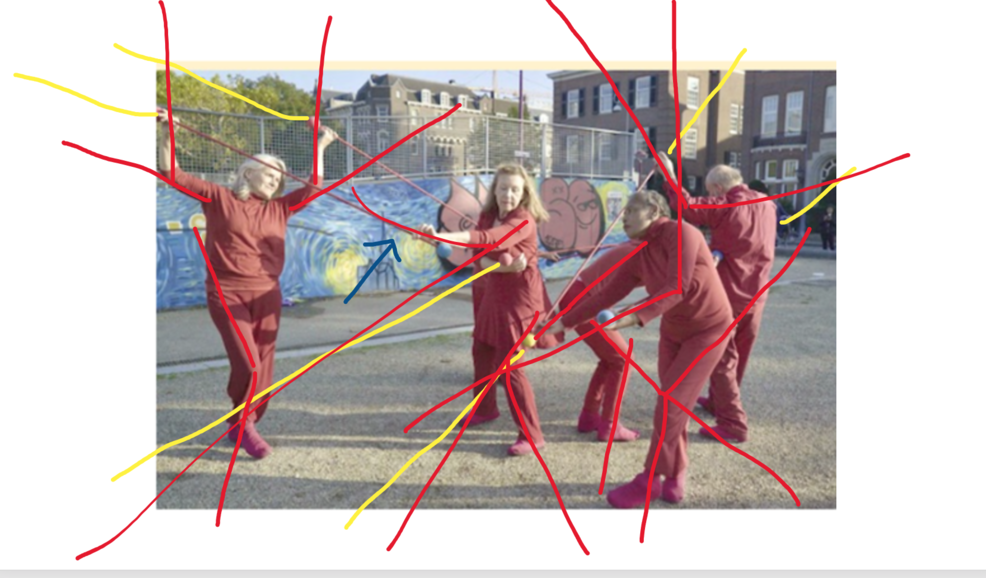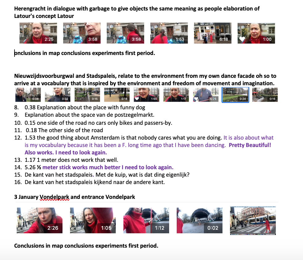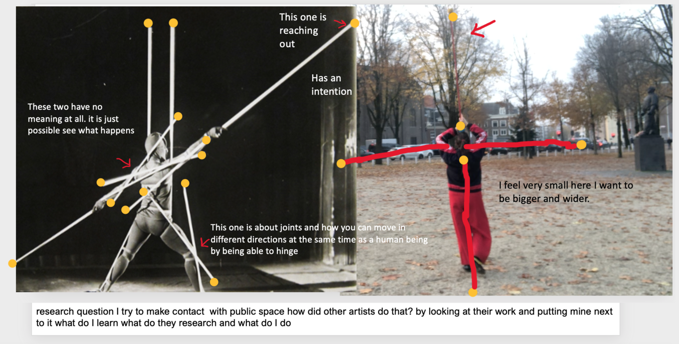 The experiment yielded a lot of different information. To continue on this, it is interesting to use the commands one by one instead of 9 at the same time. Watching the video with the assignment to do that 4x from the 4-body theory. worked very well. This time it was mainly about the experience (both performing and viewing the video) and next time the reflection may receive more attention. It also turned out that more space and attention could be given to the performance for exploring the possibilities for interaction with the audience/passers-by. The cooperation and playfulness are powerful elements that enhance the experience of freedom of movement. And not considering the role of the bypassers created tension among the performers. and needs more attetion next time.