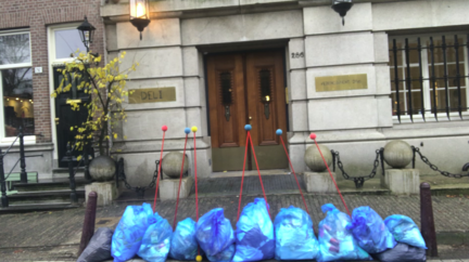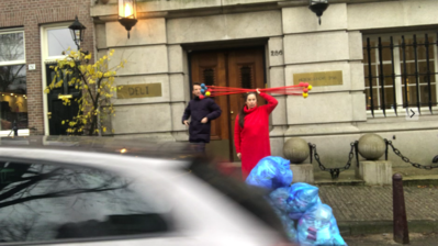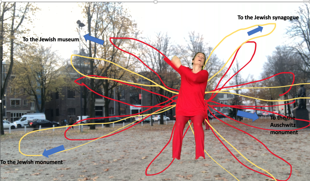 I wanted to connect the different buildings in the area bij movement . Each building has to do with Judaism and the terrible Jewish tragedy of the second world war. On this square the Jews were gathered to be put on the train to the camps. This was a kind of remembrance ritual.