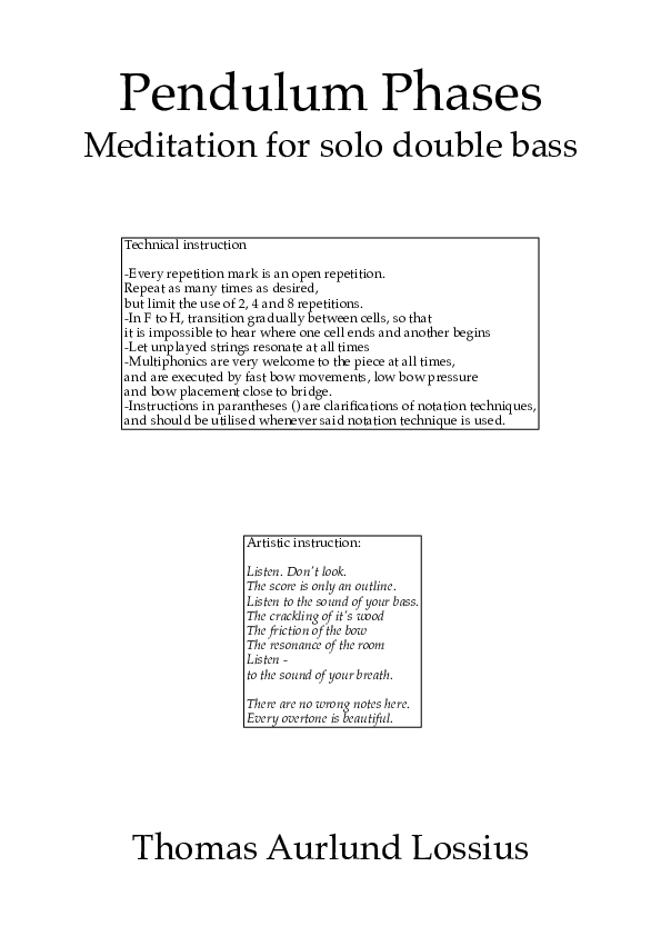 Pendulum Phases is a post-minimalist framework for bass improvisation. It is composed of repetitive patterns built from the overtones of open strings. Overtones - the music predating man, permeating every natural sound, providing the building blocks of all music theory. Overtones - being generated from the pendulum movements of the string, ever moving in and out of phase with its creator. The improvisation invites the audience to a state of contemplation and deep listening.