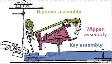 Three separate assemblies of the one-hundred different parts are involved in getting the force of the pianist's finger from the key to the string: the key assembly, the wippen assembly, and the hammer assembly. The key is basically a straight piece of wood that strikes the wippen assembly. The complex wippen assembly transfers the key's force to the hammer, "throwing" it towards the string. A remarkable feature of the piano mechanism is that, because the hammer is thrown by the wippen assembly, it is actually completely out of the pianist's control when it hits the string.