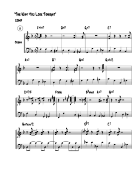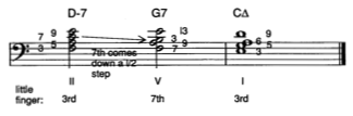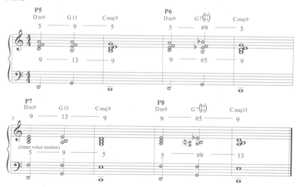 Another type of voicing piano chords with bass notes is to play shell voicings. The shell voicing is an indispensable basic structure that serves as the basis of building many jazz piano voicings. It became popular during the bebop era, used frequently by Thelonious Monk and Bud Powell.1 Shell voicings are played in the left hand and consist of either the root and the 3rd, or the root and the 7th. They are ideal to build upon with your right hand. With more modern pianists, like Bill Evans, Herbie Hancock or Chick Corea, the bass notes are less prominent. Still you can hear the 3rd and the 7th, with all the building blocks upon. A perfect example of how those voicings can be executed is displayed on your right, taken from Mark Levine’s The Jazz Piano Book.