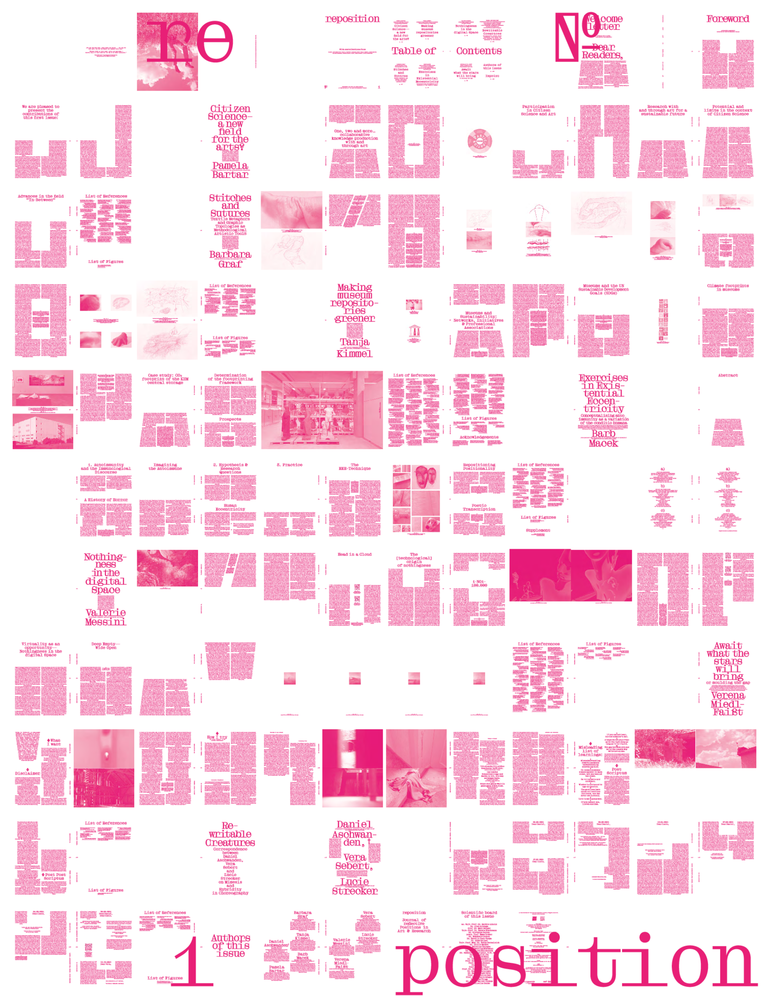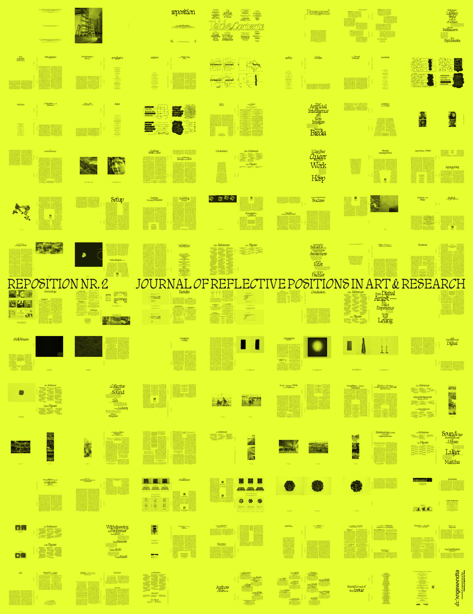 reposition Journal of reflective Positions in Art & Research - support project for research documentation at the University of Applied Arts Vienna Initiated by Alexander Damianisch, reposition brings together the wide variety of research at the University of Applied Arts Vienna, and reflects on an ongoing culture of editorial structures for research in Arts and Sciences. reposition collects positions from ongoing processes. It offers researchers of all disciplines and departments at the University of Applied Arts Vienna the opportunity to publish their work according to peer-review principles. Colleagues of any level and doctoral students in arts and sciences are invited to share their work. This series showcases their diverse approaches to project-oriented research work and presents current insights, captivating research processes, and ongoing projects from a deeply personal perspective that courageously unearth the work-in-progress.