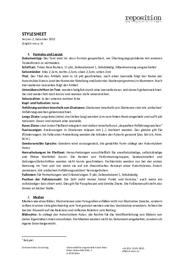 reposition Journal of reflective Positions in Art & Research - support project for research documentation at the University of Applied Arts Vienna Initiated by Alexander Damianisch, reposition brings together the wide variety of research at the University of Applied Arts Vienna, and reflects on an ongoing culture of editorial structures for research in Arts and Sciences. reposition collects positions from ongoing processes. It offers researchers of all disciplines and departments at the University of Applied Arts Vienna the opportunity to publish their work according to peer-review principles. Colleagues of any level and doctoral students in arts and sciences are invited to share their work. This series showcases their diverse approaches to project-oriented research work and presents current insights, captivating research processes, and ongoing projects from a deeply personal perspective that courageously unearth the work-in-progress.