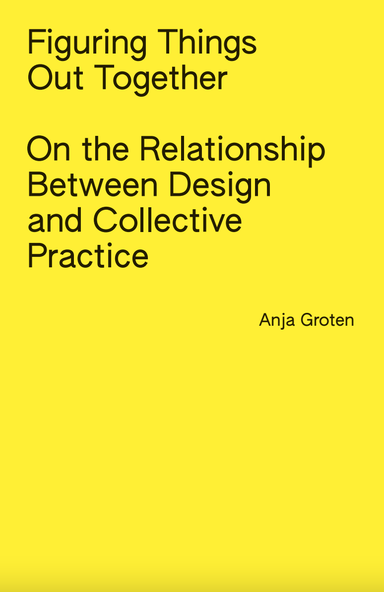 This dissertation of Anja Groten explores matters of collectivity, drawing from the experience of working with the Amsterdam-based collective Hackers & Designers (H&D). The main thesis of this research is that conventional design vocabularies are not capable of sufficiently expressing and accounting for collectivities‘ resistance to fixation and stabilization. Collective design as it is discussed here challenges notions of individual authorship, differentiations between disciplines, between product and process or between the user and maker. While collectives shape particular affiliations and commitments, design approaches and aesthetics, they also require perspectives on working and designing together that resist linearity, and a progress-based understanding of a design process. By means of several case studies, it is argued that the fragmentation of social and work relations is as much a characteristic of collective practice as the effort to sustain long-term relationships.Thus, collective practice is not fully deliberate, at least not in the same way as for instance ‘teamwork’, ‘the commons’, or ‘cooperativism’, are purposeful organizational frameworks for living, working or being together. Collective Collective design processes take part in and are a result of particular (often fragile) socio-economic, socio-technical conditions that pervade and shape the ways collectives function.