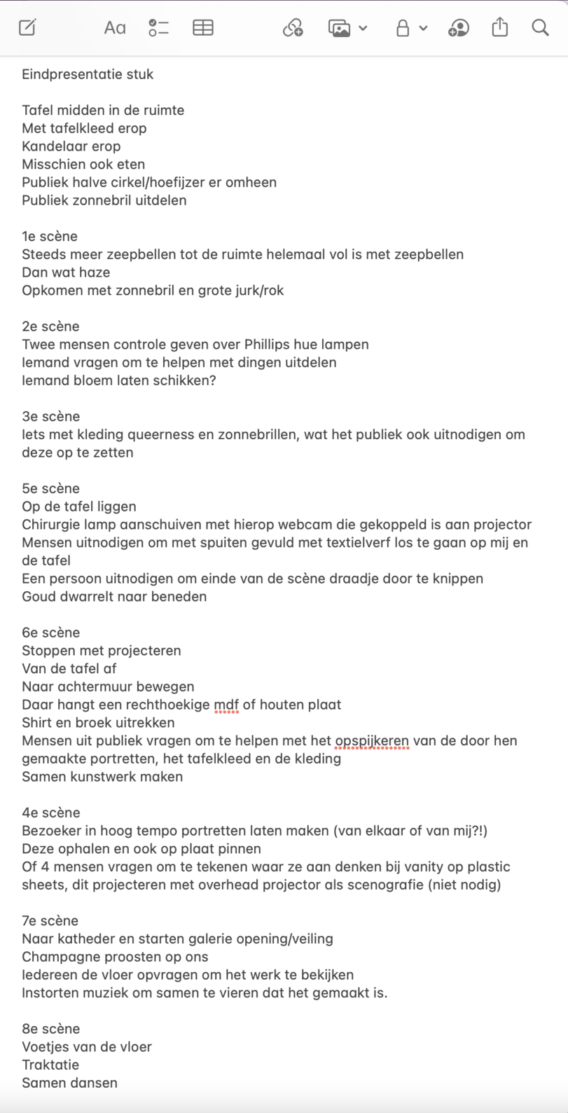 These are two screenshots of the first two iterations of the script for _i_C_O_N_i_C_. The first script was written in Dutch and the second in English. Every time I spent time in the studio the script evolved. After starting on the script I started ordering the props needed for the interventions, I got the costumes together, I chose the music and talked to production to see what is possible at the venue. These elements influenced the development of the participatory interventions. As did the theme vanity. I internalised the script and never wrote a final version. I did take notes on the way in which to introduce the interventions and how to tie them together. At the final stage of developing the interventions I invited people to a try out. Their experience of the piece and the feedback they provided helped finesse the interventions and the overall piece. A description of the most current version of the participatory interventions and the thoughts behind them can be found here.