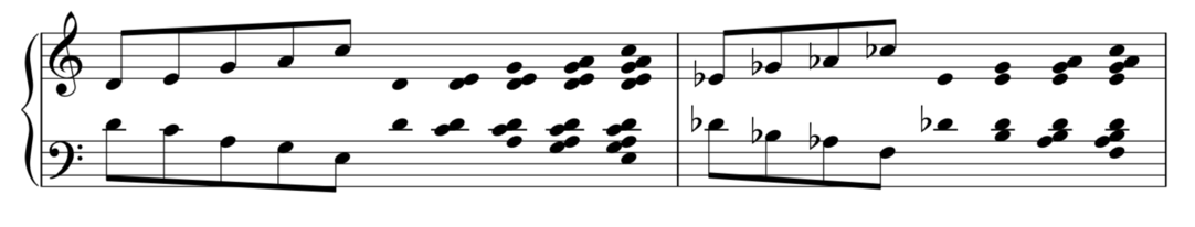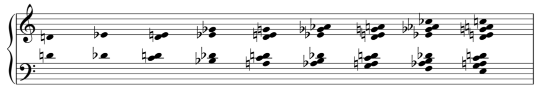 One can see the shape of the chords being ”mirrored” from the D in the middle in the first bar. In the second bar the pattern is played ascending from Eb and descending from Db creating a second group of chords. When the chords from the example above are combined and ordered from smallest to biggest outer interval the result is the harmonic material used in Moineaux I (example 3).