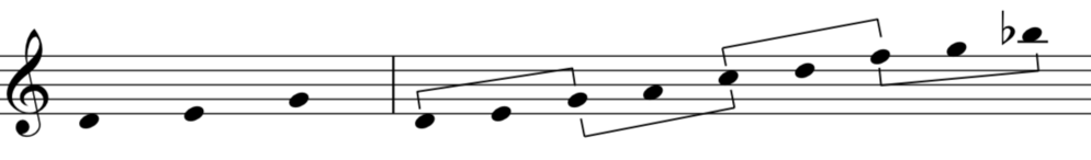 When I started working on the music for Moineaux, I started out with only three pitches. In Moineaux II the trichord D, E, G (or [0,2,5] in ”normal form”) is abundantly present. The focus is put on the intervallic pattern of one whole step and then one minor third. By experimenting with these relationships in different ways I arrived at the series of notes shown below.