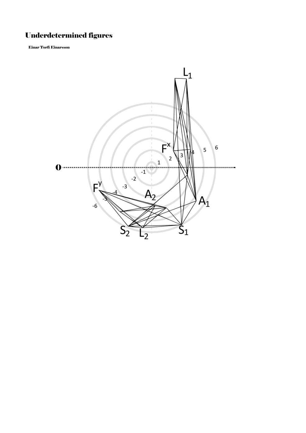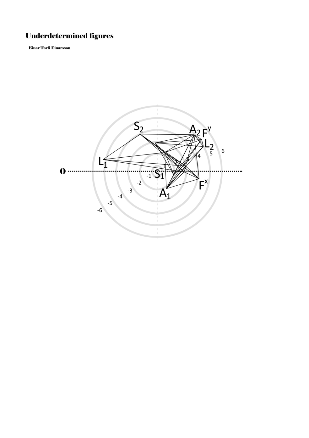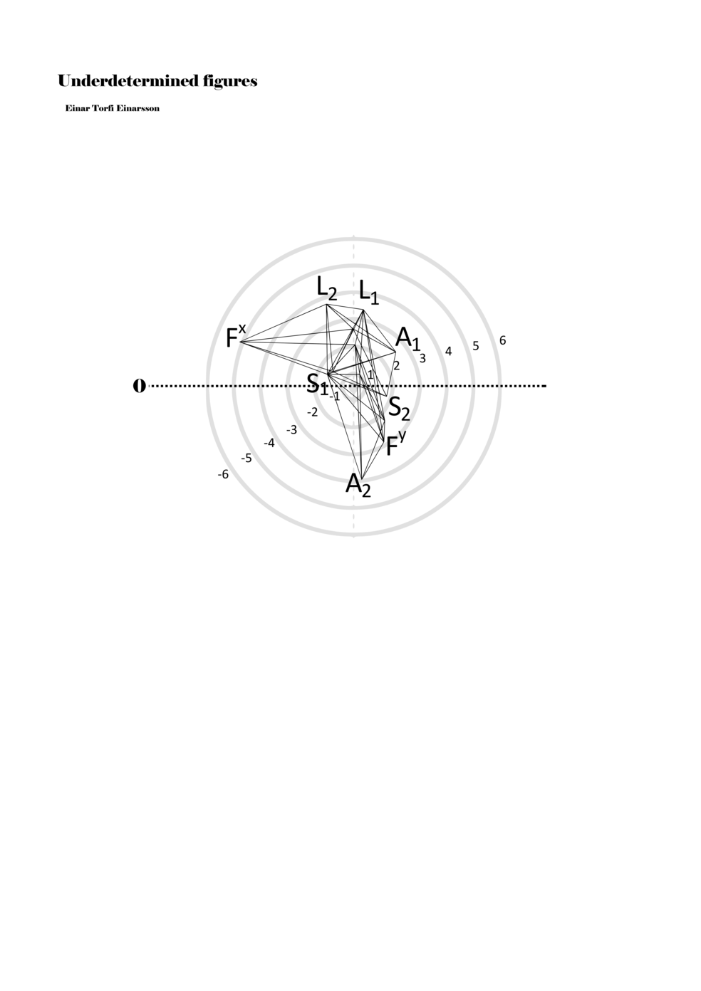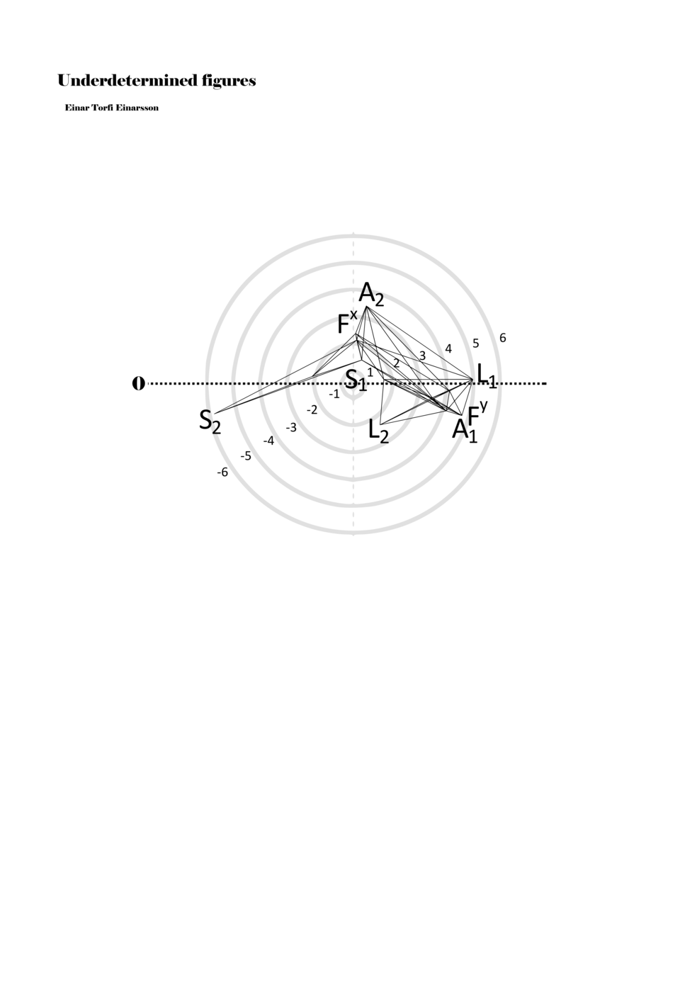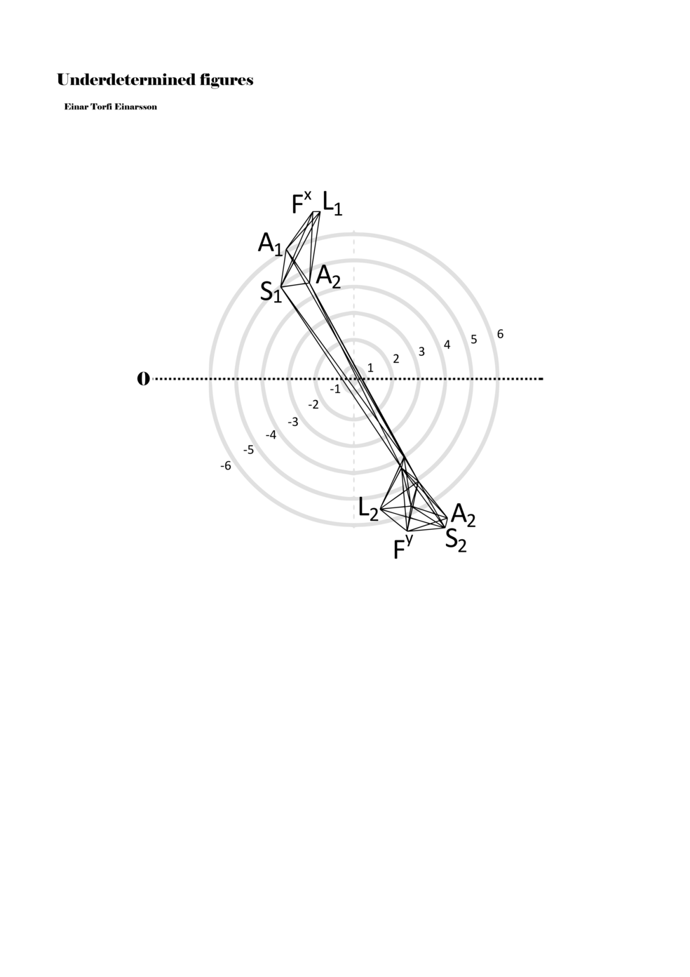 When a figure is placed within this parametric space one can thus read all kinds of changes in value when following the lines in any direction (paths). These number rows are then assigned specific physical parameters, which then operate as instructions for performers. In example 2 we see one figure placed within the field. Indicators (F, L, A, S, see details below) denote starting points (or the initial ‘posture’ of the performer) – that is, where a given parameter initiates when performing the figure. A path is chosen by the performer for each indicator/parameter but from each indicator there are several possible paths and only one path is chosen. The rule is, follow a line from the indicator to the next point (where lines join) in the figure. So, for each parameter there is a line from the indicator to the next point (or node) resulting in a change in value for that parameter. Importantly, when performing the figure all parameters are active, so the performer aims to perform all the chosen paths simultaneously. In example 2, Fx (force) initiates around -3.3 and can proceed through several paths to another point: -2, -1, +2, or -2.8, and so on. The same goes for the other indicators. Each figure is therefore a set of paths indicating a change in certain parameters, and all these paths are played simultaneously for the duration of the figure (each figure is always performed for around 2–3 seconds).