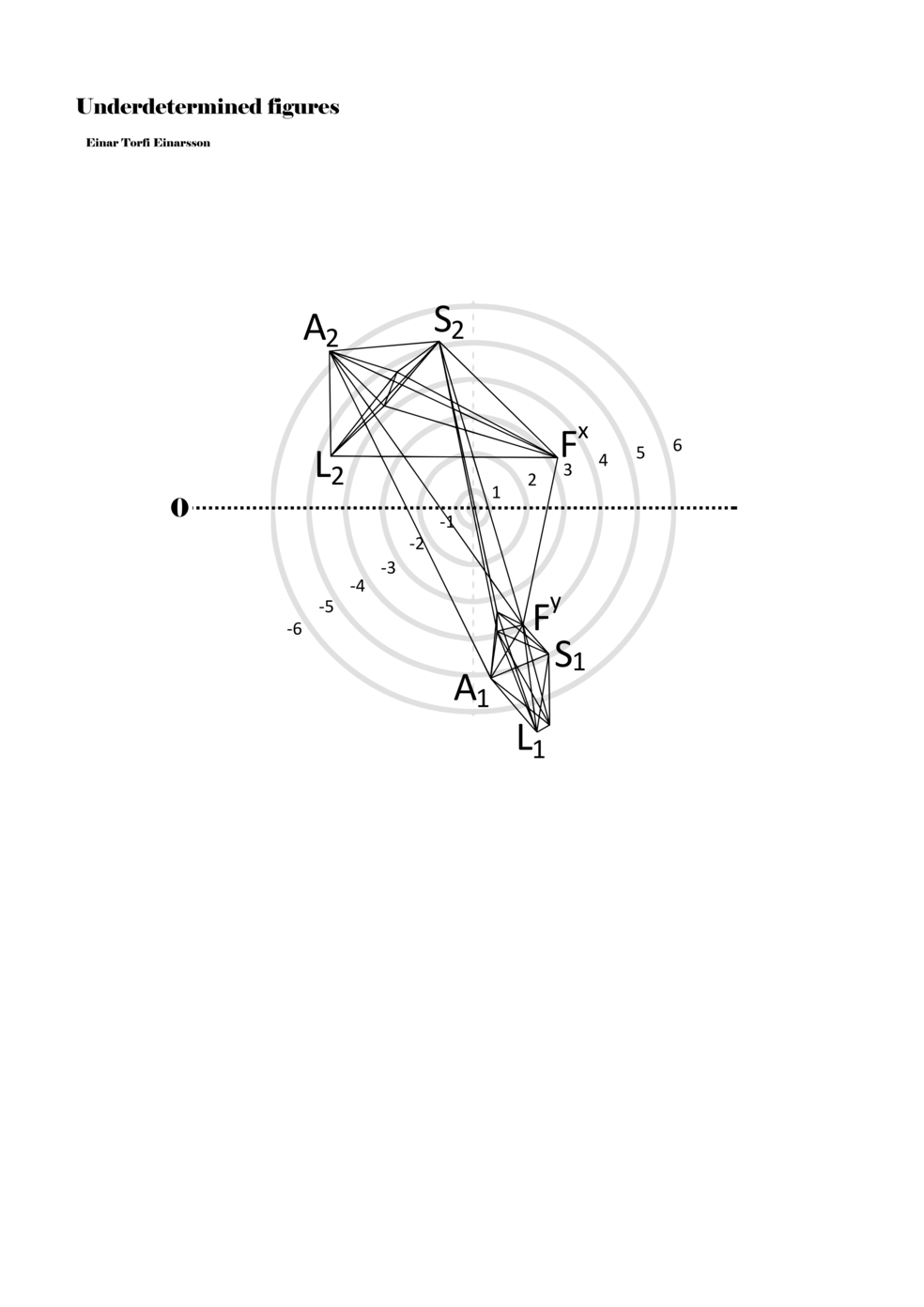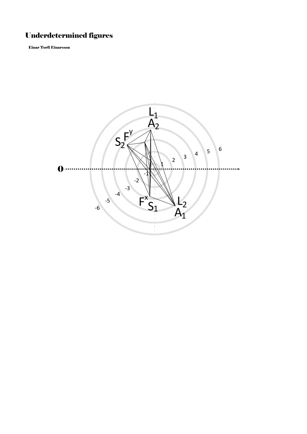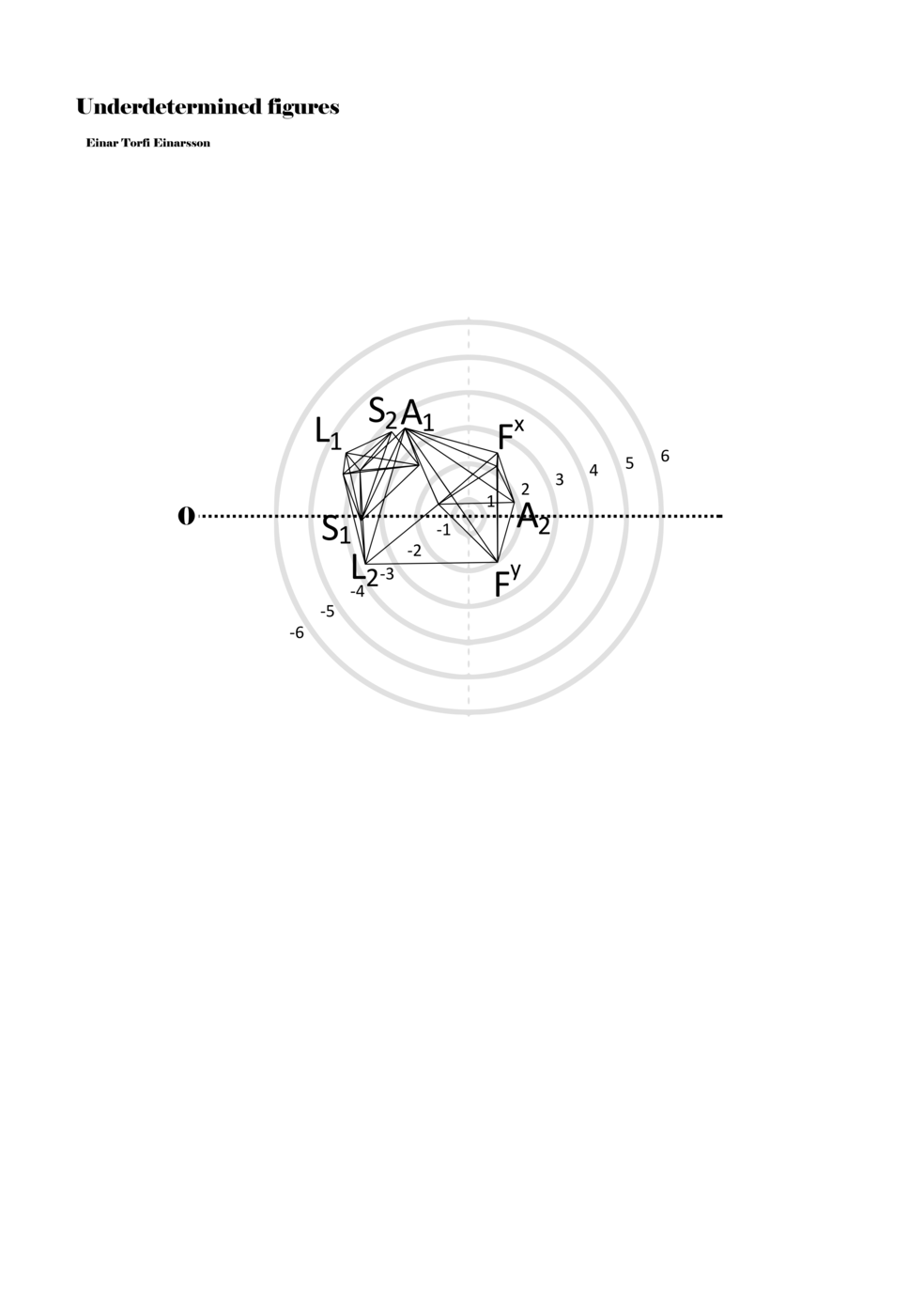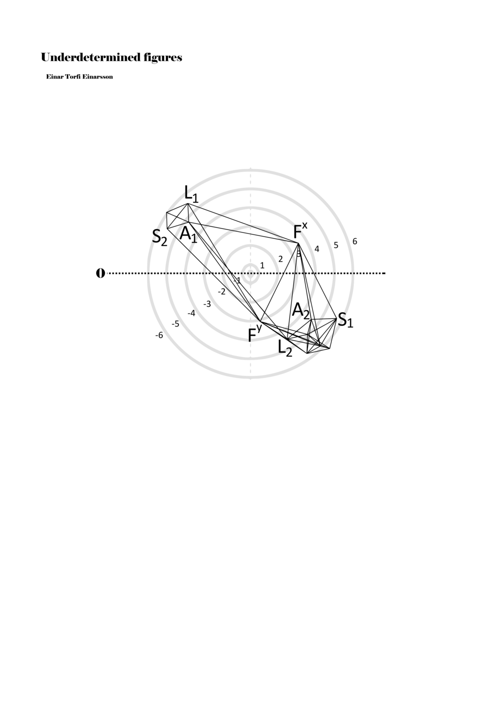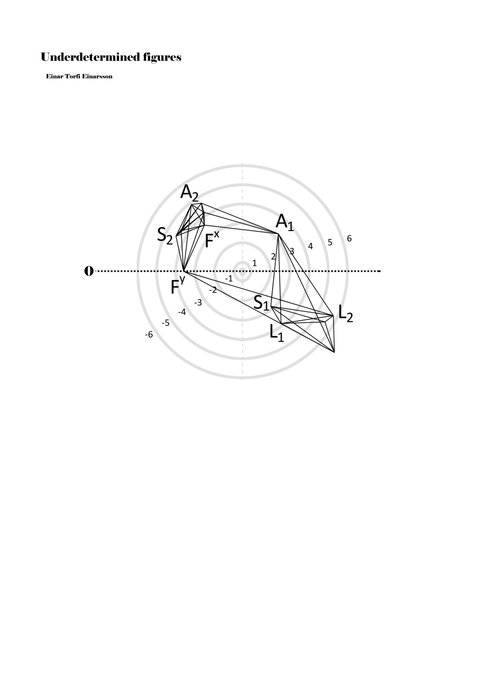 When a figure is placed within this parametric space one can thus read all kinds of changes in value when following the lines in any direction (paths). These number rows are then assigned specific physical parameters, which then operate as instructions for performers. In example 2 we see one figure placed within the field. Indicators (F, L, A, S, see details below) denote starting points (or the initial ‘posture’ of the performer) – that is, where a given parameter initiates when performing the figure. A path is chosen by the performer for each indicator/parameter but from each indicator there are several possible paths and only one path is chosen. The rule is, follow a line from the indicator to the next point (where lines join) in the figure. So, for each parameter there is a line from the indicator to the next point (or node) resulting in a change in value for that parameter. Importantly, when performing the figure all parameters are active, so the performer aims to perform all the chosen paths simultaneously. In example 2, Fx (force) initiates around -3.3 and can proceed through several paths to another point: -2, -1, +2, or -2.8, and so on. The same goes for the other indicators. Each figure is therefore a set of paths indicating a change in certain parameters, and all these paths are played simultaneously for the duration of the figure (each figure is always performed for around 2–3 seconds).