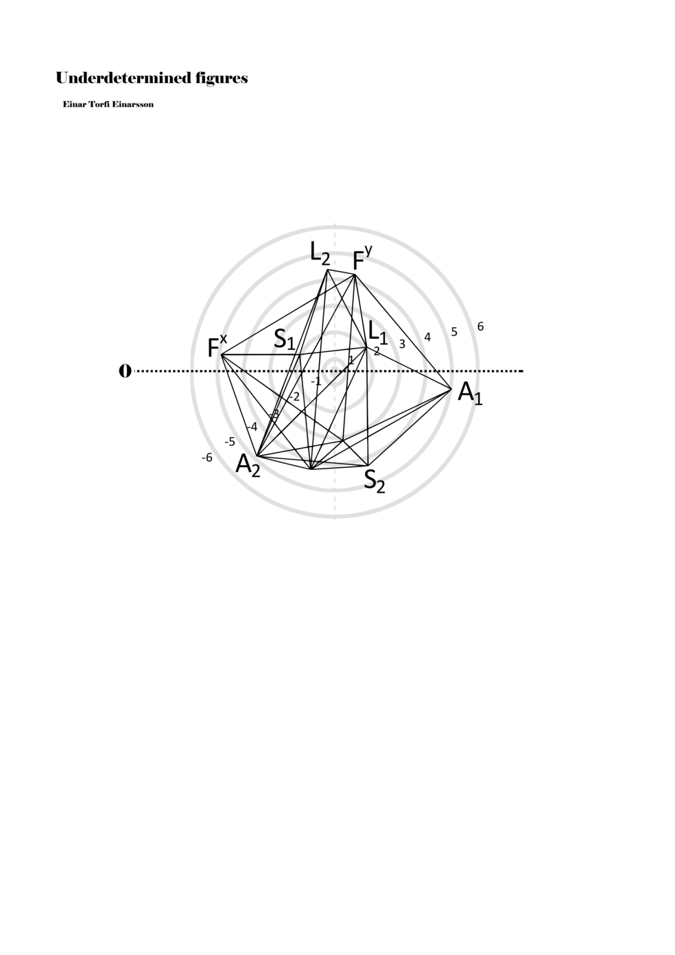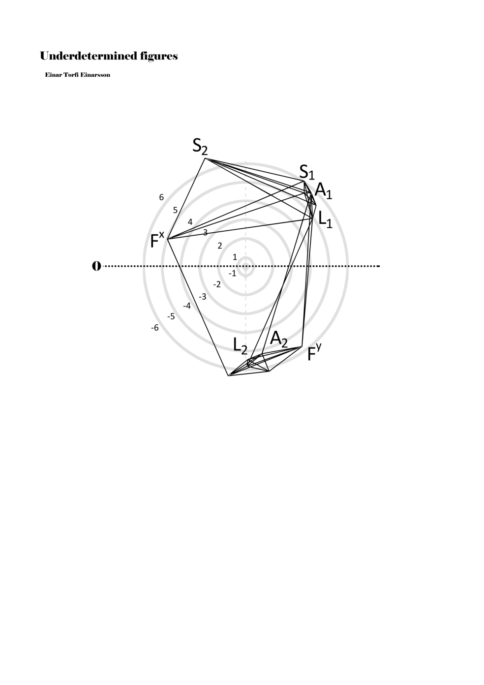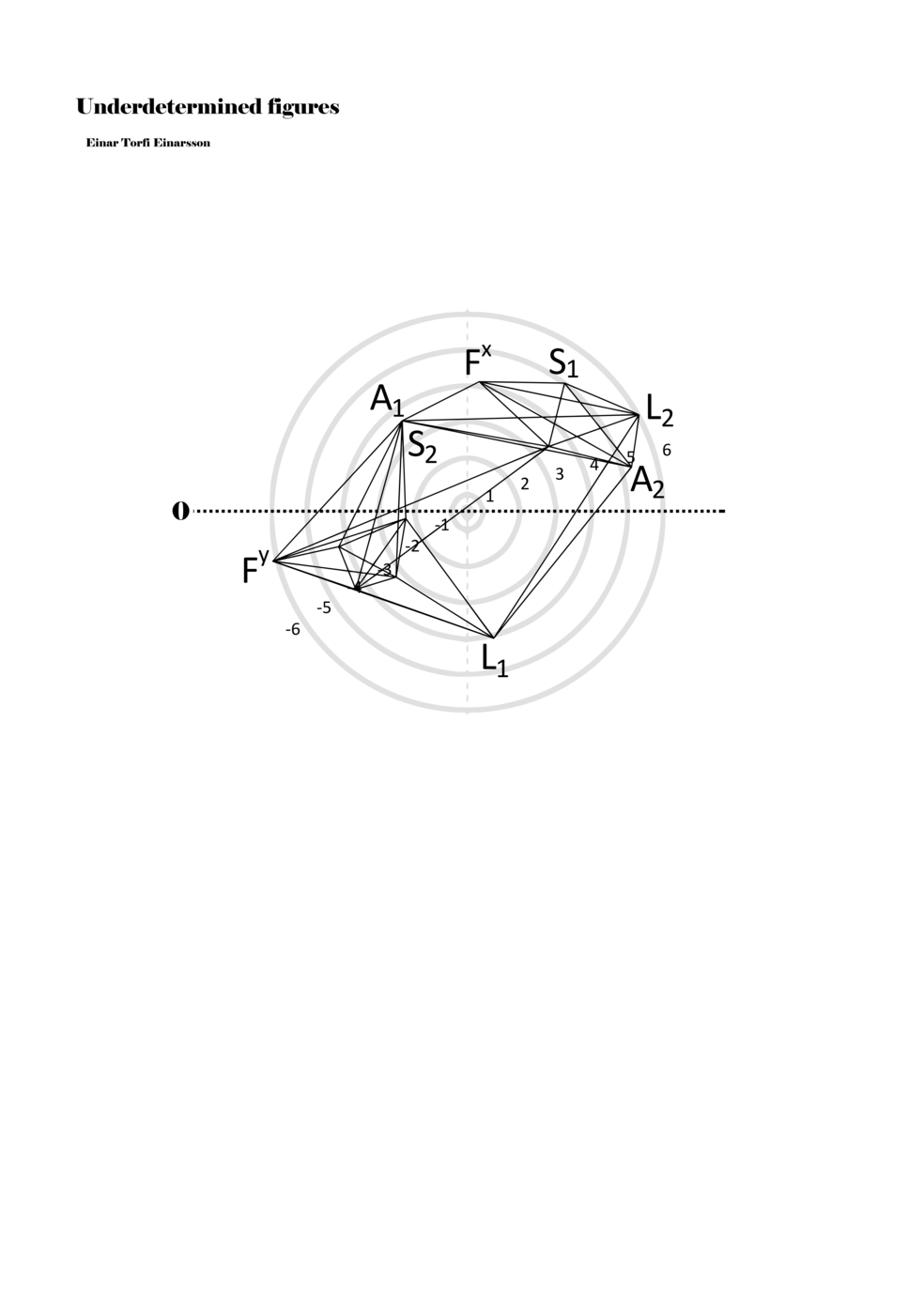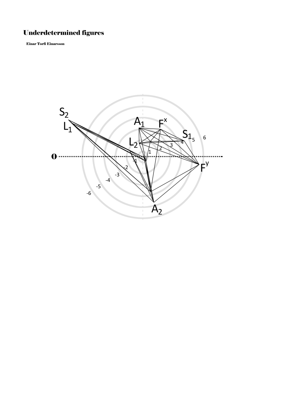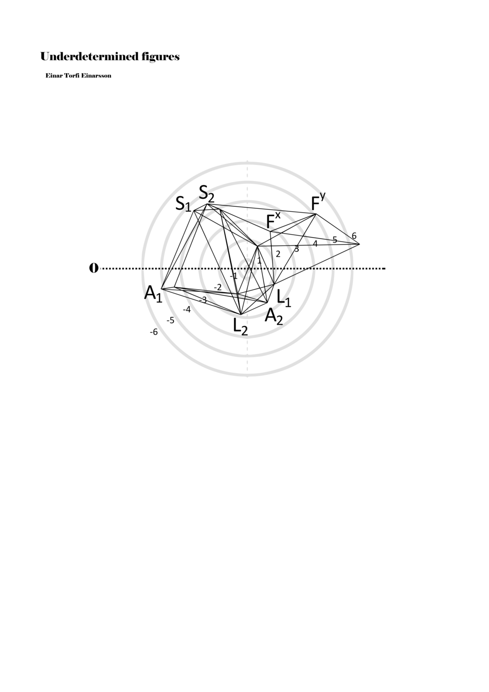 When a figure is placed within this parametric space one can thus read all kinds of changes in value when following the lines in any direction (paths). These number rows are then assigned specific physical parameters, which then operate as instructions for performers. In example 2 we see one figure placed within the field. Indicators (F, L, A, S, see details below) denote starting points (or the initial ‘posture’ of the performer) – that is, where a given parameter initiates when performing the figure. A path is chosen by the performer for each indicator/parameter but from each indicator there are several possible paths and only one path is chosen. The rule is, follow a line from the indicator to the next point (where lines join) in the figure. So, for each parameter there is a line from the indicator to the next point (or node) resulting in a change in value for that parameter. Importantly, when performing the figure all parameters are active, so the performer aims to perform all the chosen paths simultaneously. In example 2, Fx (force) initiates around -3.3 and can proceed through several paths to another point: -2, -1, +2, or -2.8, and so on. The same goes for the other indicators. Each figure is therefore a set of paths indicating a change in certain parameters, and all these paths are played simultaneously for the duration of the figure (each figure is always performed for around 2–3 seconds).