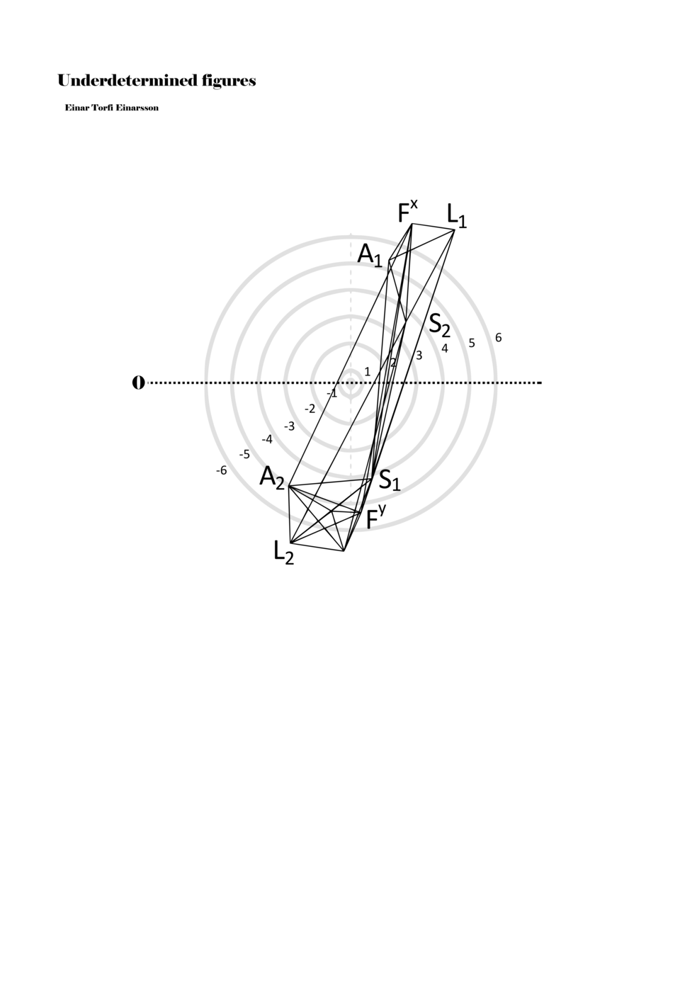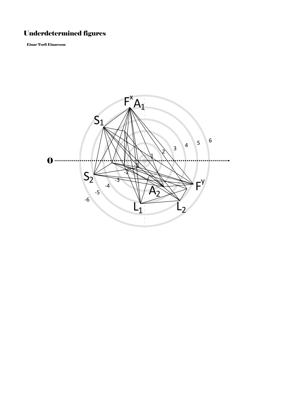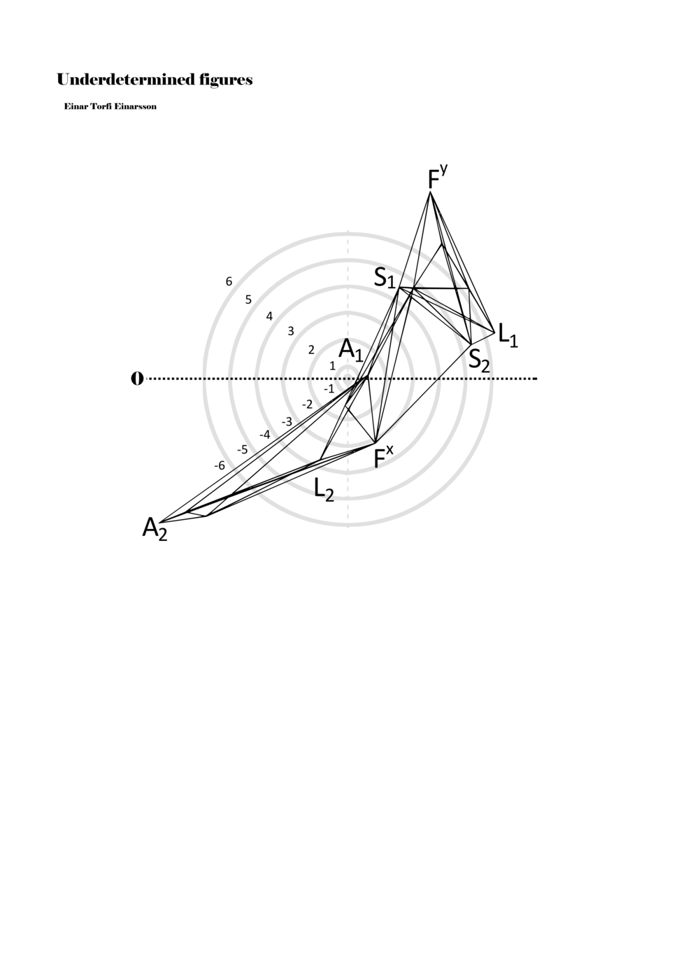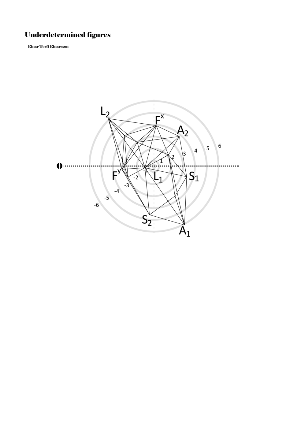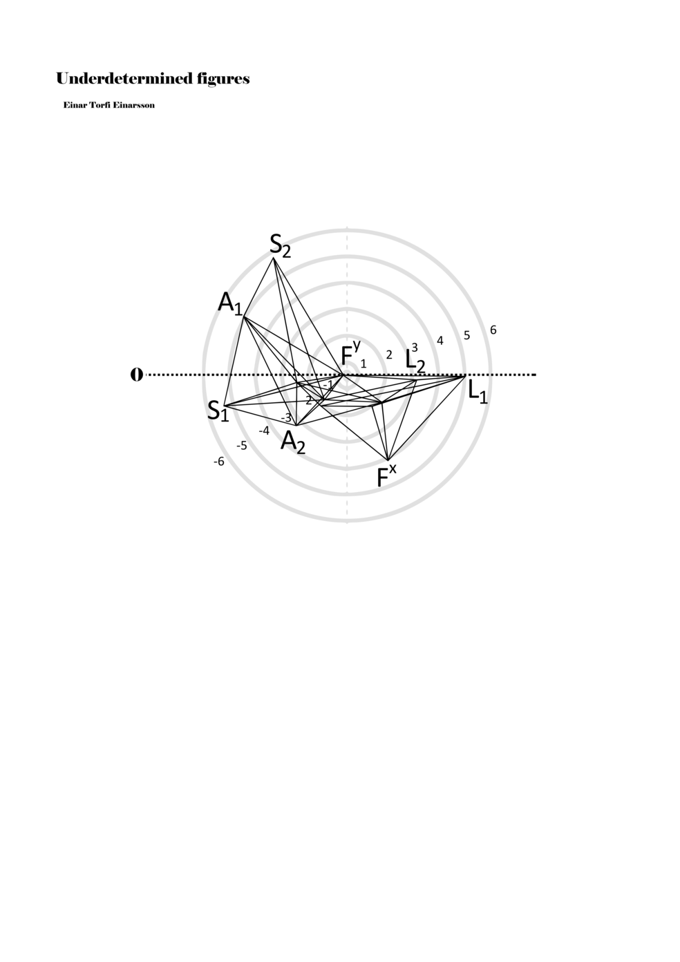 When a figure is placed within this parametric space one can thus read all kinds of changes in value when following the lines in any direction (paths). These number rows are then assigned specific physical parameters, which then operate as instructions for performers. In example 2 we see one figure placed within the field. Indicators (F, L, A, S, see details below) denote starting points (or the initial ‘posture’ of the performer) – that is, where a given parameter initiates when performing the figure. A path is chosen by the performer for each indicator/parameter but from each indicator there are several possible paths and only one path is chosen. The rule is, follow a line from the indicator to the next point (where lines join) in the figure. So, for each parameter there is a line from the indicator to the next point (or node) resulting in a change in value for that parameter. Importantly, when performing the figure all parameters are active, so the performer aims to perform all the chosen paths simultaneously. In example 2, Fx (force) initiates around -3.3 and can proceed through several paths to another point: -2, -1, +2, or -2.8, and so on. The same goes for the other indicators. Each figure is therefore a set of paths indicating a change in certain parameters, and all these paths are played simultaneously for the duration of the figure (each figure is always performed for around 2–3 seconds).