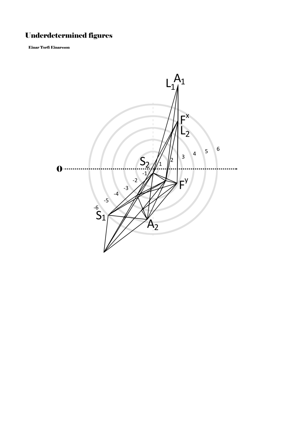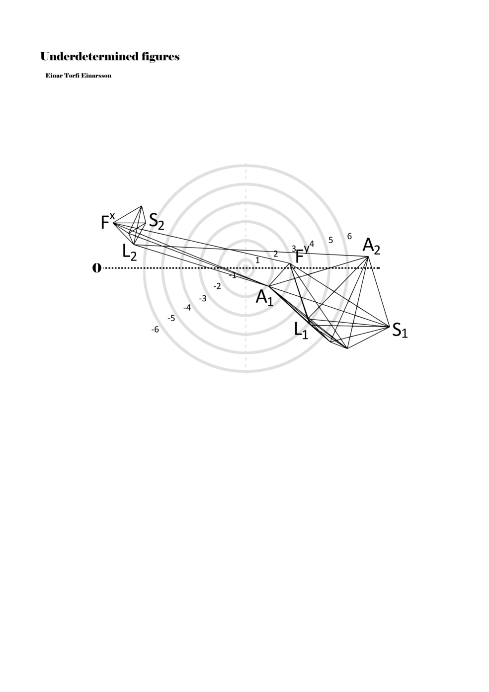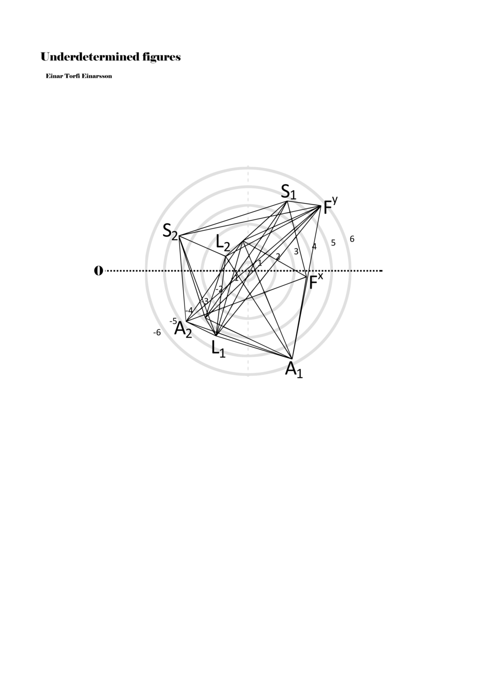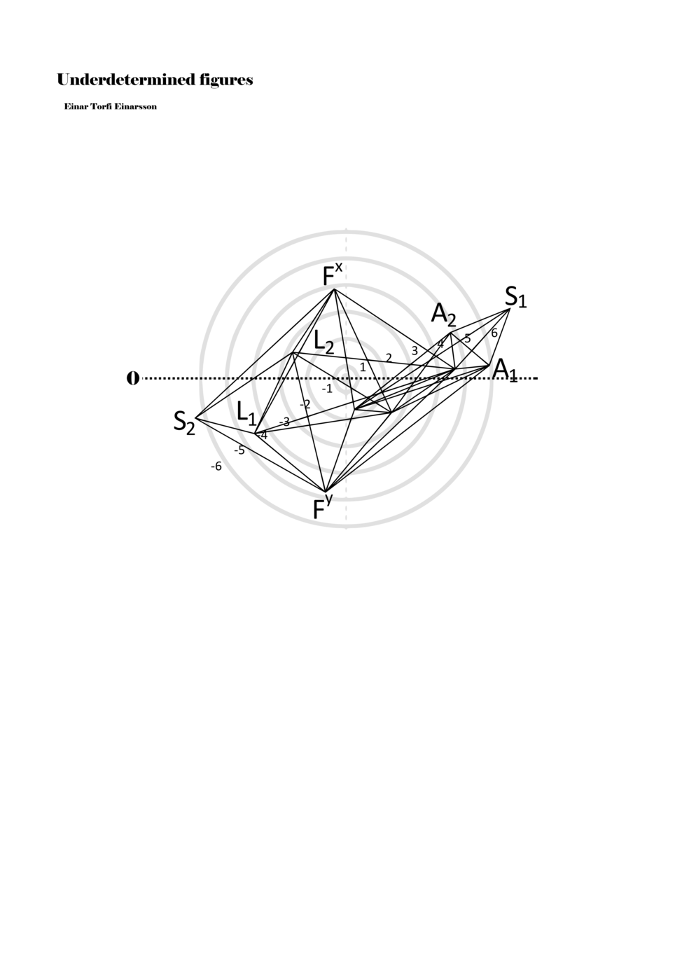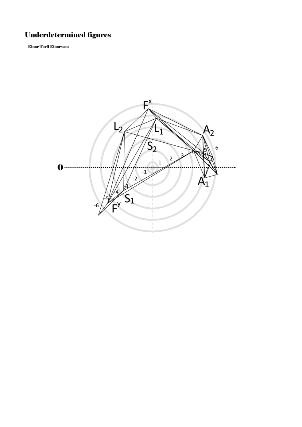 When a figure is placed within this parametric space one can thus read all kinds of changes in value when following the lines in any direction (paths). These number rows are then assigned specific physical parameters, which then operate as instructions for performers. In example 2 we see one figure placed within the field. Indicators (F, L, A, S, see details below) denote starting points (or the initial ‘posture’ of the performer) – that is, where a given parameter initiates when performing the figure. A path is chosen by the performer for each indicator/parameter but from each indicator there are several possible paths and only one path is chosen. The rule is, follow a line from the indicator to the next point (where lines join) in the figure. So, for each parameter there is a line from the indicator to the next point (or node) resulting in a change in value for that parameter. Importantly, when performing the figure all parameters are active, so the performer aims to perform all the chosen paths simultaneously. In example 2, Fx (force) initiates around -3.3 and can proceed through several paths to another point: -2, -1, +2, or -2.8, and so on. The same goes for the other indicators. Each figure is therefore a set of paths indicating a change in certain parameters, and all these paths are played simultaneously for the duration of the figure (each figure is always performed for around 2–3 seconds).