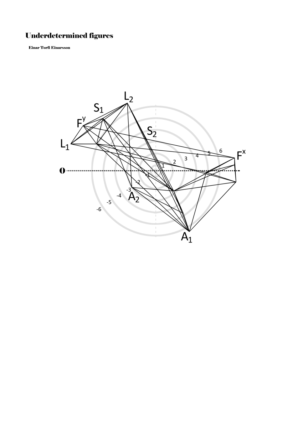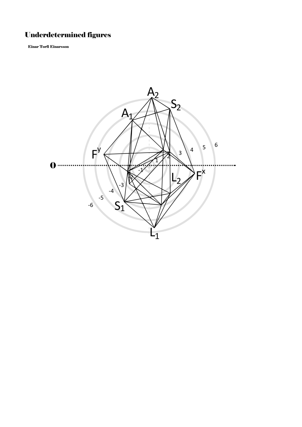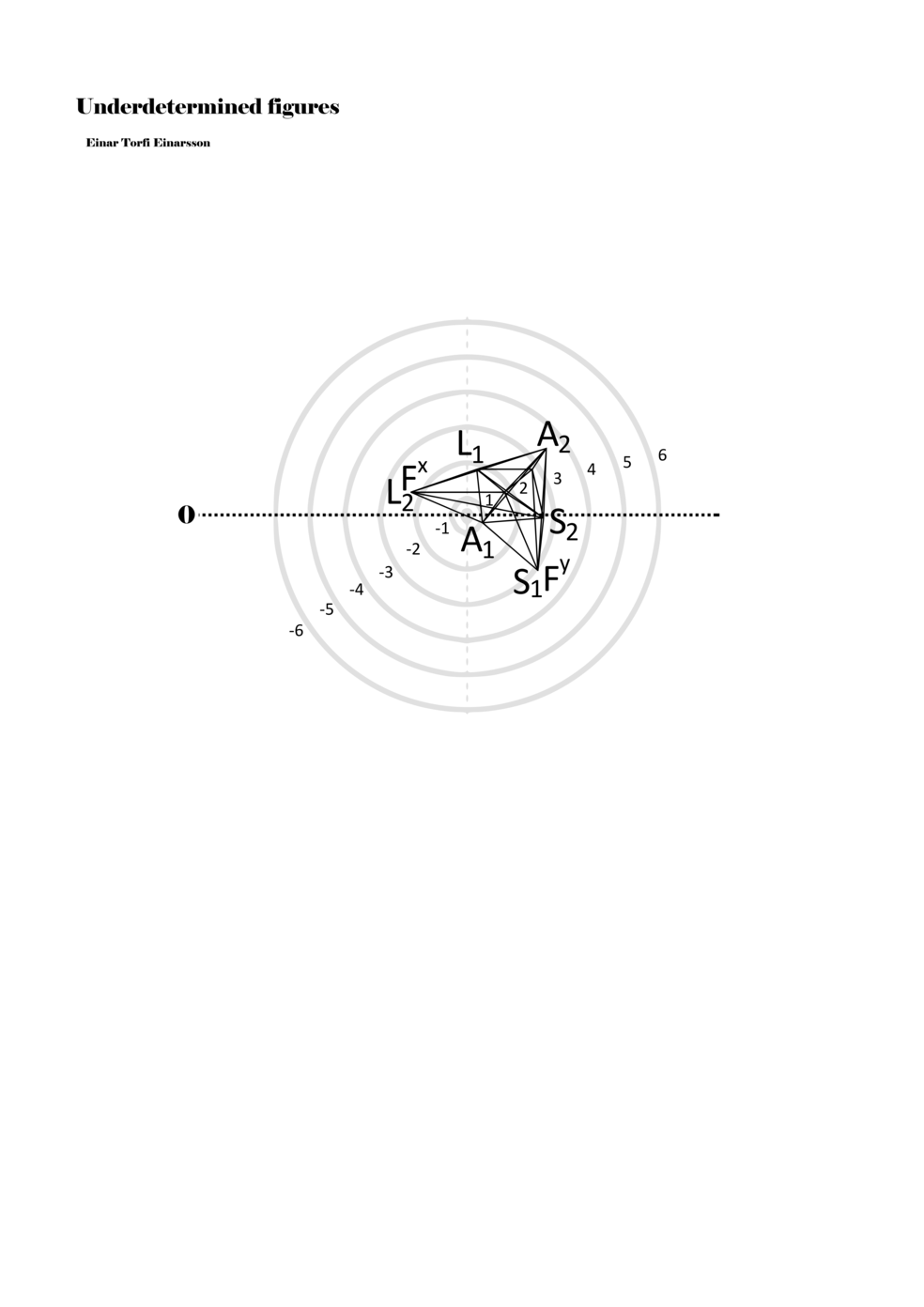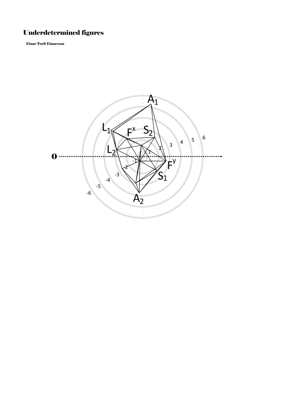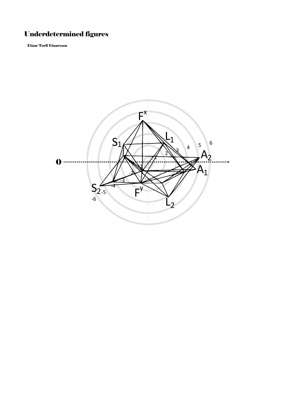 When a figure is placed within this parametric space one can thus read all kinds of changes in value when following the lines in any direction (paths). These number rows are then assigned specific physical parameters, which then operate as instructions for performers. In example 2 we see one figure placed within the field. Indicators (F, L, A, S, see details below) denote starting points (or the initial ‘posture’ of the performer) – that is, where a given parameter initiates when performing the figure. A path is chosen by the performer for each indicator/parameter but from each indicator there are several possible paths and only one path is chosen. The rule is, follow a line from the indicator to the next point (where lines join) in the figure. So, for each parameter there is a line from the indicator to the next point (or node) resulting in a change in value for that parameter. Importantly, when performing the figure all parameters are active, so the performer aims to perform all the chosen paths simultaneously. In example 2, Fx (force) initiates around -3.3 and can proceed through several paths to another point: -2, -1, +2, or -2.8, and so on. The same goes for the other indicators. Each figure is therefore a set of paths indicating a change in certain parameters, and all these paths are played simultaneously for the duration of the figure (each figure is always performed for around 2–3 seconds).