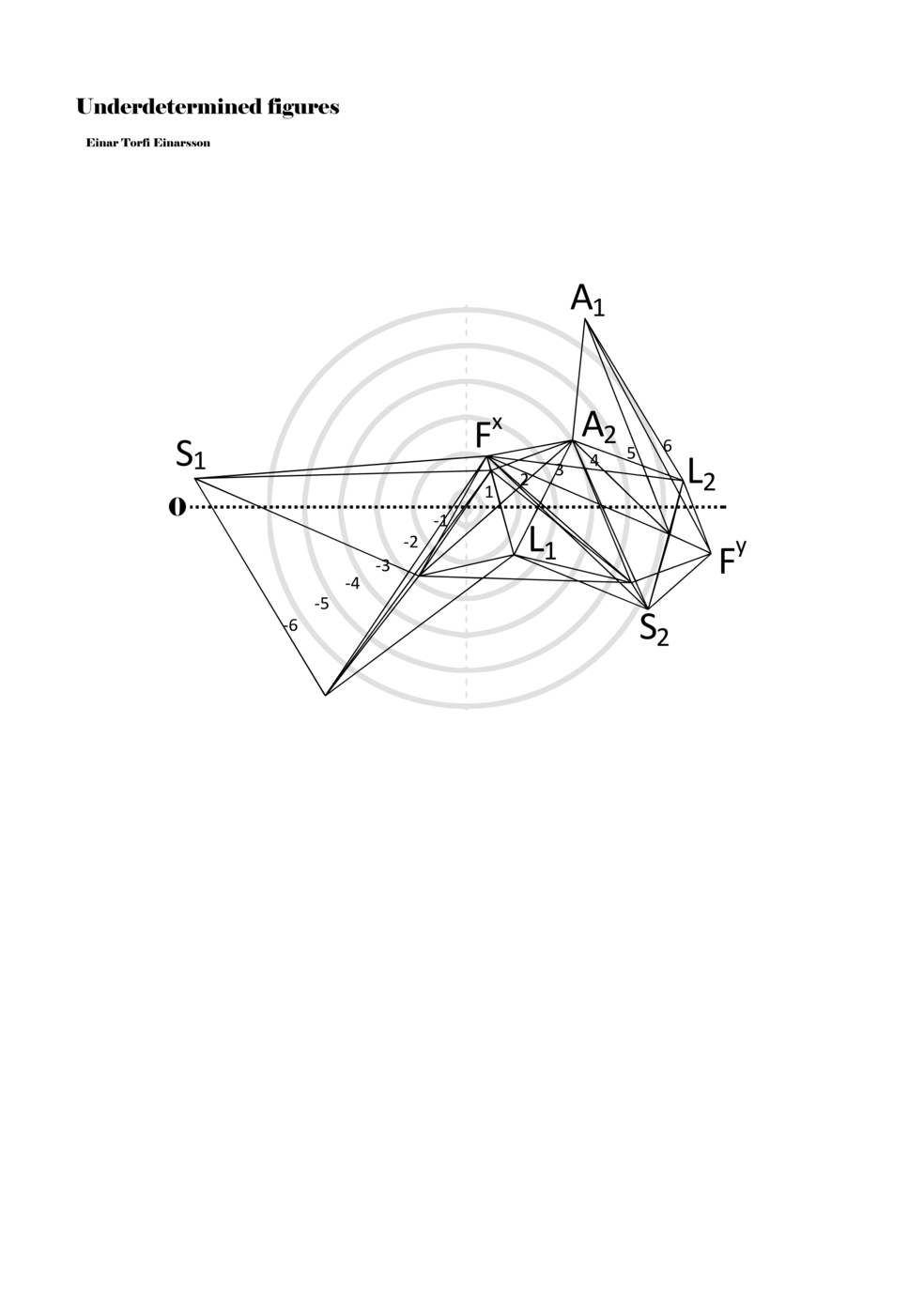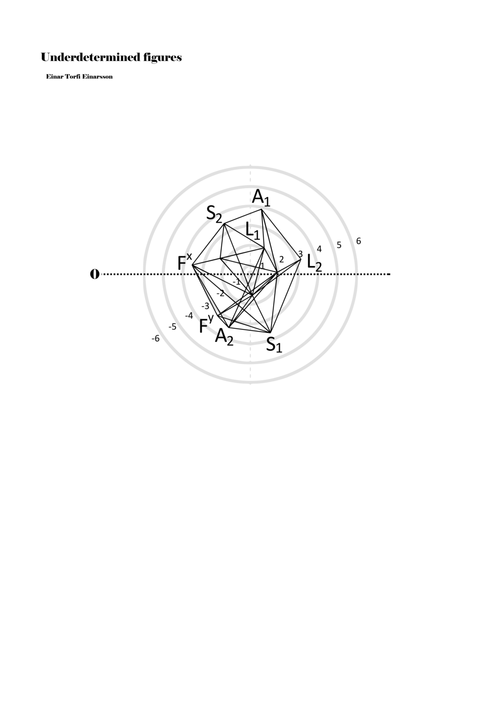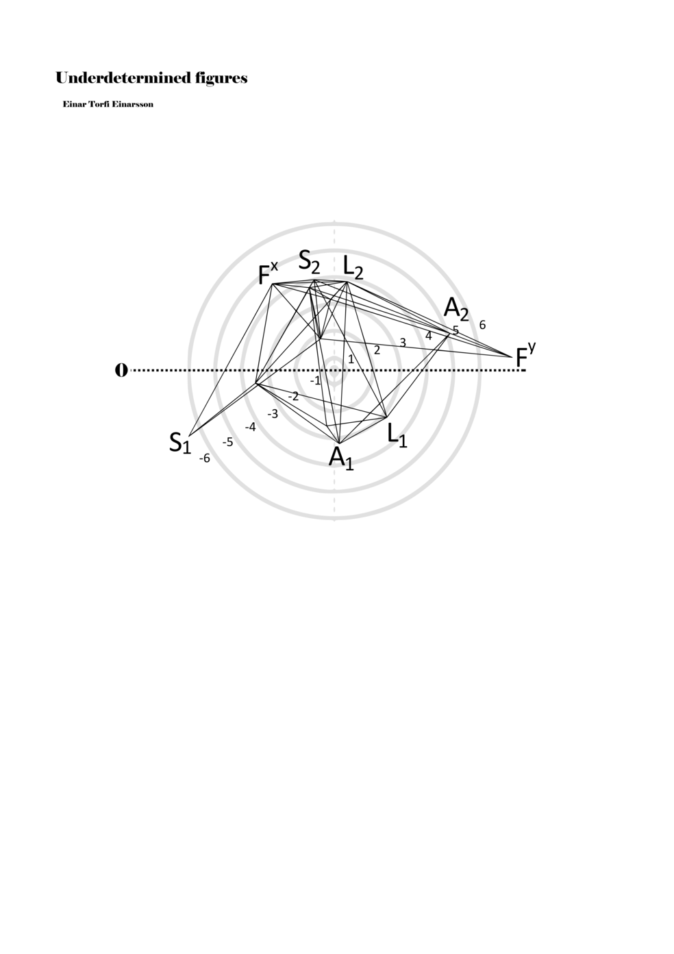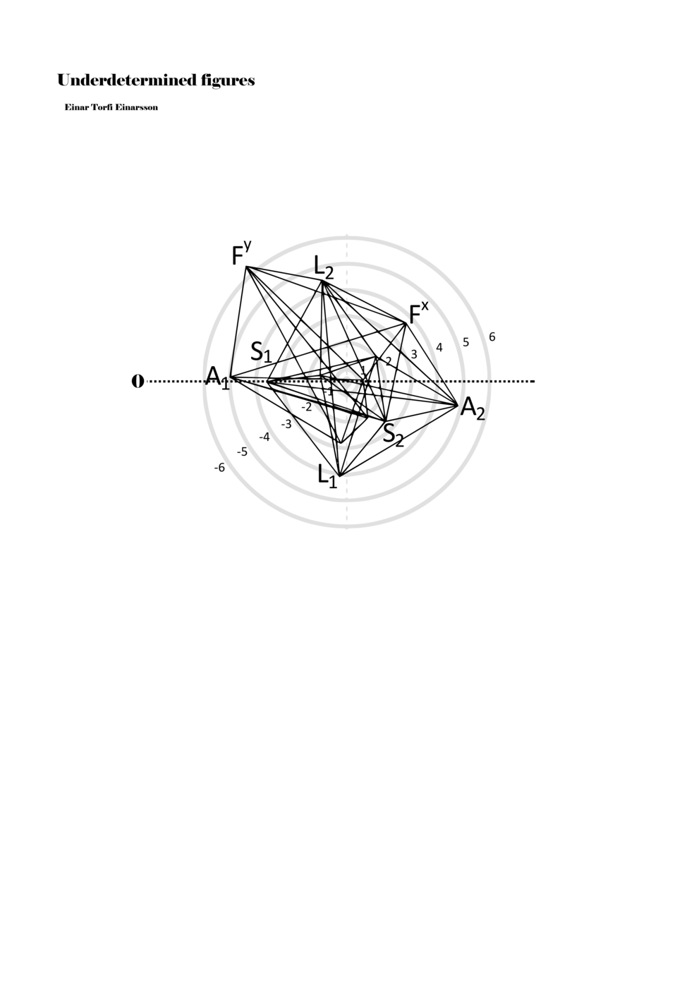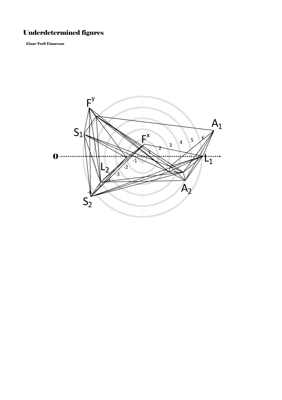 When a figure is placed within this parametric space one can thus read all kinds of changes in value when following the lines in any direction (paths). These number rows are then assigned specific physical parameters, which then operate as instructions for performers. In example 2 we see one figure placed within the field. Indicators (F, L, A, S, see details below) denote starting points (or the initial ‘posture’ of the performer) – that is, where a given parameter initiates when performing the figure. A path is chosen by the performer for each indicator/parameter but from each indicator there are several possible paths and only one path is chosen. The rule is, follow a line from the indicator to the next point (where lines join) in the figure. So, for each parameter there is a line from the indicator to the next point (or node) resulting in a change in value for that parameter. Importantly, when performing the figure all parameters are active, so the performer aims to perform all the chosen paths simultaneously. In example 2, Fx (force) initiates around -3.3 and can proceed through several paths to another point: -2, -1, +2, or -2.8, and so on. The same goes for the other indicators. Each figure is therefore a set of paths indicating a change in certain parameters, and all these paths are played simultaneously for the duration of the figure (each figure is always performed for around 2–3 seconds).