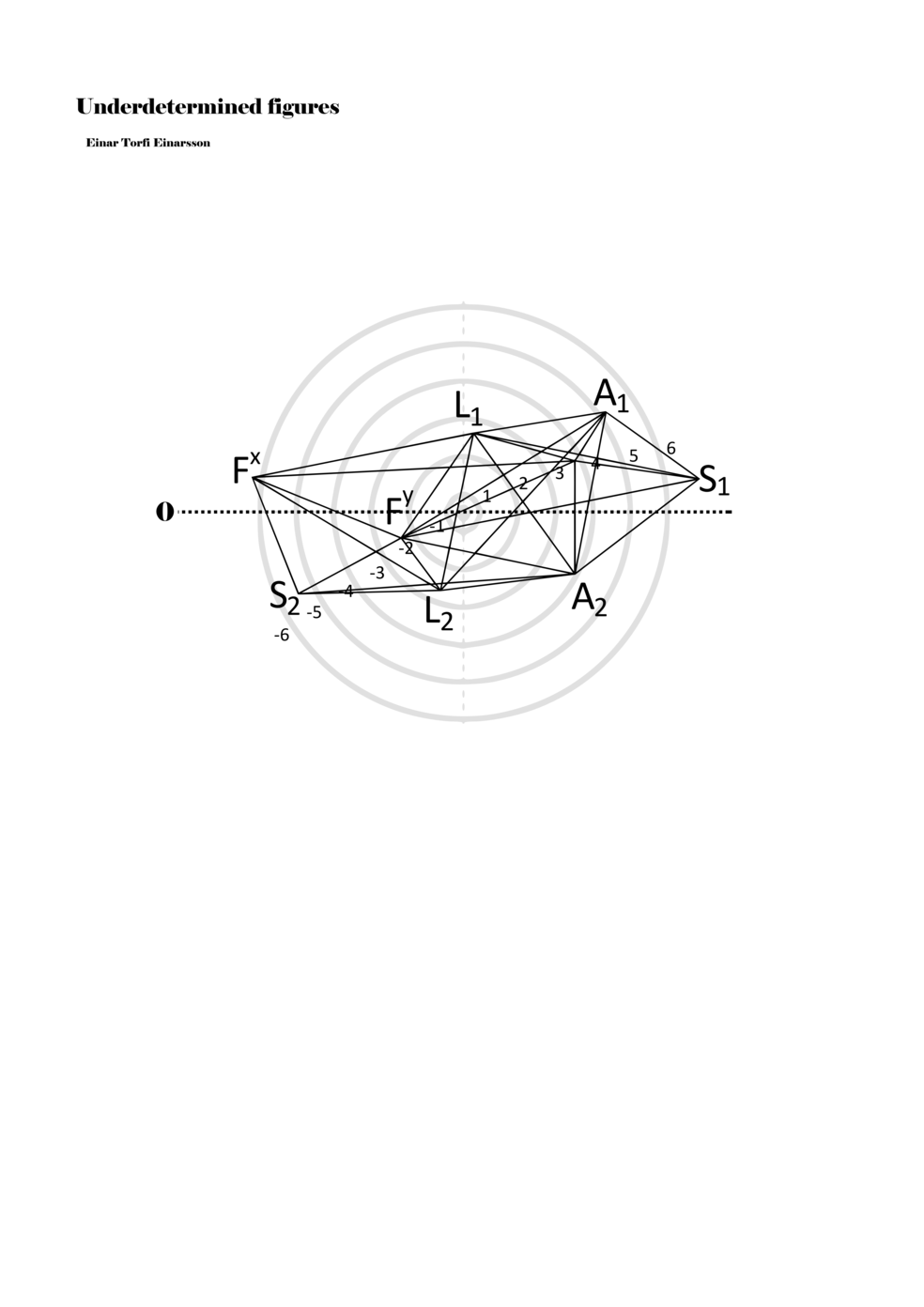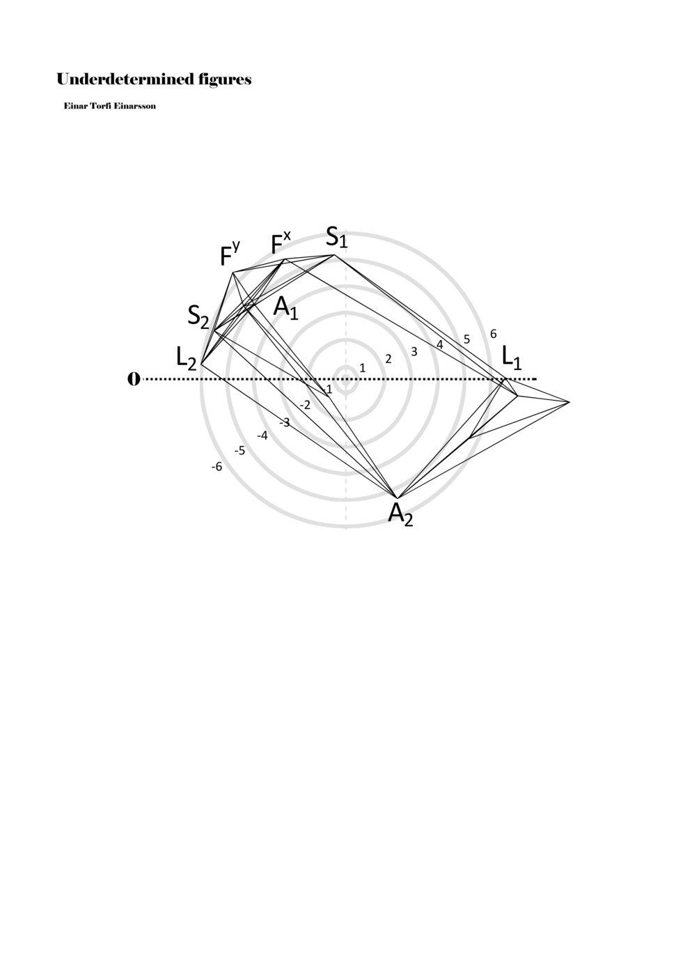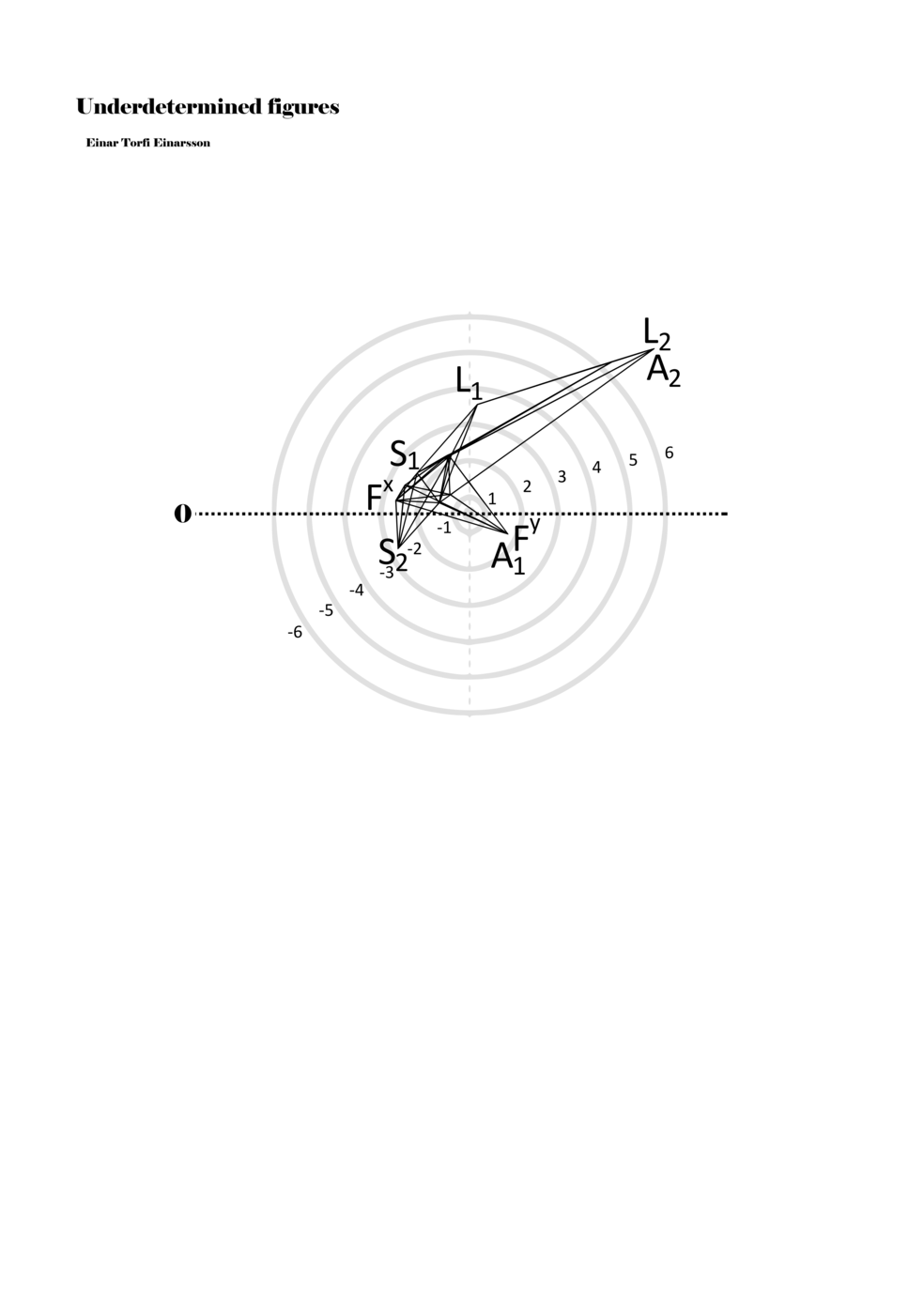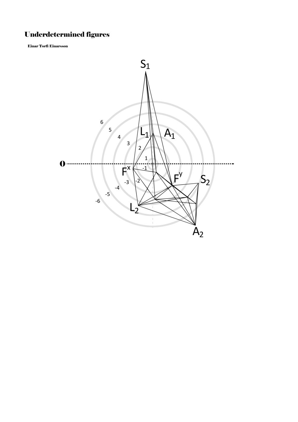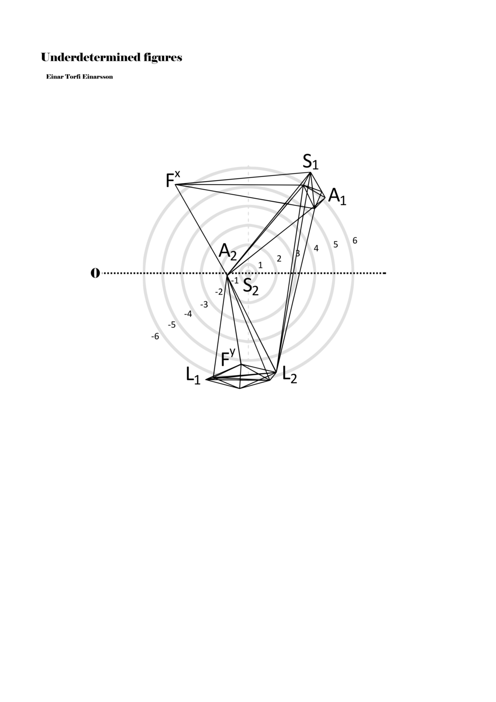 When a figure is placed within this parametric space one can thus read all kinds of changes in value when following the lines in any direction (paths). These number rows are then assigned specific physical parameters, which then operate as instructions for performers. In example 2 we see one figure placed within the field. Indicators (F, L, A, S, see details below) denote starting points (or the initial ‘posture’ of the performer) – that is, where a given parameter initiates when performing the figure. A path is chosen by the performer for each indicator/parameter but from each indicator there are several possible paths and only one path is chosen. The rule is, follow a line from the indicator to the next point (where lines join) in the figure. So, for each parameter there is a line from the indicator to the next point (or node) resulting in a change in value for that parameter. Importantly, when performing the figure all parameters are active, so the performer aims to perform all the chosen paths simultaneously. In example 2, Fx (force) initiates around -3.3 and can proceed through several paths to another point: -2, -1, +2, or -2.8, and so on. The same goes for the other indicators. Each figure is therefore a set of paths indicating a change in certain parameters, and all these paths are played simultaneously for the duration of the figure (each figure is always performed for around 2–3 seconds).