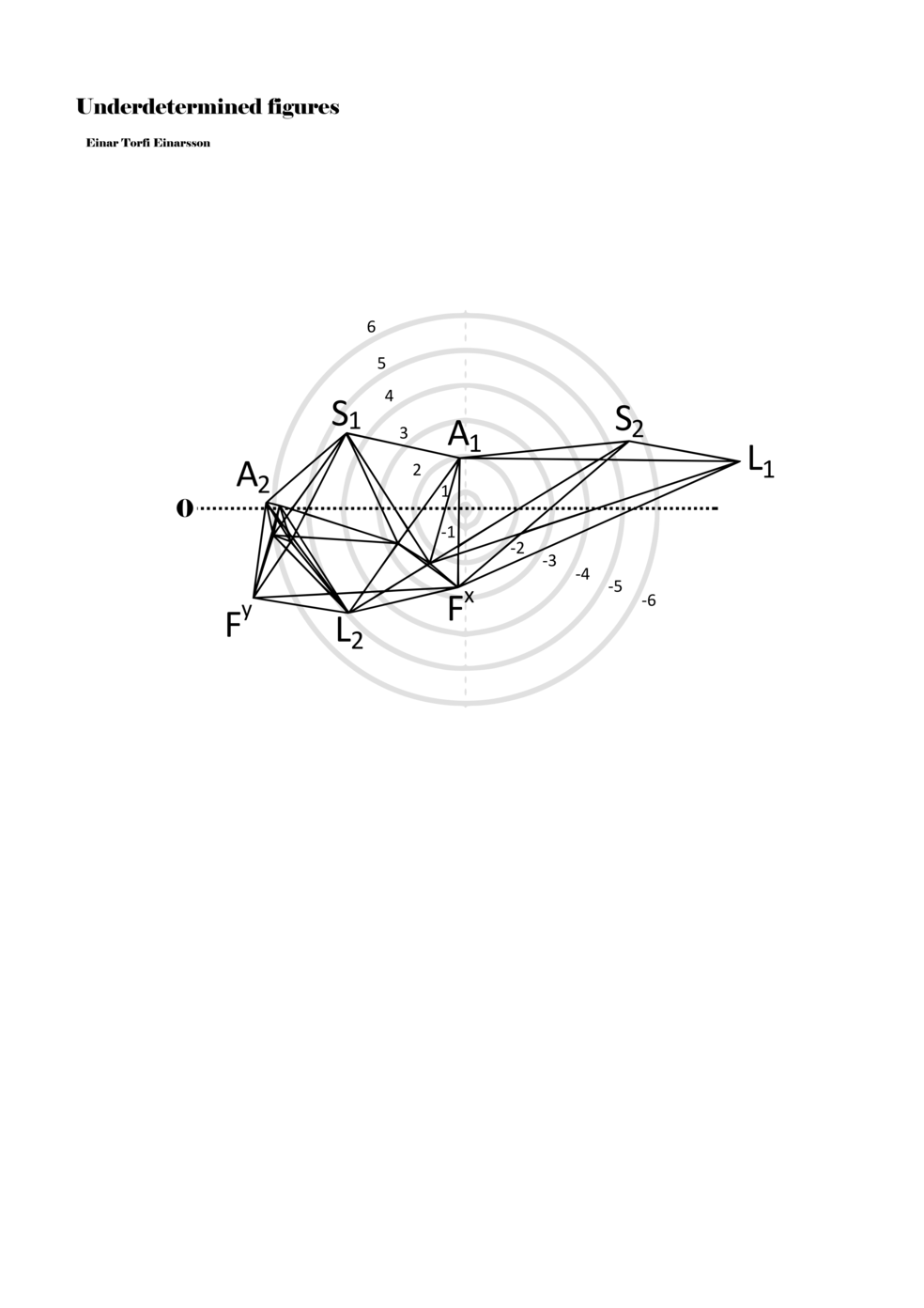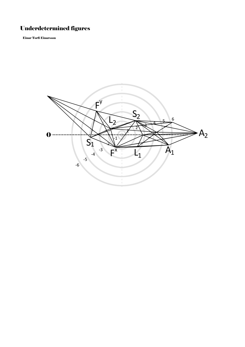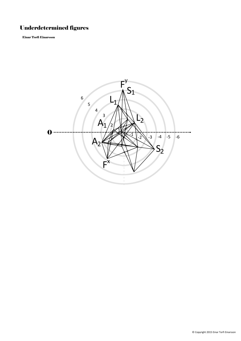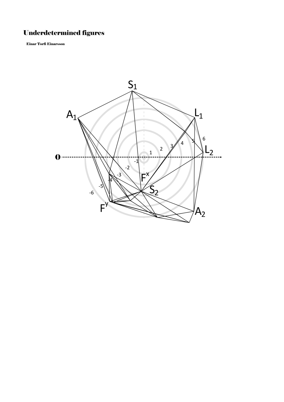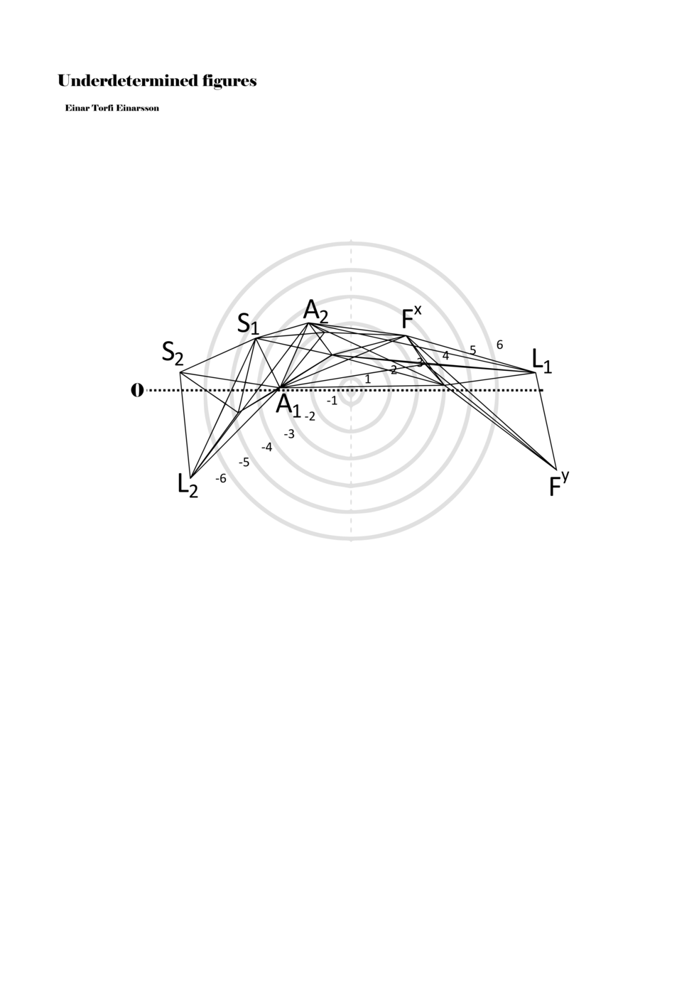 When a figure is placed within this parametric space one can thus read all kinds of changes in value when following the lines in any direction (paths). These number rows are then assigned specific physical parameters, which then operate as instructions for performers. In example 2 we see one figure placed within the field. Indicators (F, L, A, S, see details below) denote starting points (or the initial ‘posture’ of the performer) – that is, where a given parameter initiates when performing the figure. A path is chosen by the performer for each indicator/parameter but from each indicator there are several possible paths and only one path is chosen. The rule is, follow a line from the indicator to the next point (where lines join) in the figure. So, for each parameter there is a line from the indicator to the next point (or node) resulting in a change in value for that parameter. Importantly, when performing the figure all parameters are active, so the performer aims to perform all the chosen paths simultaneously. In example 2, Fx (force) initiates around -3.3 and can proceed through several paths to another point: -2, -1, +2, or -2.8, and so on. The same goes for the other indicators. Each figure is therefore a set of paths indicating a change in certain parameters, and all these paths are played simultaneously for the duration of the figure (each figure is always performed for around 2–3 seconds).