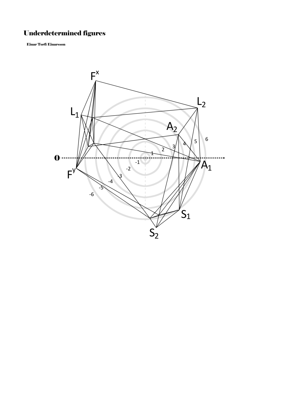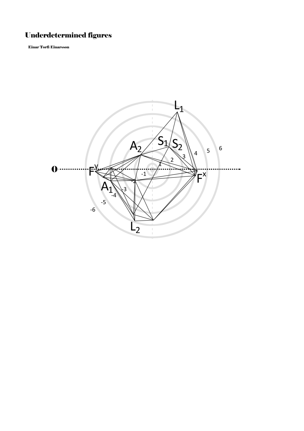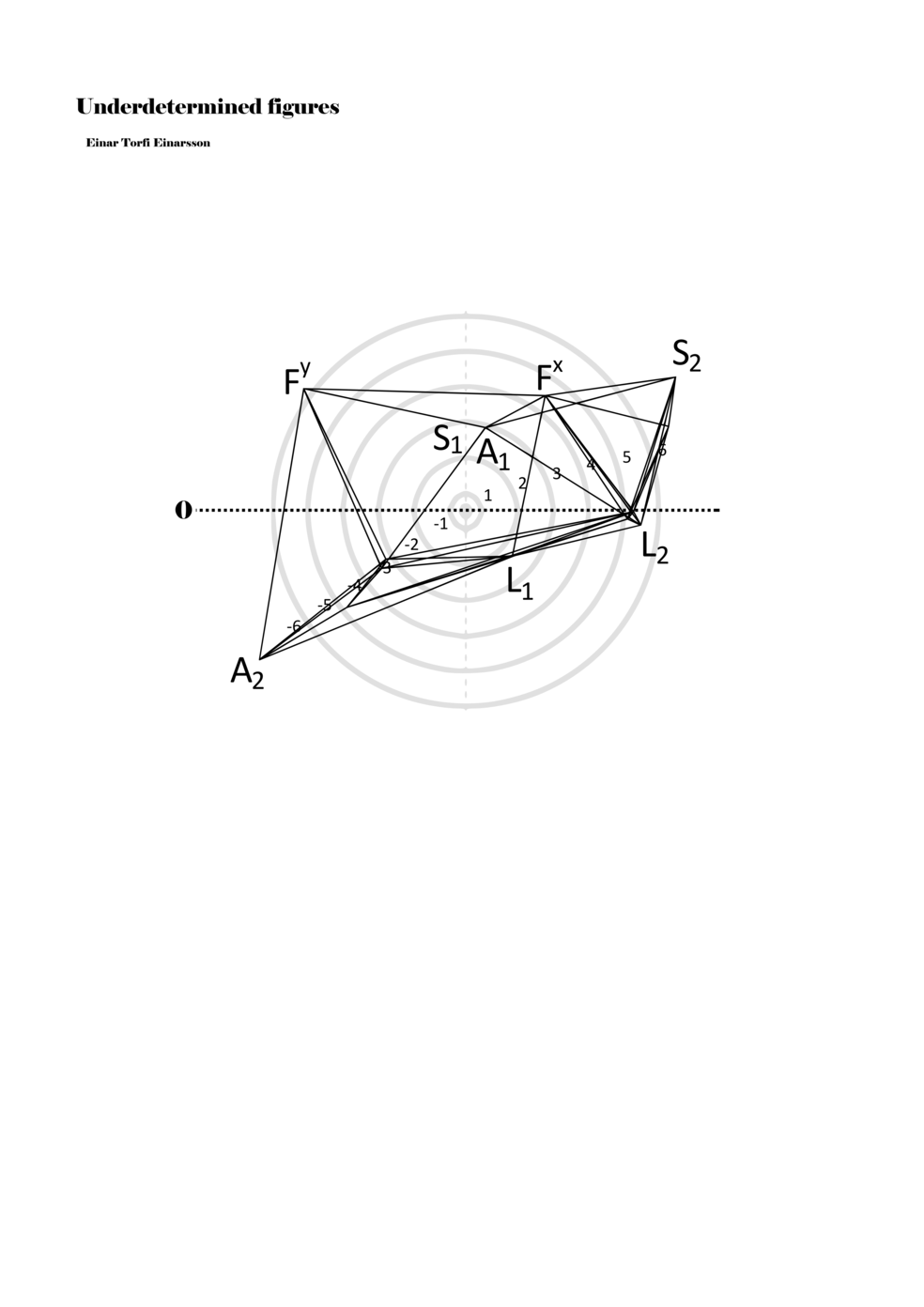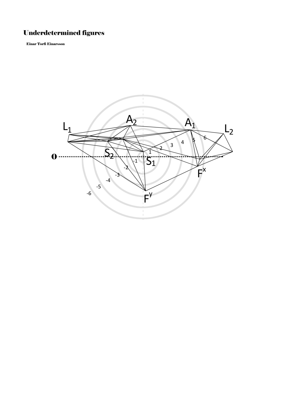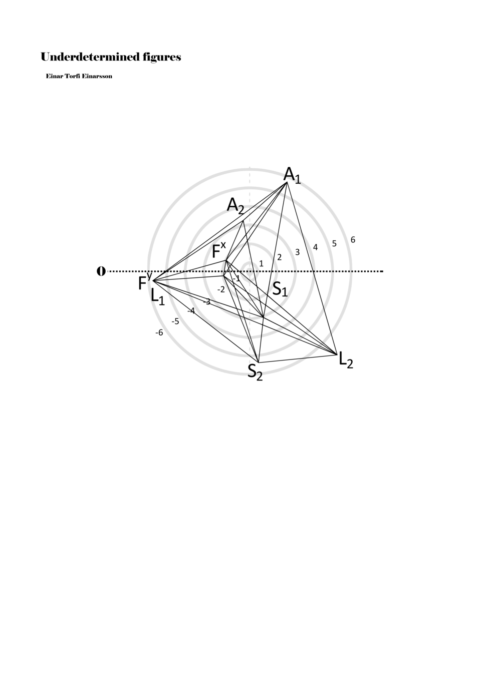 When a figure is placed within this parametric space one can thus read all kinds of changes in value when following the lines in any direction (paths). These number rows are then assigned specific physical parameters, which then operate as instructions for performers. In example 2 we see one figure placed within the field. Indicators (F, L, A, S, see details below) denote starting points (or the initial ‘posture’ of the performer) – that is, where a given parameter initiates when performing the figure. A path is chosen by the performer for each indicator/parameter but from each indicator there are several possible paths and only one path is chosen. The rule is, follow a line from the indicator to the next point (where lines join) in the figure. So, for each parameter there is a line from the indicator to the next point (or node) resulting in a change in value for that parameter. Importantly, when performing the figure all parameters are active, so the performer aims to perform all the chosen paths simultaneously. In example 2, Fx (force) initiates around -3.3 and can proceed through several paths to another point: -2, -1, +2, or -2.8, and so on. The same goes for the other indicators. Each figure is therefore a set of paths indicating a change in certain parameters, and all these paths are played simultaneously for the duration of the figure (each figure is always performed for around 2–3 seconds).