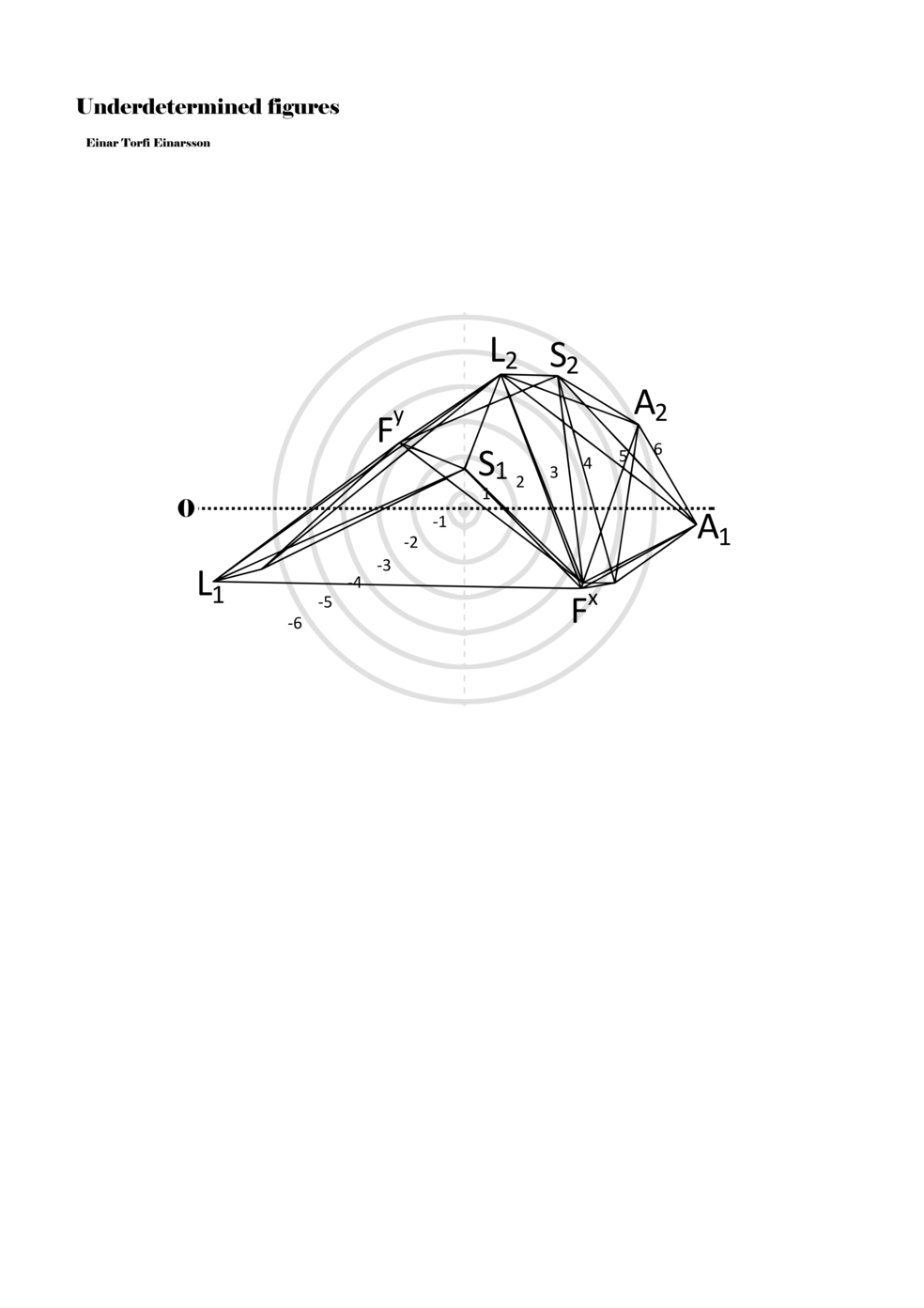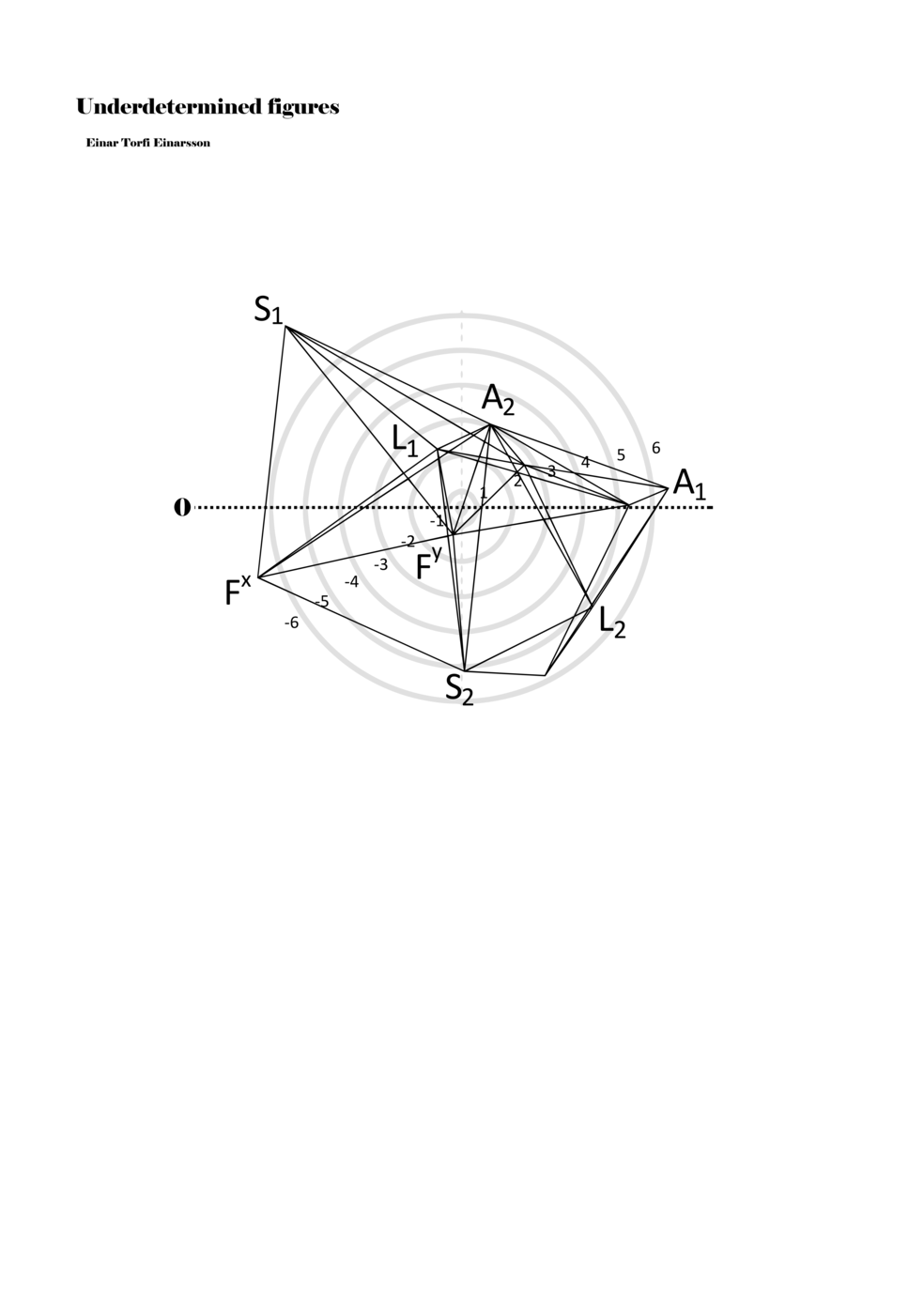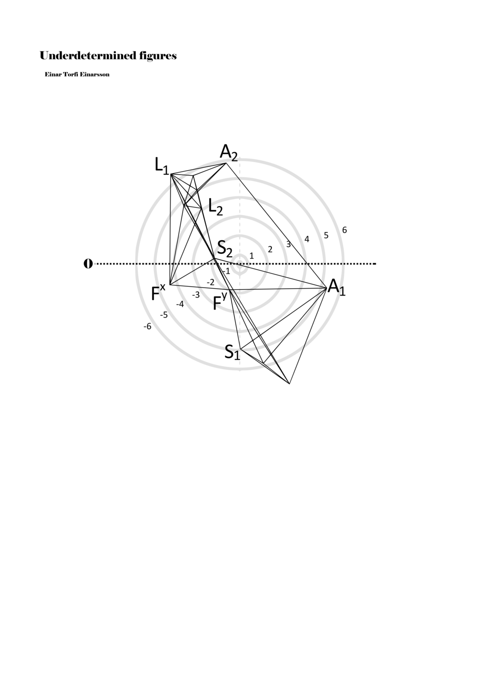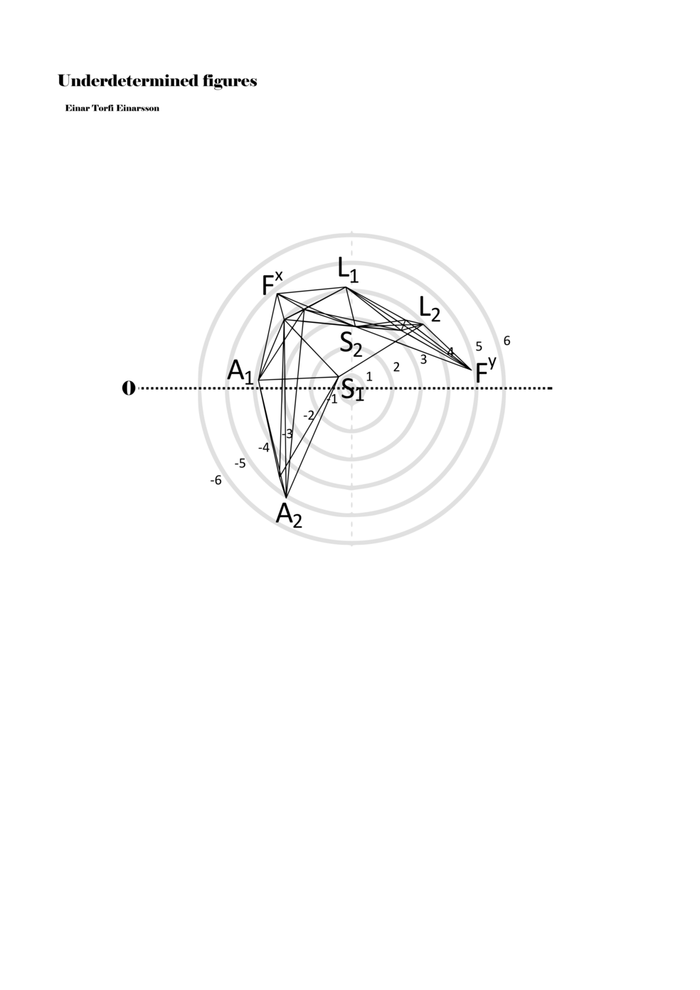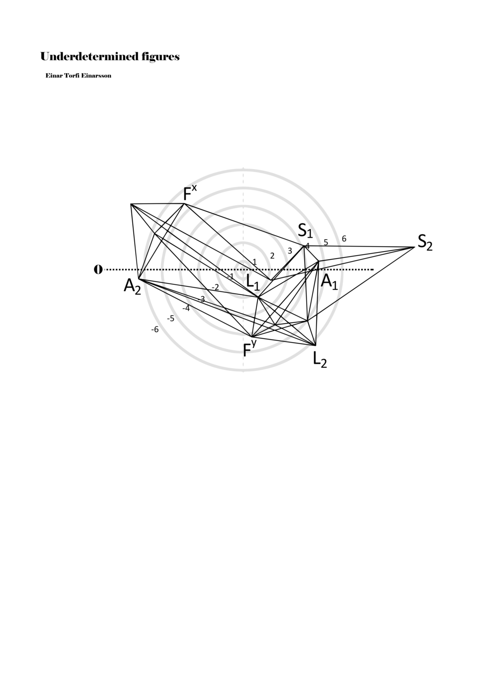 When a figure is placed within this parametric space one can thus read all kinds of changes in value when following the lines in any direction (paths). These number rows are then assigned specific physical parameters, which then operate as instructions for performers. In example 2 we see one figure placed within the field. Indicators (F, L, A, S, see details below) denote starting points (or the initial ‘posture’ of the performer) – that is, where a given parameter initiates when performing the figure. A path is chosen by the performer for each indicator/parameter but from each indicator there are several possible paths and only one path is chosen. The rule is, follow a line from the indicator to the next point (where lines join) in the figure. So, for each parameter there is a line from the indicator to the next point (or node) resulting in a change in value for that parameter. Importantly, when performing the figure all parameters are active, so the performer aims to perform all the chosen paths simultaneously. In example 2, Fx (force) initiates around -3.3 and can proceed through several paths to another point: -2, -1, +2, or -2.8, and so on. The same goes for the other indicators. Each figure is therefore a set of paths indicating a change in certain parameters, and all these paths are played simultaneously for the duration of the figure (each figure is always performed for around 2–3 seconds).