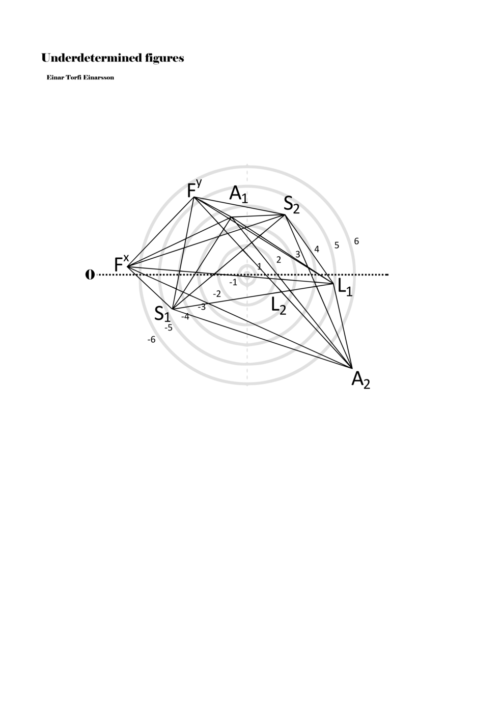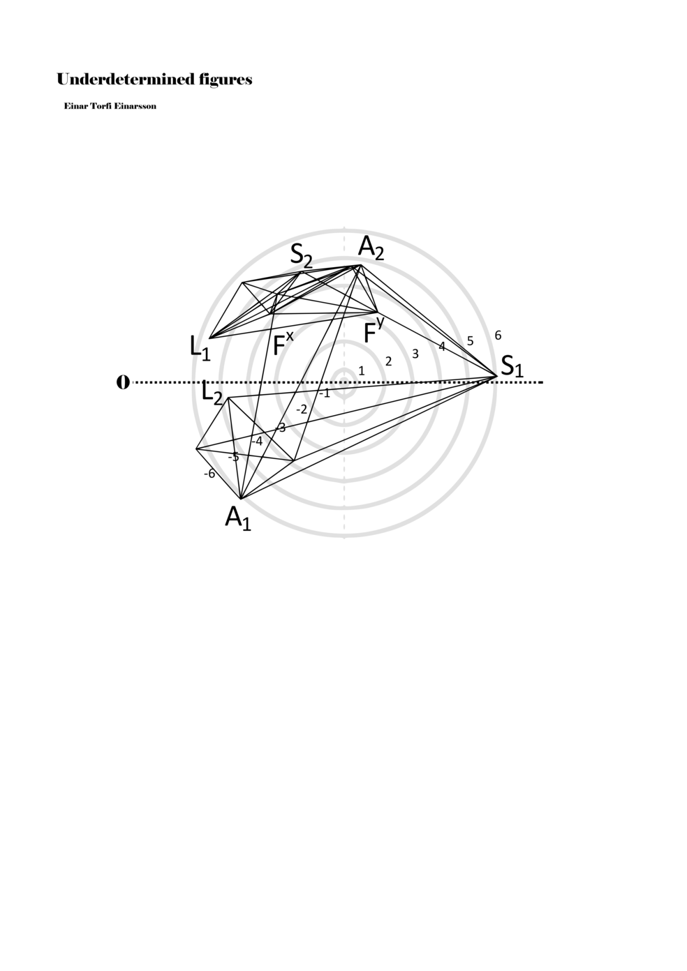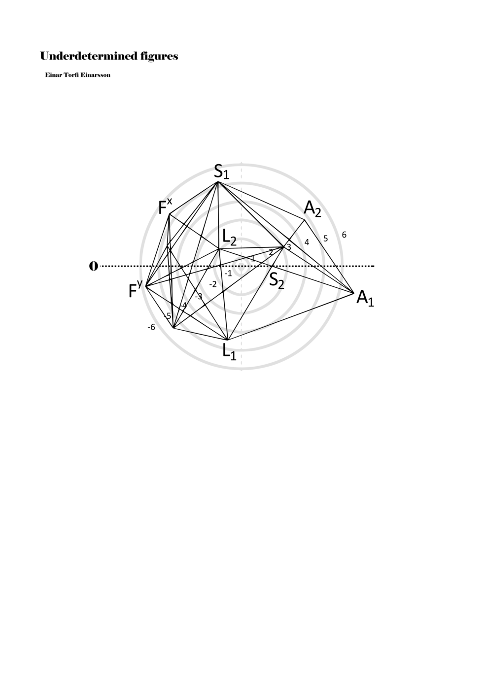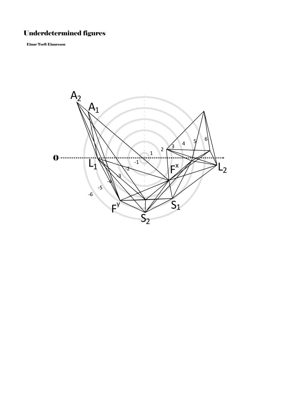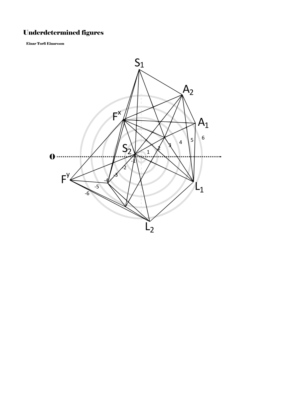 When a figure is placed within this parametric space one can thus read all kinds of changes in value when following the lines in any direction (paths). These number rows are then assigned specific physical parameters, which then operate as instructions for performers. In example 2 we see one figure placed within the field. Indicators (F, L, A, S, see details below) denote starting points (or the initial ‘posture’ of the performer) – that is, where a given parameter initiates when performing the figure. A path is chosen by the performer for each indicator/parameter but from each indicator there are several possible paths and only one path is chosen. The rule is, follow a line from the indicator to the next point (where lines join) in the figure. So, for each parameter there is a line from the indicator to the next point (or node) resulting in a change in value for that parameter. Importantly, when performing the figure all parameters are active, so the performer aims to perform all the chosen paths simultaneously. In example 2, Fx (force) initiates around -3.3 and can proceed through several paths to another point: -2, -1, +2, or -2.8, and so on. The same goes for the other indicators. Each figure is therefore a set of paths indicating a change in certain parameters, and all these paths are played simultaneously for the duration of the figure (each figure is always performed for around 2–3 seconds).