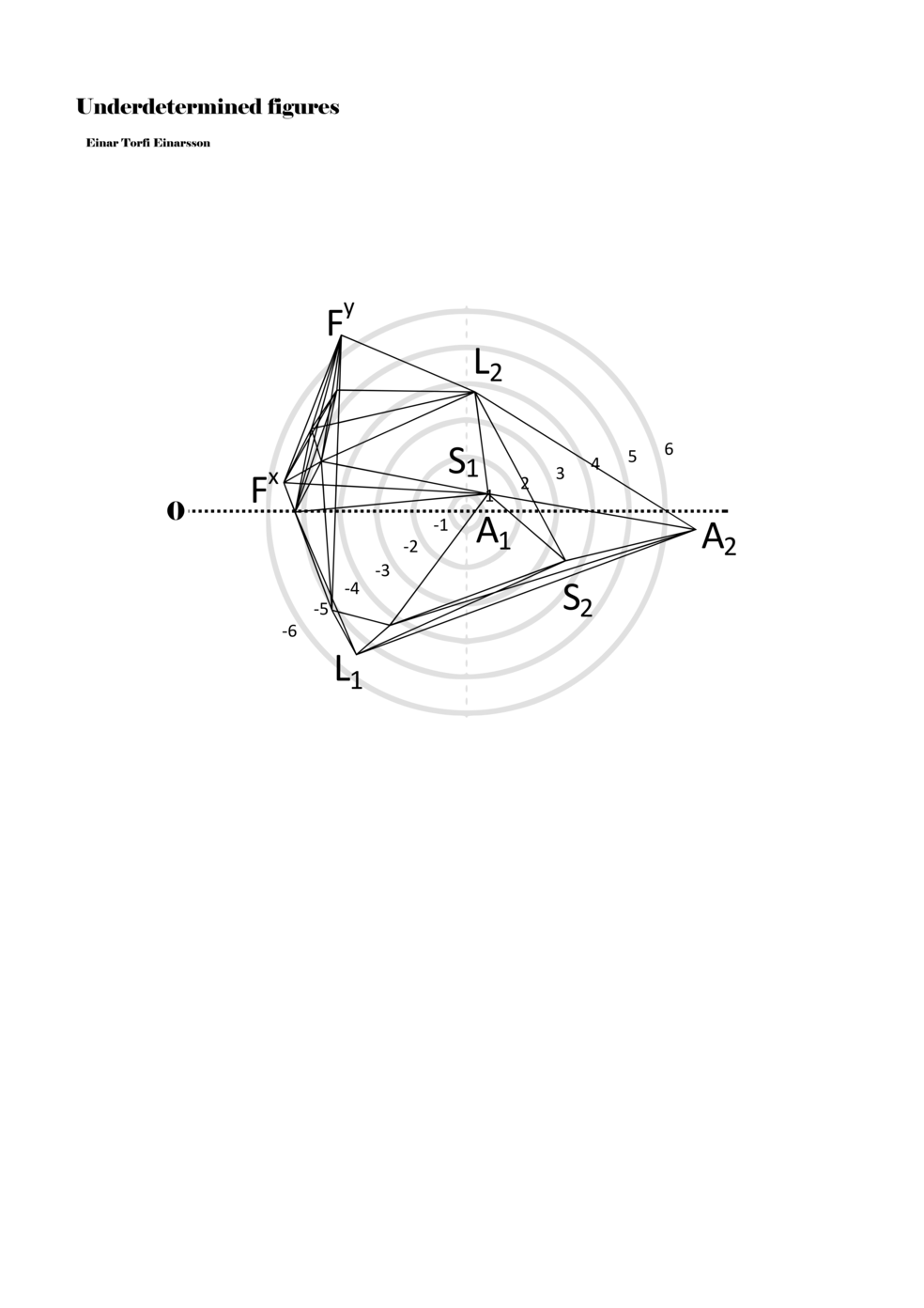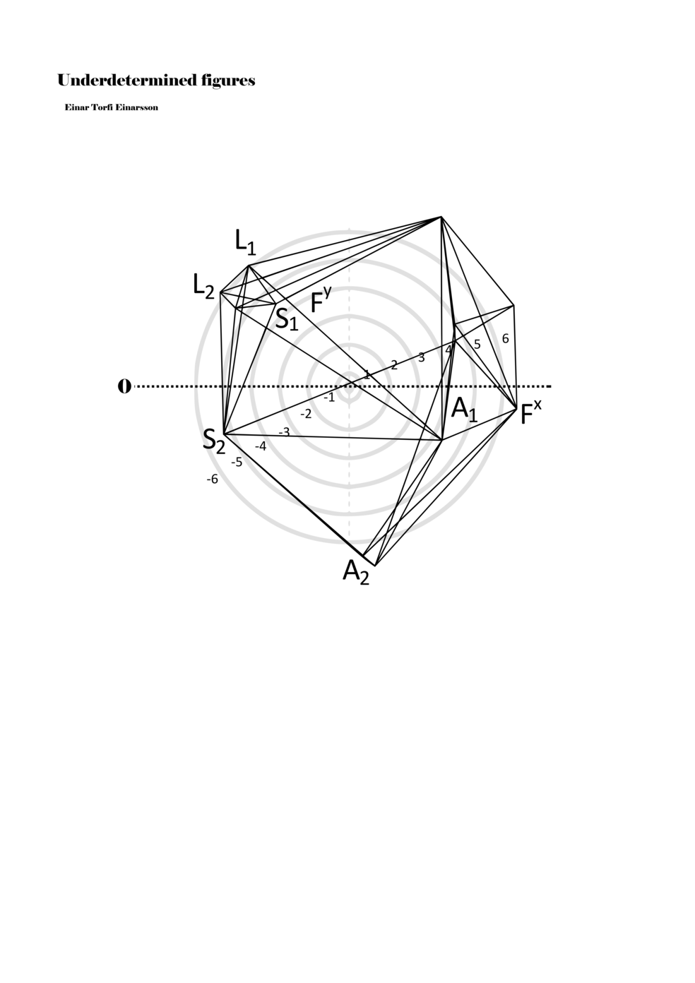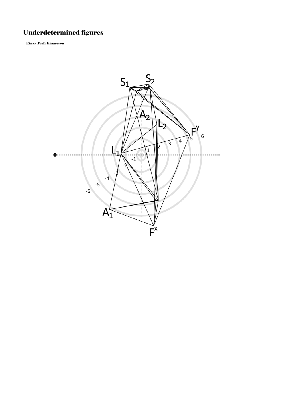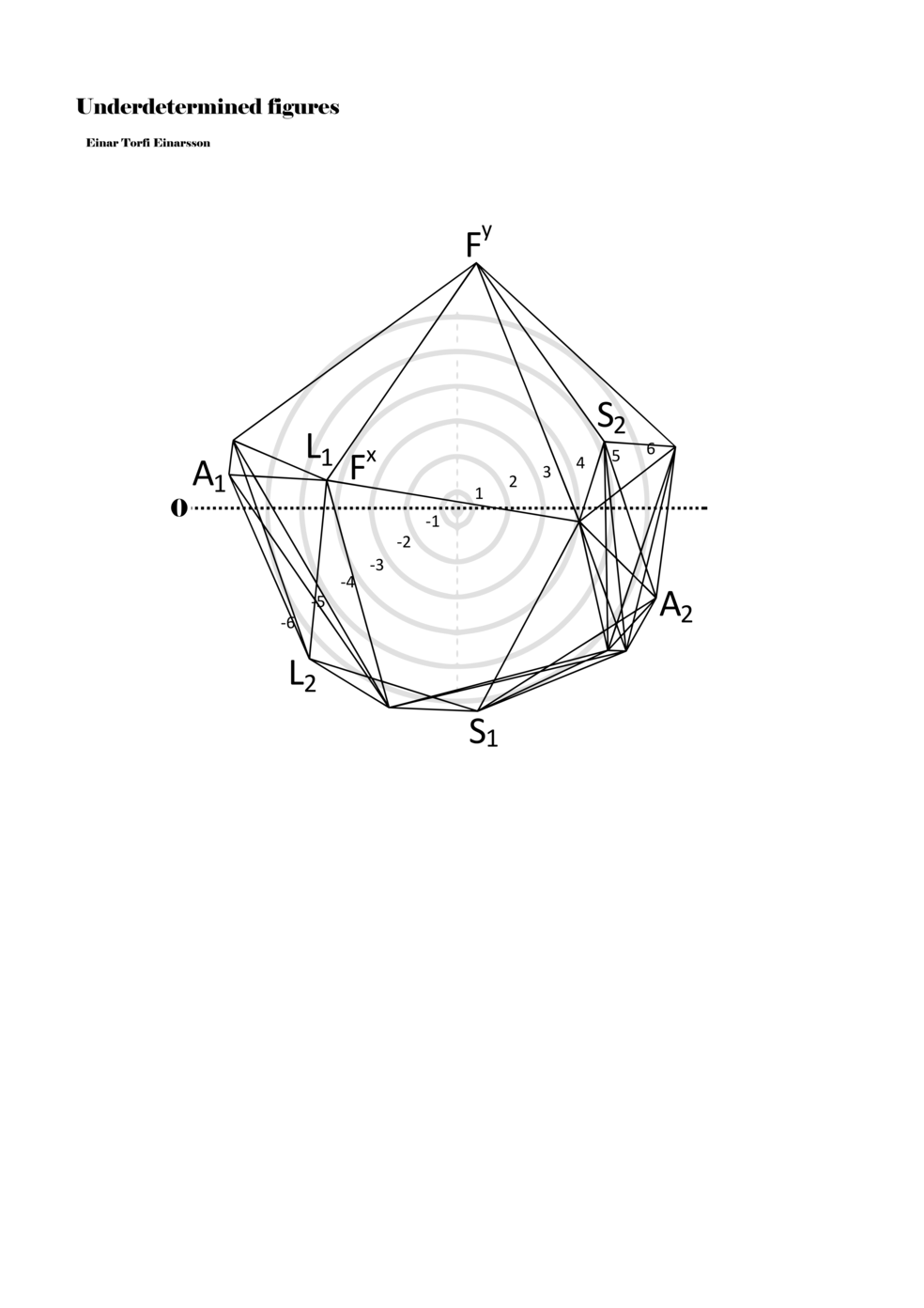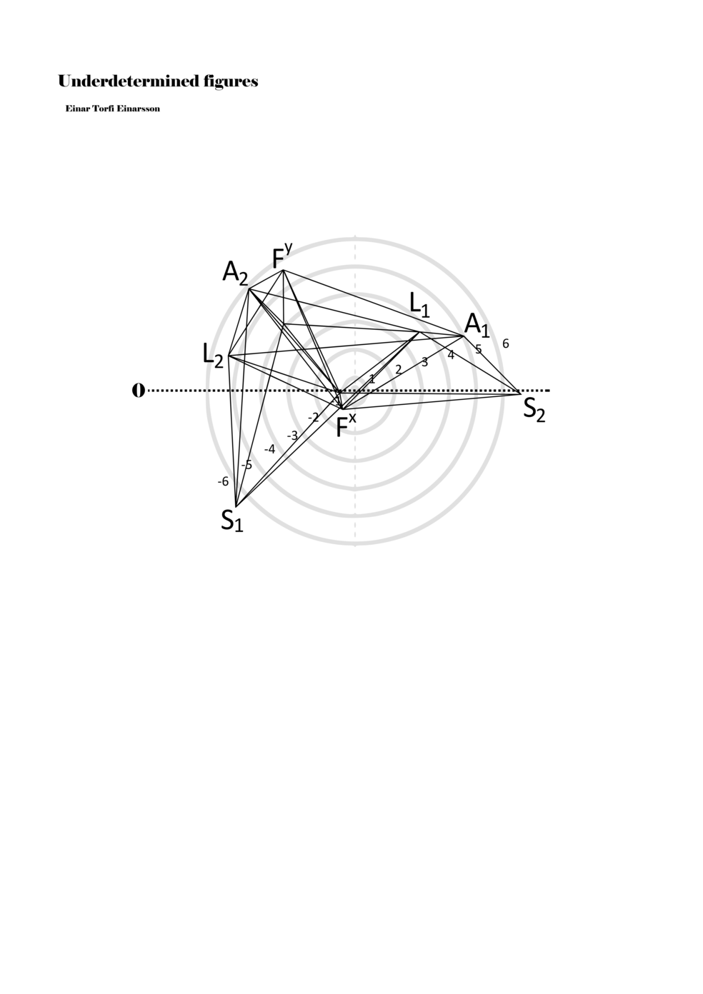 When a figure is placed within this parametric space one can thus read all kinds of changes in value when following the lines in any direction (paths). These number rows are then assigned specific physical parameters, which then operate as instructions for performers. In example 2 we see one figure placed within the field. Indicators (F, L, A, S, see details below) denote starting points (or the initial ‘posture’ of the performer) – that is, where a given parameter initiates when performing the figure. A path is chosen by the performer for each indicator/parameter but from each indicator there are several possible paths and only one path is chosen. The rule is, follow a line from the indicator to the next point (where lines join) in the figure. So, for each parameter there is a line from the indicator to the next point (or node) resulting in a change in value for that parameter. Importantly, when performing the figure all parameters are active, so the performer aims to perform all the chosen paths simultaneously. In example 2, Fx (force) initiates around -3.3 and can proceed through several paths to another point: -2, -1, +2, or -2.8, and so on. The same goes for the other indicators. Each figure is therefore a set of paths indicating a change in certain parameters, and all these paths are played simultaneously for the duration of the figure (each figure is always performed for around 2–3 seconds).