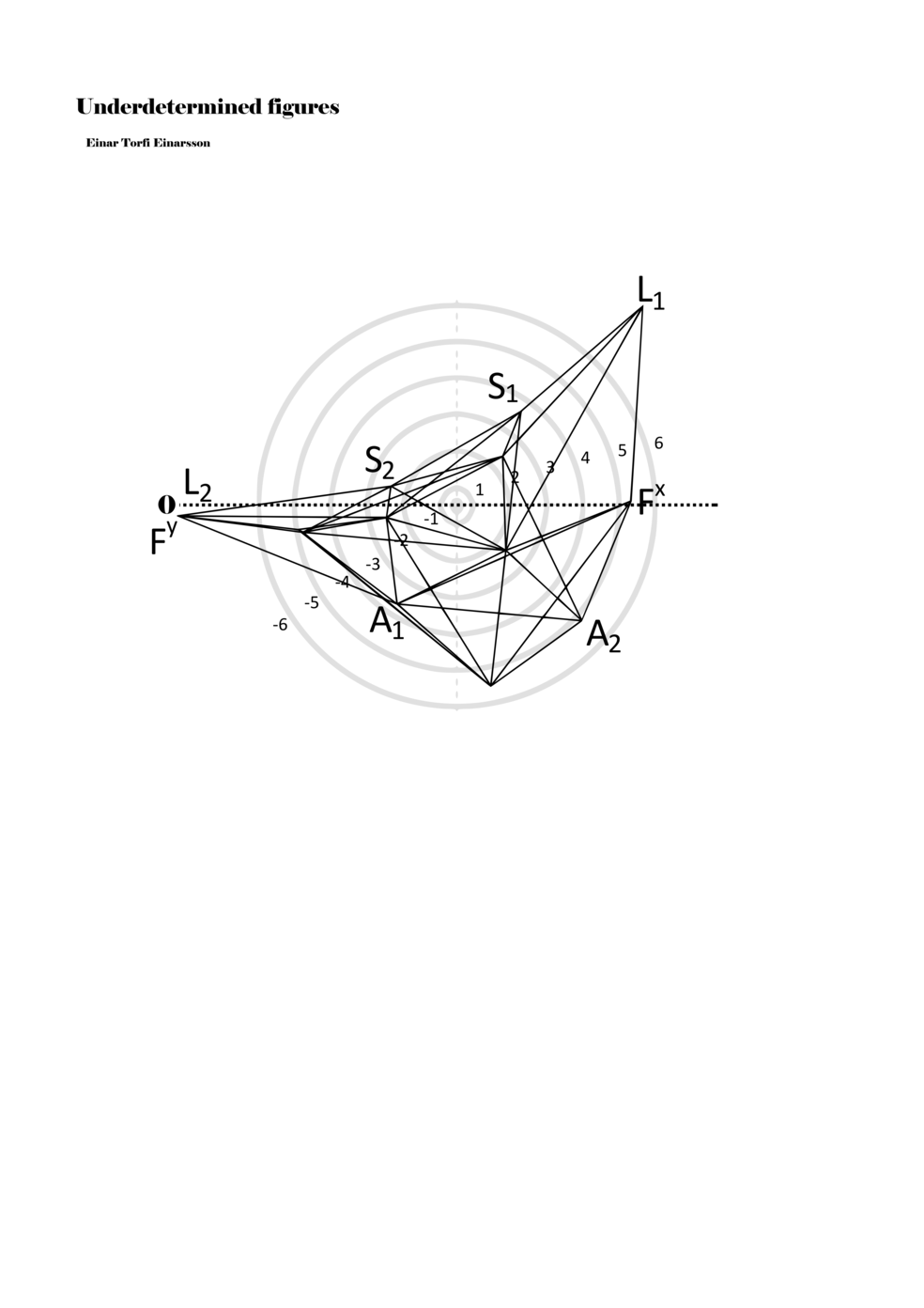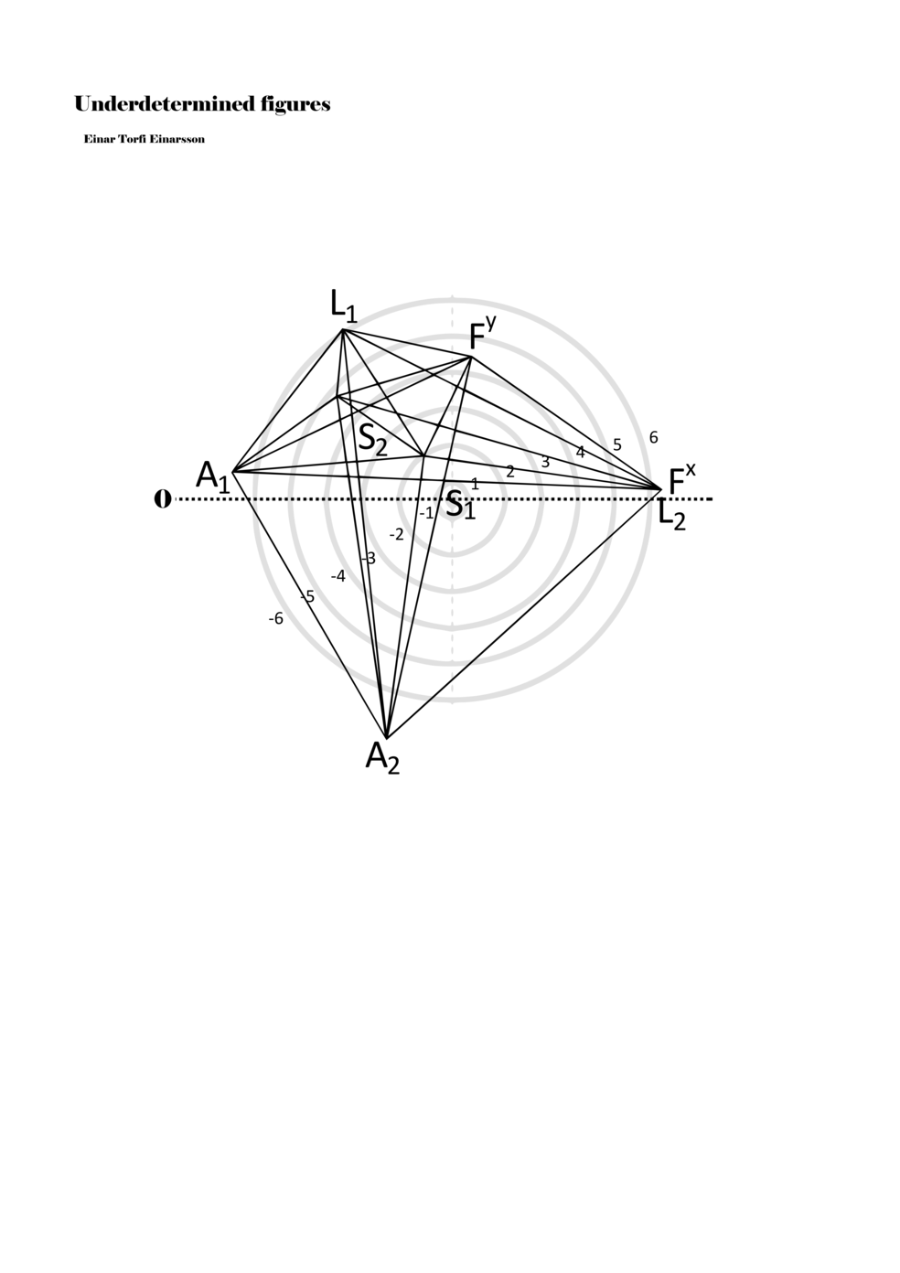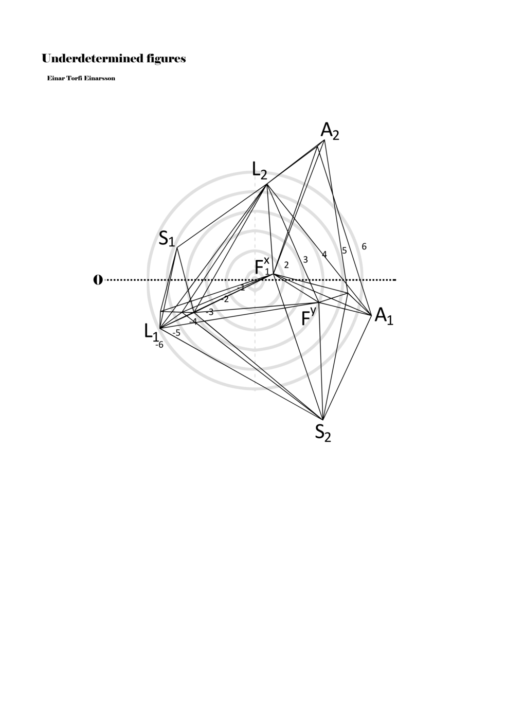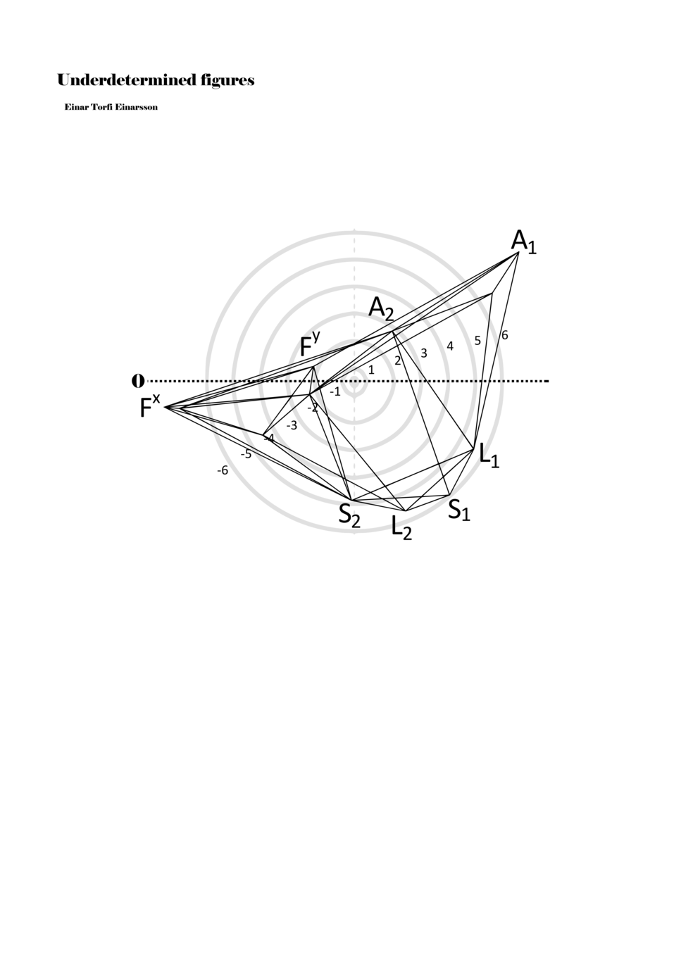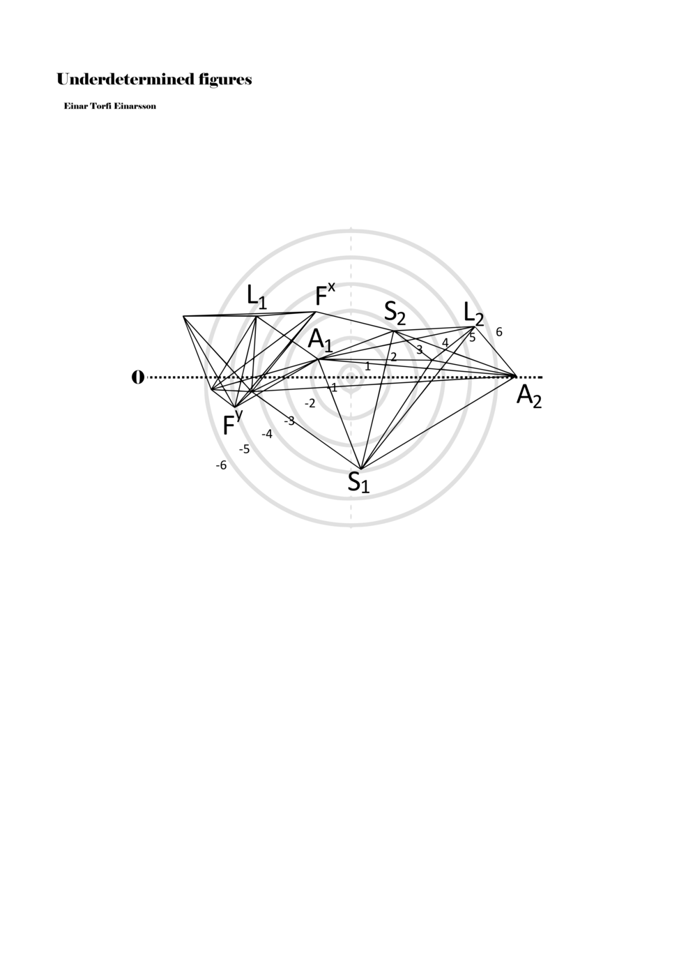 When a figure is placed within this parametric space one can thus read all kinds of changes in value when following the lines in any direction (paths). These number rows are then assigned specific physical parameters, which then operate as instructions for performers. In example 2 we see one figure placed within the field. Indicators (F, L, A, S, see details below) denote starting points (or the initial ‘posture’ of the performer) – that is, where a given parameter initiates when performing the figure. A path is chosen by the performer for each indicator/parameter but from each indicator there are several possible paths and only one path is chosen. The rule is, follow a line from the indicator to the next point (where lines join) in the figure. So, for each parameter there is a line from the indicator to the next point (or node) resulting in a change in value for that parameter. Importantly, when performing the figure all parameters are active, so the performer aims to perform all the chosen paths simultaneously. In example 2, Fx (force) initiates around -3.3 and can proceed through several paths to another point: -2, -1, +2, or -2.8, and so on. The same goes for the other indicators. Each figure is therefore a set of paths indicating a change in certain parameters, and all these paths are played simultaneously for the duration of the figure (each figure is always performed for around 2–3 seconds).