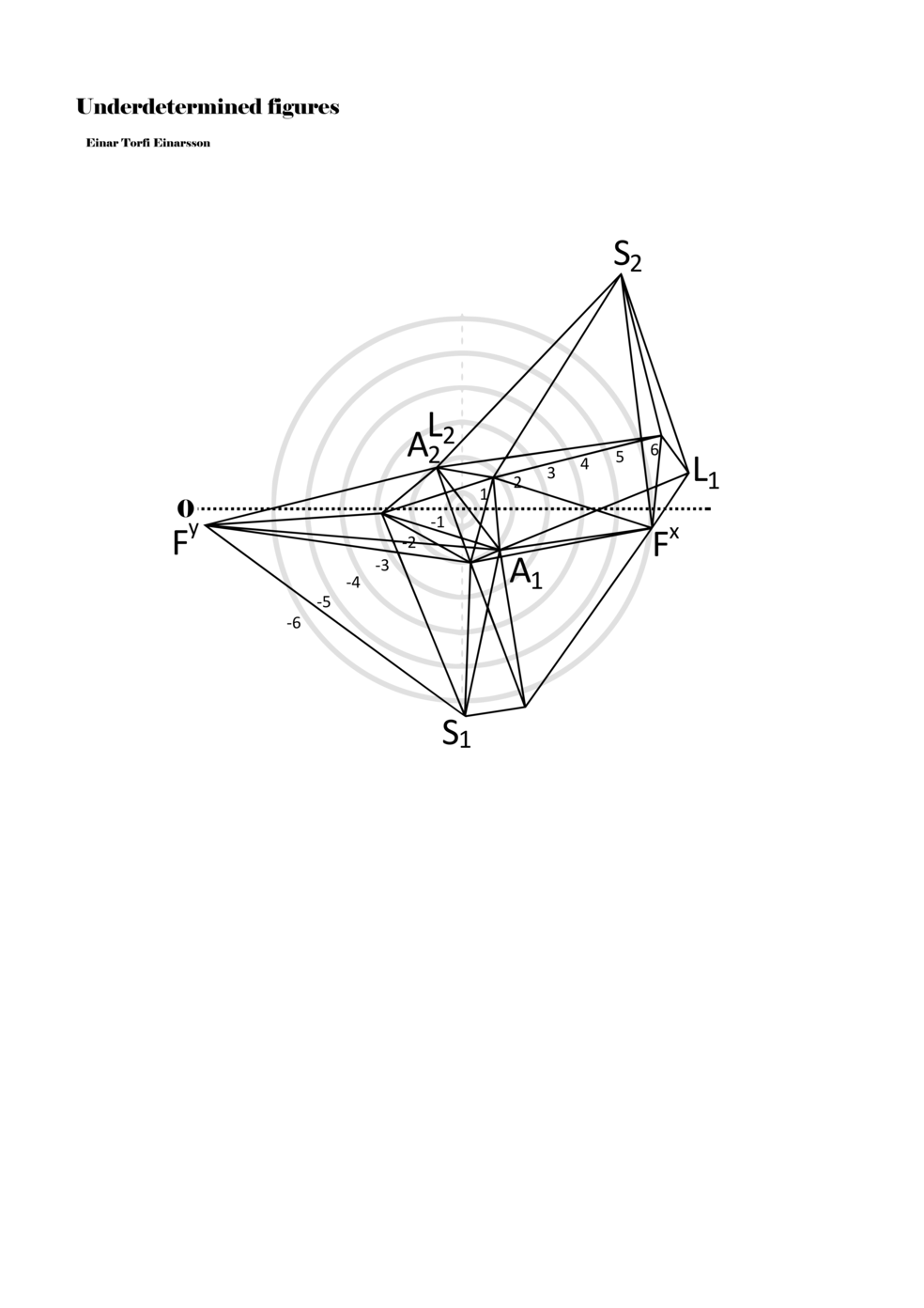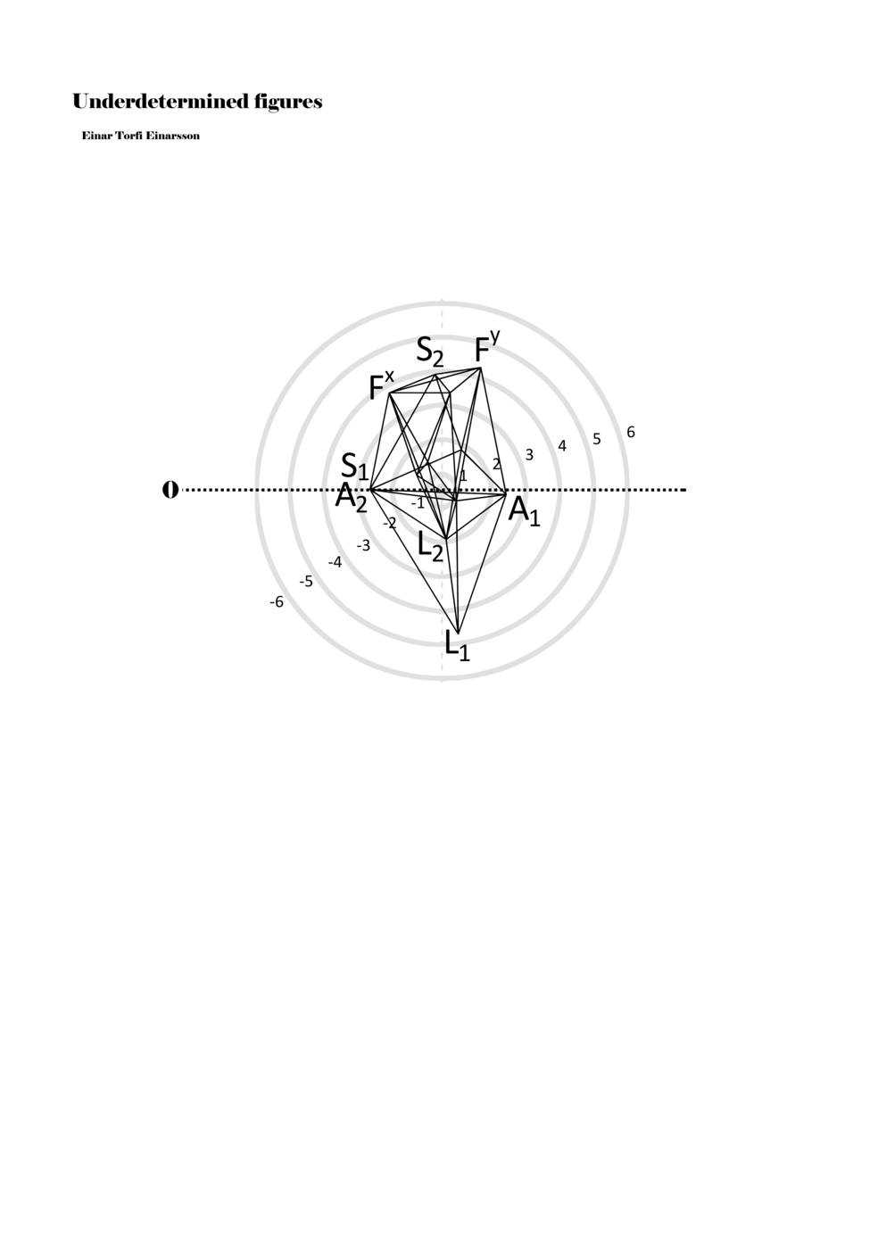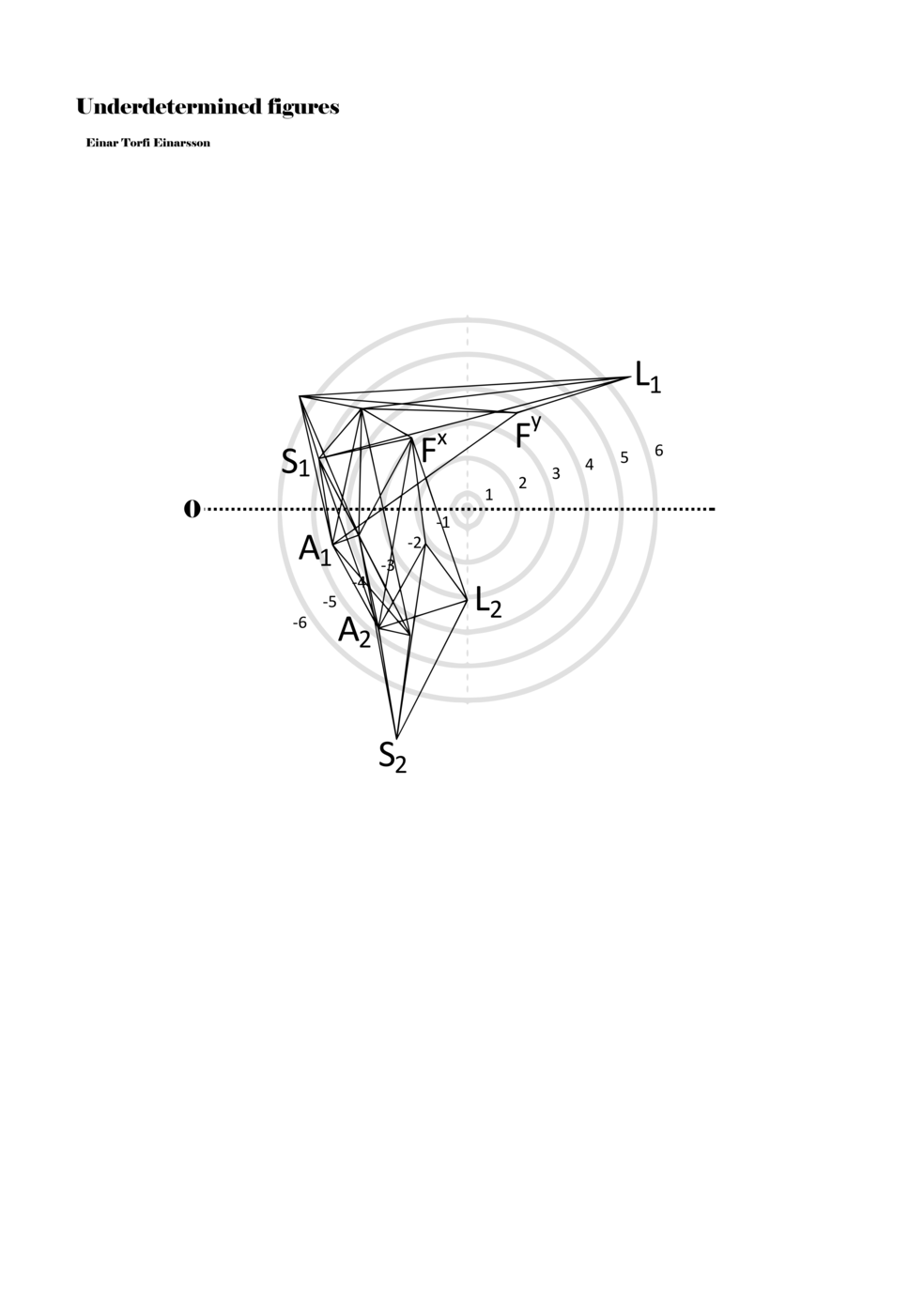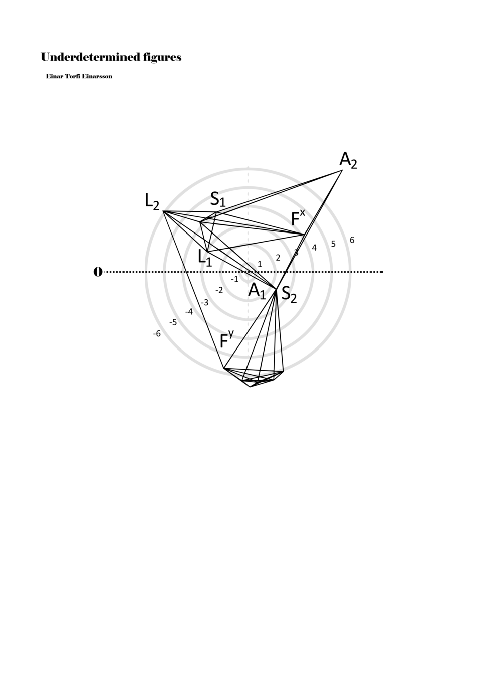 Being fascinated by the p-o-figures derived from the data of the EEG scan of the Proto-Objects project, I set out to find ways to include them in my work as notations. On the basis of the data from the EEG scan, one hundred three-dimensional figures were derived; however, for the purpose of Underdetermined Figures, one hundred two-dimensional figures were derived from the three-dimensional figures. It was also necessary to limit the number of connections between points in the p-o-figures in order to adapt it as a material for performative instructions. Thus, the figures included in my work are aspects or perspectives on the three-dimensional figures. Although the figures within the score are two dimensional, the notational context transforms them into multidimensional ‘musical objects’ that indicate abstract physical movements or parameters. As such, proto-scores can be understood to be constellations of abstract distances, localities, movements, connections, and thresholds. Proto-scores are specific (even detailed) yet underdetermined and virtual (until actualised in a particular context).