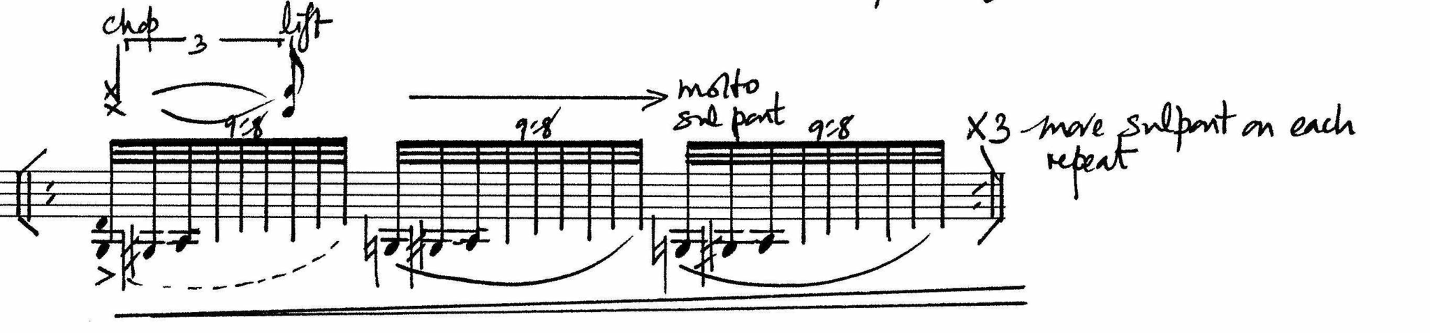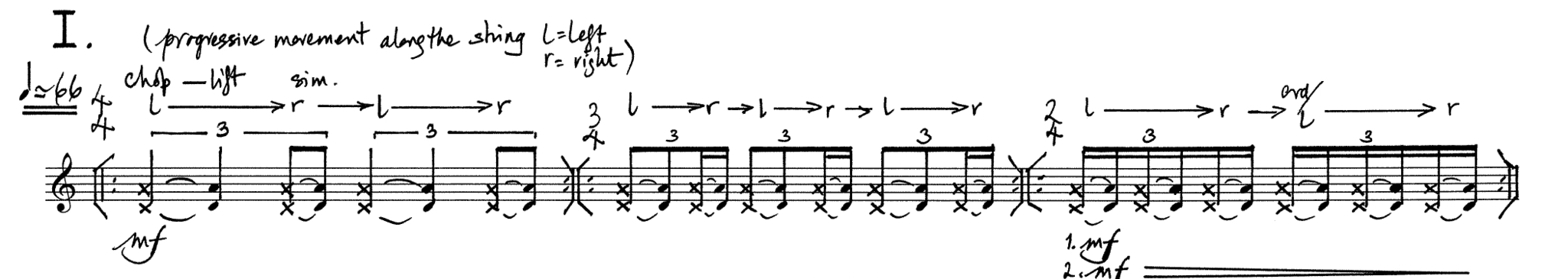 This movement deconstructs my embodied knowledge in order to create new kinds of sonic materials. The different materials that have been introduced and elaborated on in the first two movements are now being confronted with one another in new ways. Central to the movement is the action of decoupling right arm/hand movements. Liza’s instructions describe how the left and right hands should become less coordinated with one another, busy with their respective separate activities.