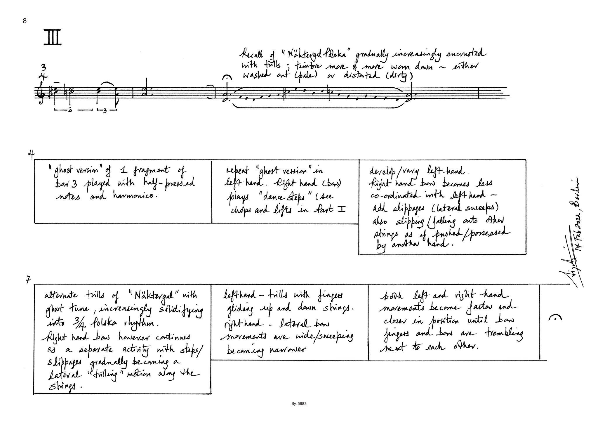 7: alternate trills of Näktergal with ghost tune, increasingly solidifying into 3/4 polska rhythm. Right hand bow however continues as a separate activity with steps/slippages gradually becoming a lateral ‘trilling’ motion along the strings.