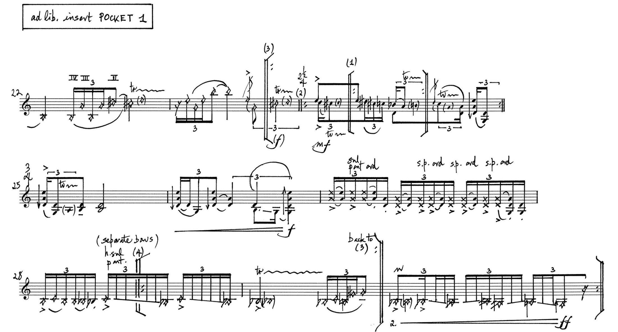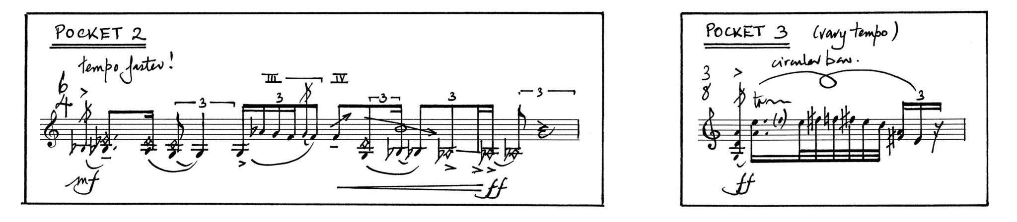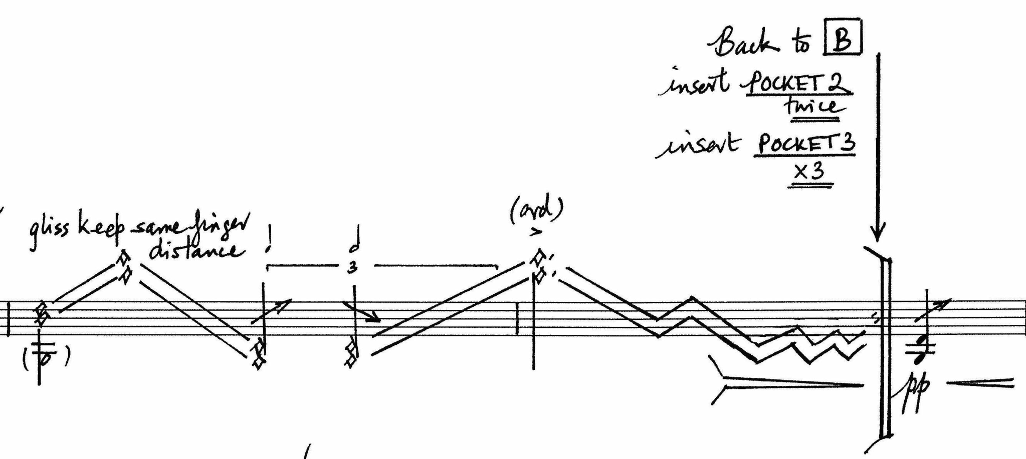 In the material of the first sketch, there is a certain glissando figure, which I express that I like a lot. Liza then sits down at her desk to expand the material of the figure further and compose a section based entirely on it. She suggests that I can insert this material at will, when I find it suitable, possibly in different moments from time to time when I play the piece. She calls it a pocket (Figure 8). Notation-wise, it is left open as a separate ‘bubble’ in the score on the new page on which it was written. Thereby, it is breaking the linearity of the score and leaving the decision open to me where to place it. As I play the piece, searching for where to insert the pocket, I spontaneously decide to insert the pocket twice during the first movement. Liza is excited about this idea, and it becomes an important form element that we decide to keep. The pocket carries enough recognisability to observe its coming back, and we experience how the movement is enriched by the idea of hearing the material again. Form has emerged from my spontaneous way of reacting to the material, of suggesting-by-doing. Developed over the compositional span of the work is a refined system of short pockets. The second movement comprises two pockets that are inserted a total of seven times (Figures 9–10). When I play the second movement, I insert the pockets where I find it fitting, before navigating back to the initial path of the score.