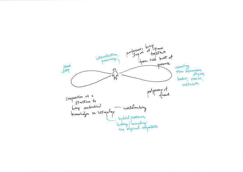 However, apart from this suggested perspective of ecology in the process of creating Speculative Polskas, there is another dimension of ecology that stands out as important. As I engage with Speculative Polskas, I see myself as an actor within the figure-eight loop, closely connected with different temporal dimensions. I develop a temporal ecological perspective connected to the dimensions of time that inhabit my performance practice. In this temporal ecological framework of the piece, the tradition of the Swedish folk music comes alive through my embodied knowing. Through the act of bringing the tradition into our work, the tradition is carried into the future and developed through our shared work. Furthermore, my imagination in the act of performance, as I engage with the challenged linearity of the score, suggests a temporal messiness, where I use imaginative abilities of the outcome of my decisions along with the presence of the decoupling of my body parts. Through this perspective, I come to develop an understanding of how my artistic palette is far from an isolated thing. As my personal creative ecosystem, the artistic palette is connected to my larger surrounding culture and environment.