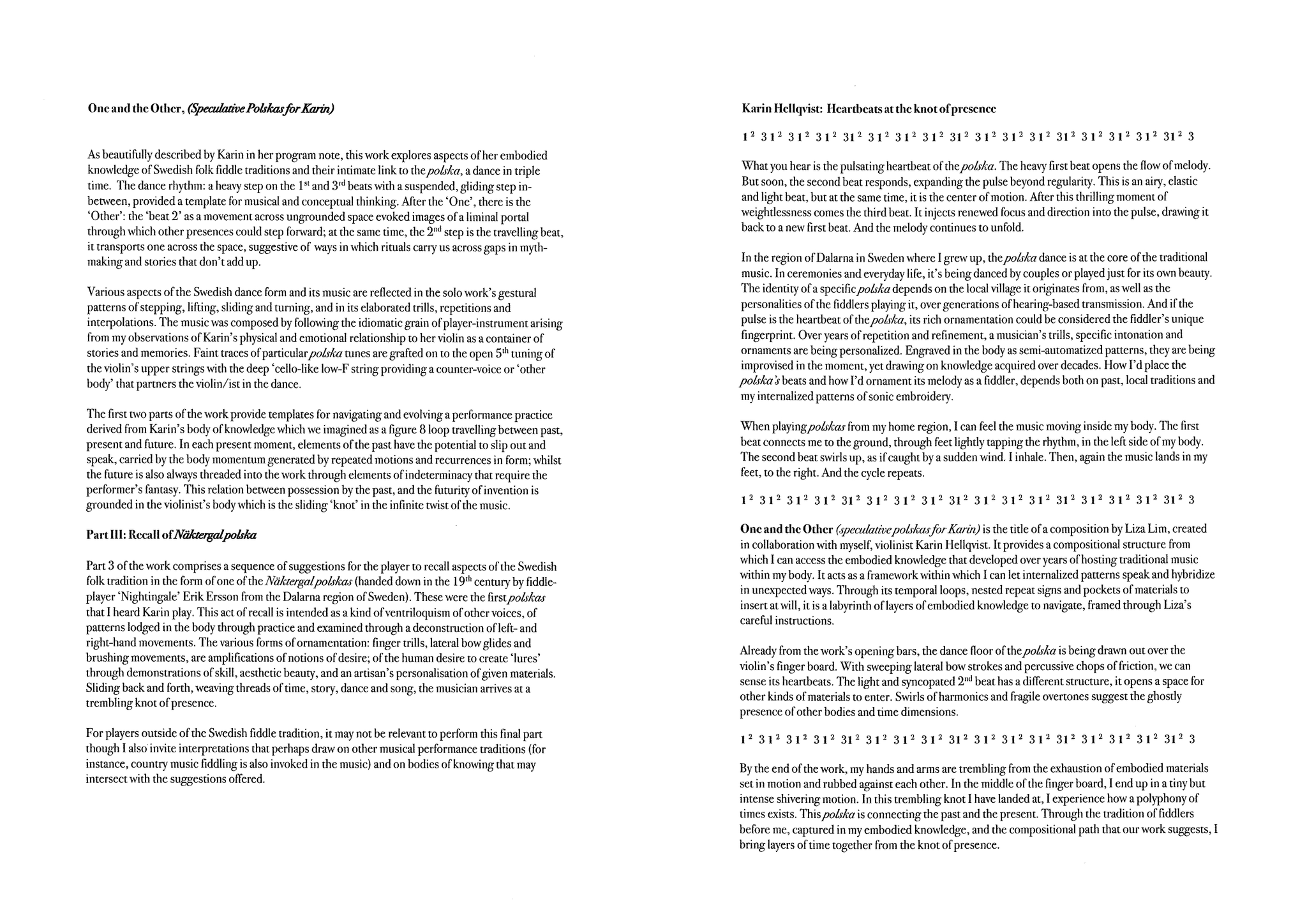 A further glance at the score of Speculative Polskas displays two programme notes of the work, one by Liza and one by me (Lim 2021–22; Hellqvist 2022). Writing programme notes usually is the task of the composer as the authority on the conceptual framework of the work. The presence of my programme note in the score suggests how I as a performer have had the need to describe the work, and how Liza has included it in the preface of the work. In my programme note, written initially as an essay in University of Chicago Press journal Portable Gray (Hellqvist 2022), the body-mindset of the polska is explored, as well as how I experience a temporal polyphony when performing the work. The two programme notes communicate two intertwined narratives of the process, included in the information that accompanies the notated musical score (Figure 12).