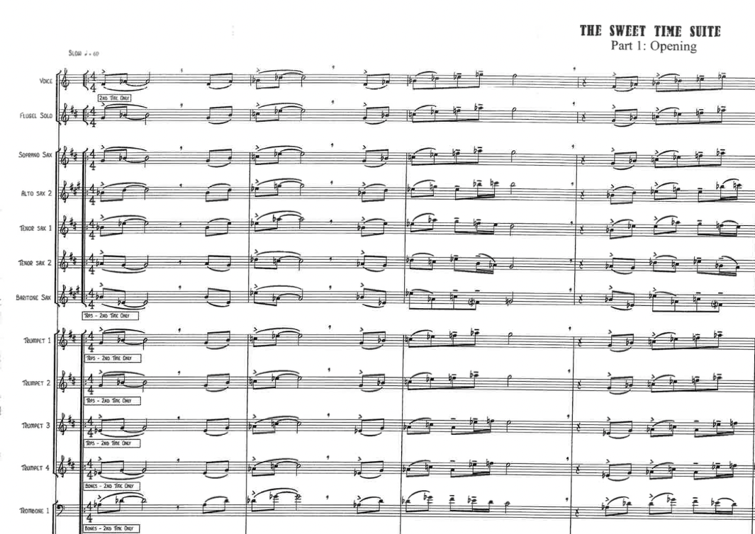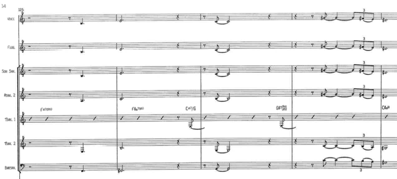 The following two pictures show parts of Kenny Wheeler’s “Sweet Time Suite”. The first picture is the beginning of “Part 1: Opening”, where Winstone sings the main theme in unison with Wheeler on flugelhorn. This is what happens the most throughout the suite. Picture 2 shows a part of the backings in the Tenor-Saxophone solo in “Part 2 – For H.” where Winstone again sings Wheeler’s line as a doubling, but is used as an instrumental voice in the backings for the solo. In these passages, Winstone's blend is so close to the horns that one would not recognize that there is a vocalist singing in the section if not listening extremely closely.