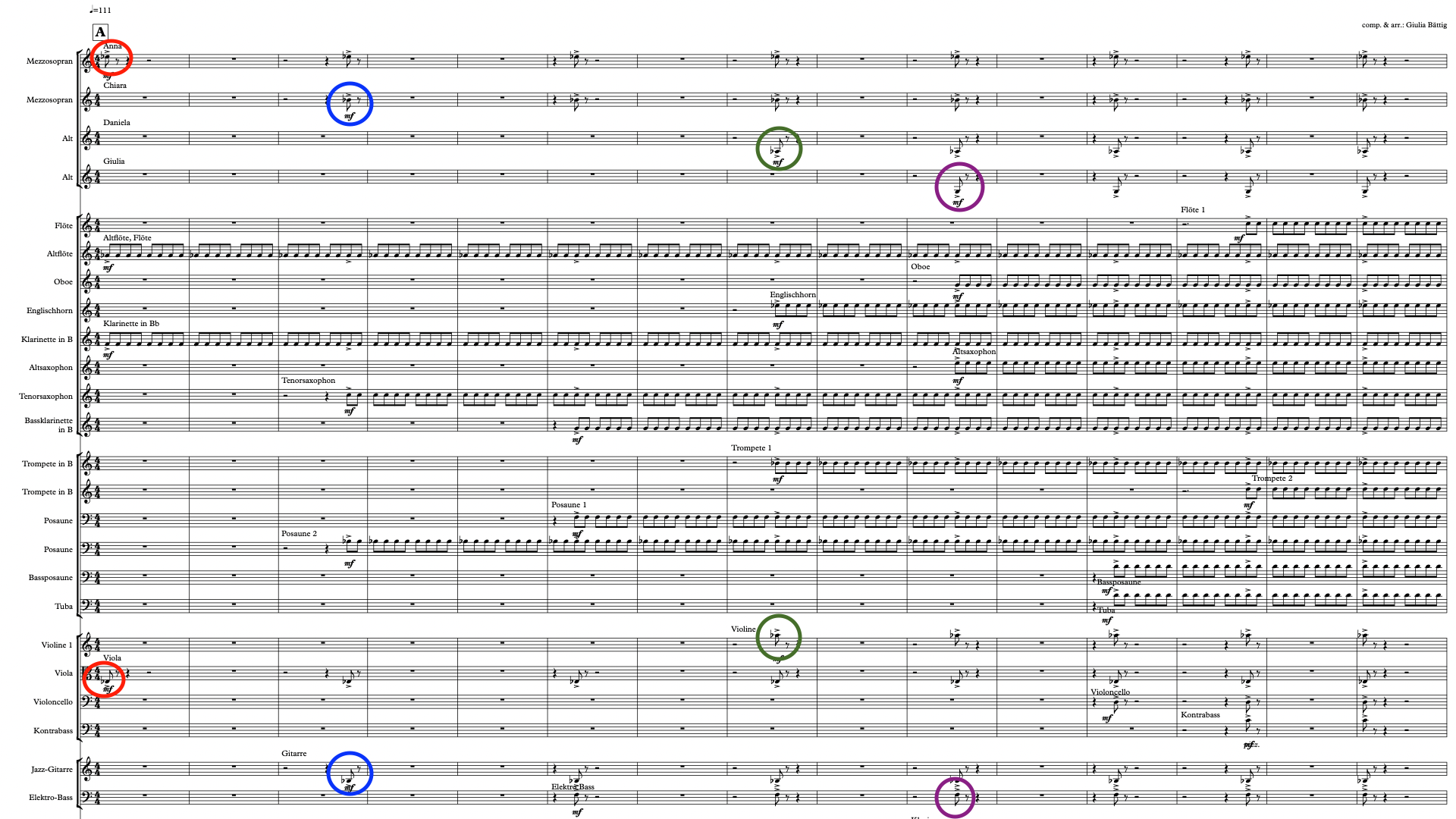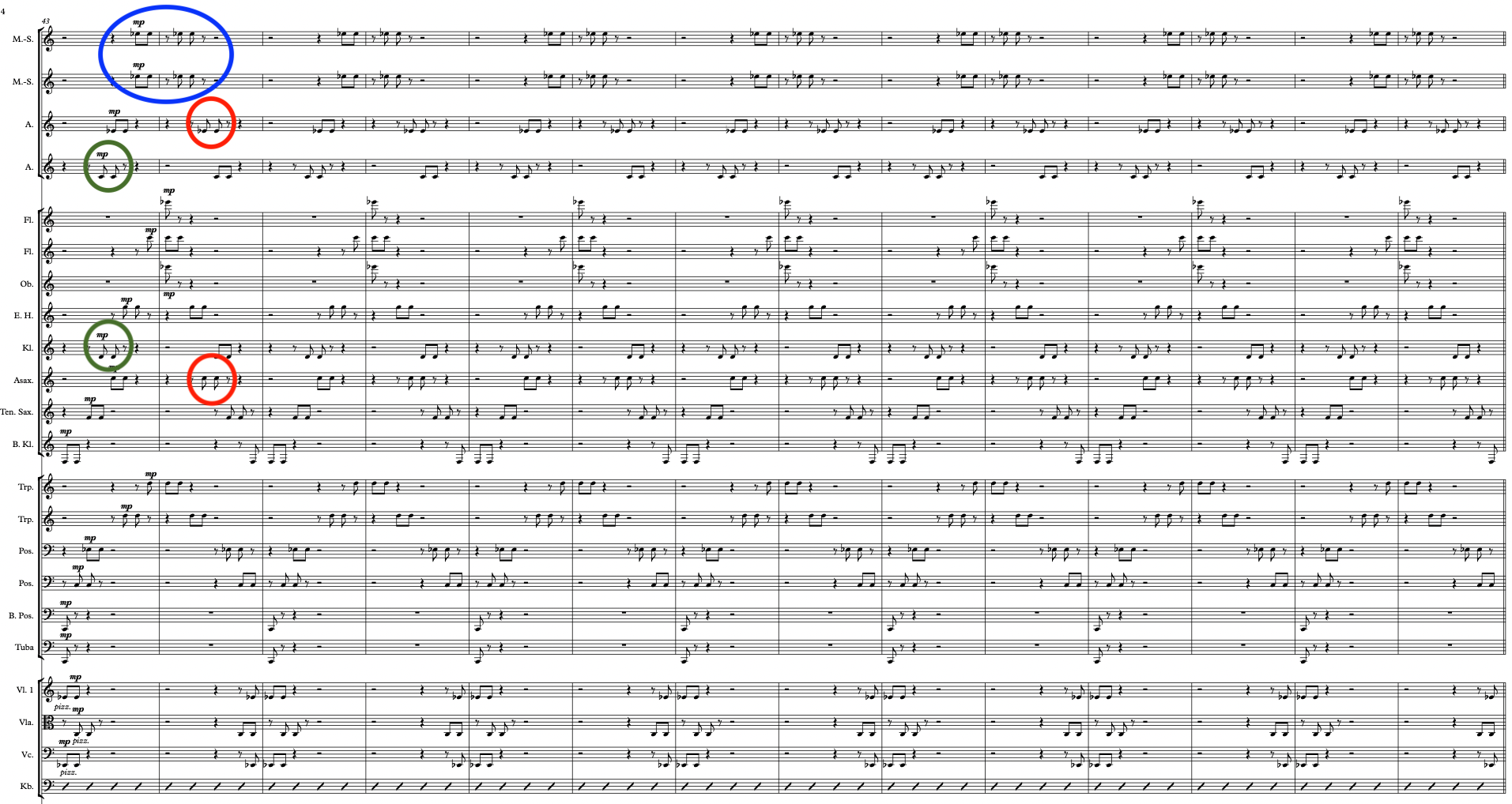 In the bass solo I wanted to use the voices in two different ways. The two lower voices (circled green and red) I paired with the clarinet and the alto saxophone, two instruments that fit the range of the two vocalists very well and would blend with the horns in a way that yone can almost not tell that there were voices included in these sections, except for the slight alternation of the color that adding a voice gives to the music, as well as again the percussive difference of the attack of "du" we used to voice these hits.
