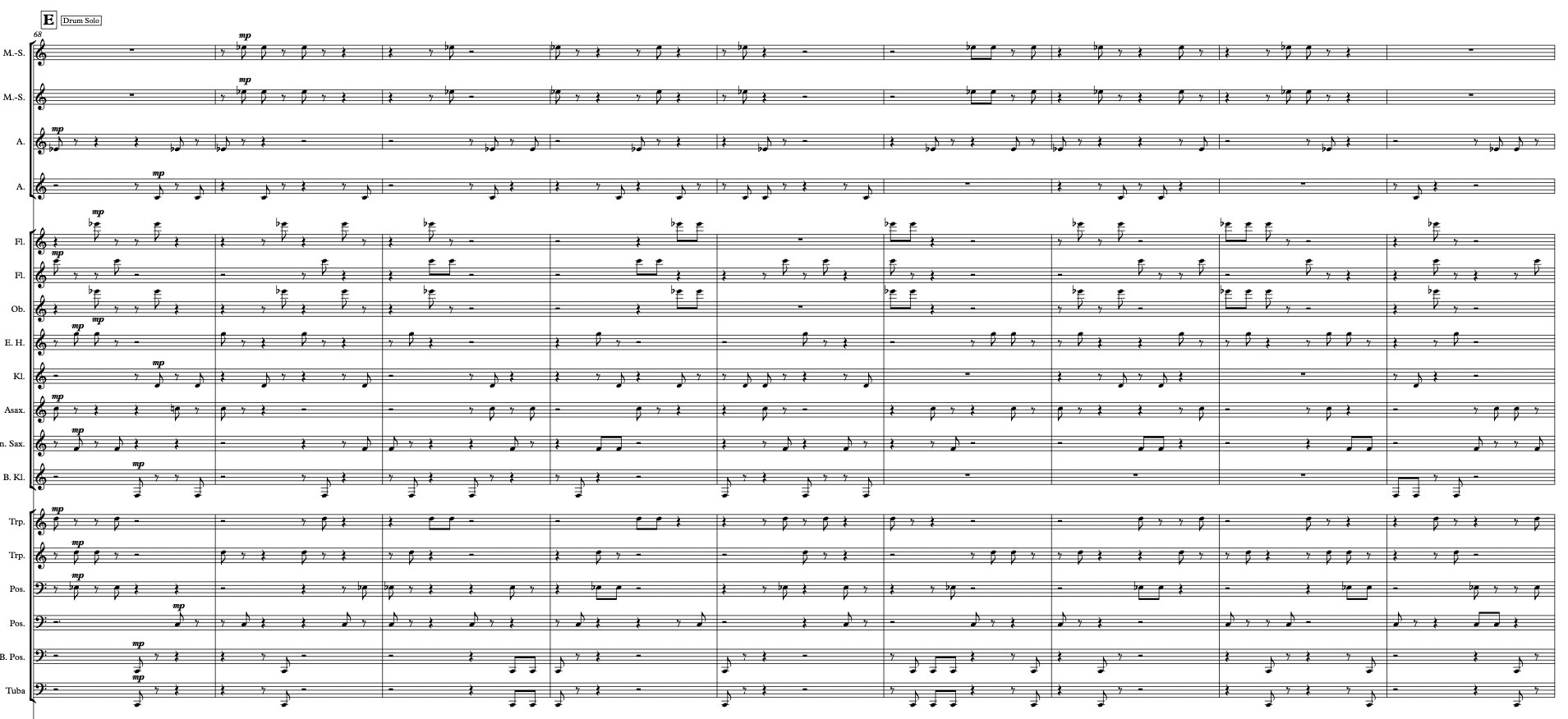 Later in the piece during the drum solo, I composed another set of backings, this time with the least amount of structure possible. Still having paired the same instruments together, I wrote the pairings on small pieces of paper and pulled them out randomly for every eighth note during the solo, one after the other. This way, another - kind of more chaotic - wave of random C's and Eb's emerges during the already quite chaotic drum solo, giving the whole section a very unruly and insecure feel. The two top voices are still clearly discernible on top as a section though.