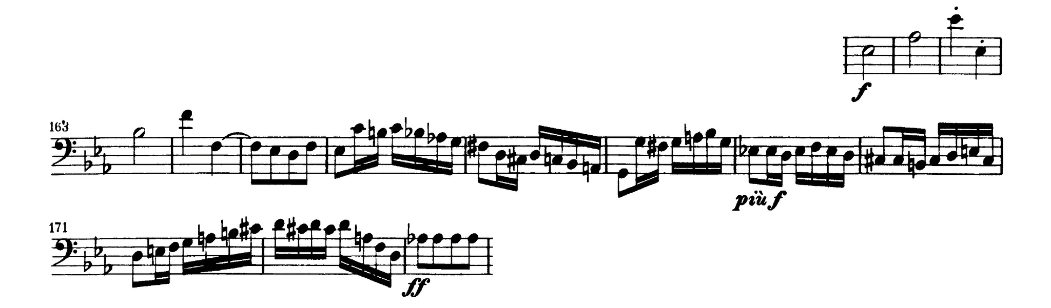 Perfect. All the notes are very well articulated and with a very clear pitch in the chromaticism. Good harmony support. The Viennese tuning is practical because it allows less movement of the hand and less shifting. However, the presence of the frets and the fast articulations made the movement a bit tiring to play for the left hand in the long run. We have to give extra articulations and extend the fingers to get power and clarity. My general comment about playing that movement and the 3rd symphony in general with the Viennese violone is that it works but requires a good technic of the instrument. |