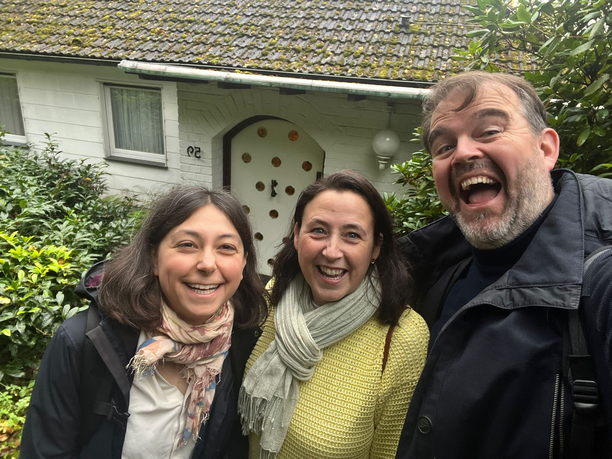 Maya Verlaak, Karin de Fleyt and Stijn Saveniers in front of the Stockhausen archive in Kürten, Germany, for a study day on the sketches and material of STOP.