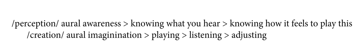 Note that they all need each other in order to be developed fully. During practice, there should be a continuous feedback loop of playing, listening and correcting oneself. The intimate knowledge of materials makes fast execution of those same materials much easier, and creates a higher level of knowledge, which is less cerebral and more connected to bodily knowledge and practice. In turn, this knowledge fortifies the aural imagination. One can speak here of internalization of musical materials. Improvisation is the catalyst for learning, and the ultimate measure for mastery of aural skills and the creation of musical ideas.