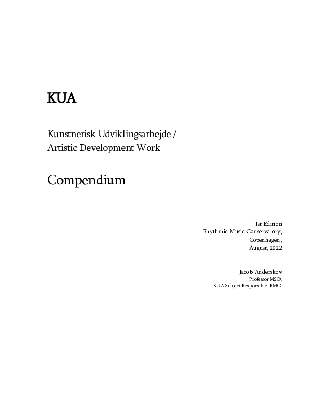 This compendium delves into the subject of the same name (KUA) offered in the Bachelor programme at the Danish Rhythmic Music Conservatory. The book provides readers with an in-depth understanding of the KUA subject, including its curriculum for the Bachelor programme in music performance and composition. Additionally, the book offers an overview of the various listening, feedback, and dialogue concepts and models used in the KUA class. The author also explores the importance of methodology and contextual reflection in artistic creation and education. The compendium also examines the quality criteria used to evaluate artistic work and the development of students. Furthermore, the book includes a list of recommended readings and advice on the design of curricula in higher music education, as well as on teaching and working modes.
